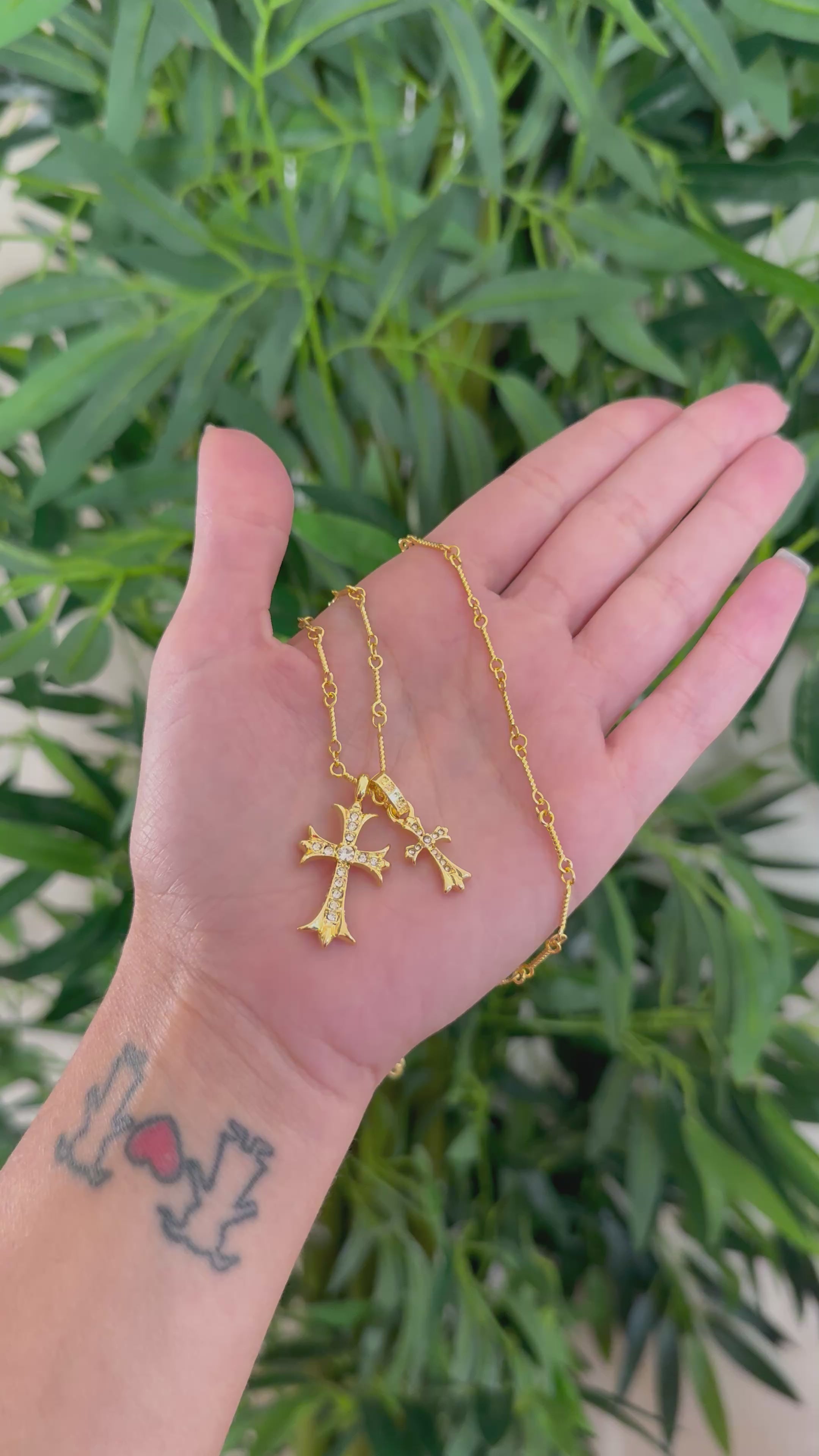 Collana in metallo dorato lucido con catena sottile a maglie lavorate e due pendenti a croce stile gotico, uno più grande e uno più piccolo, entrambi impreziositi da cristalli luminosi incastonati. Un gioiello elegante e d’impatto, perfetto per completare look raffinati o dare un tocco luxury agli outfit quotidiani.