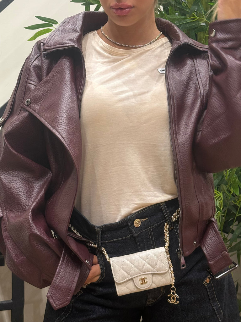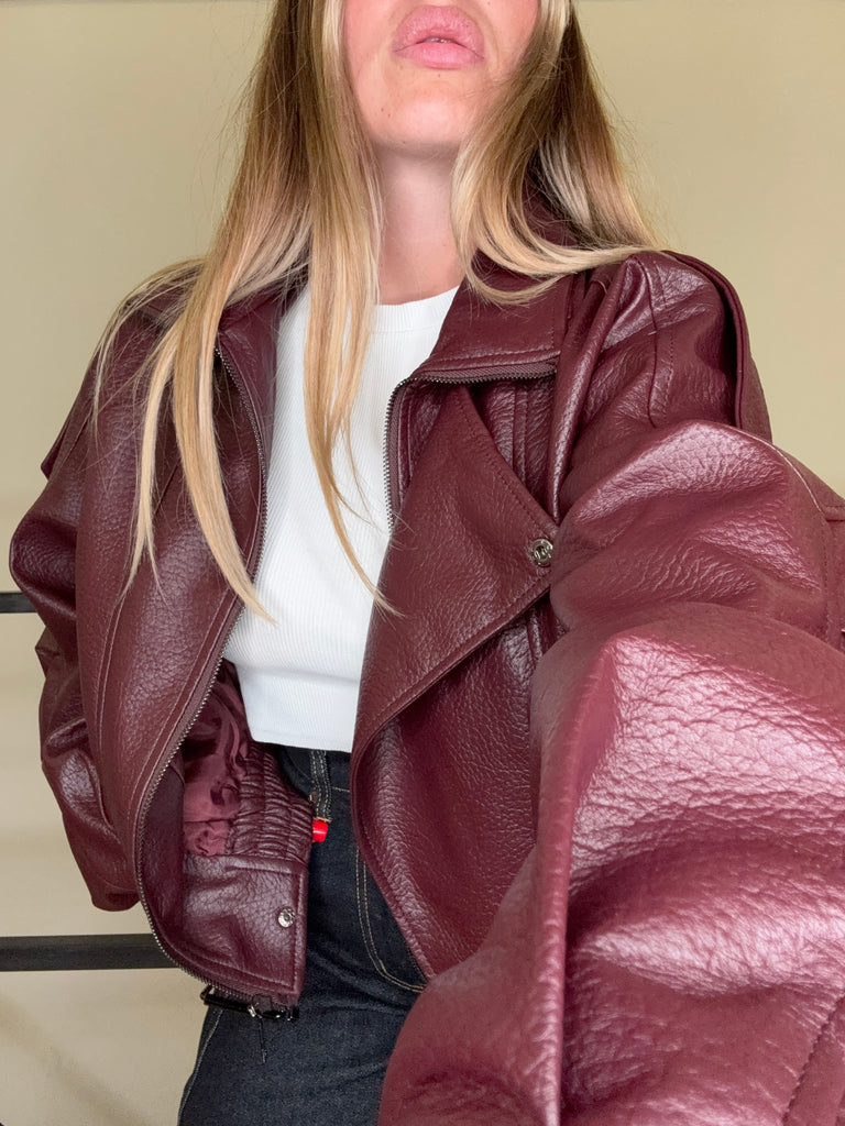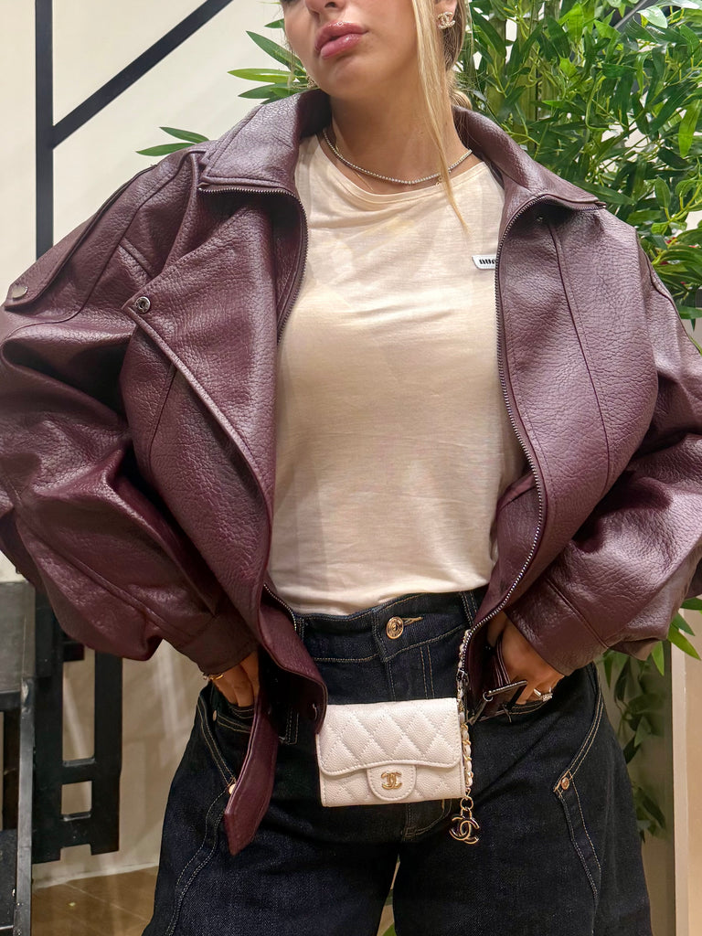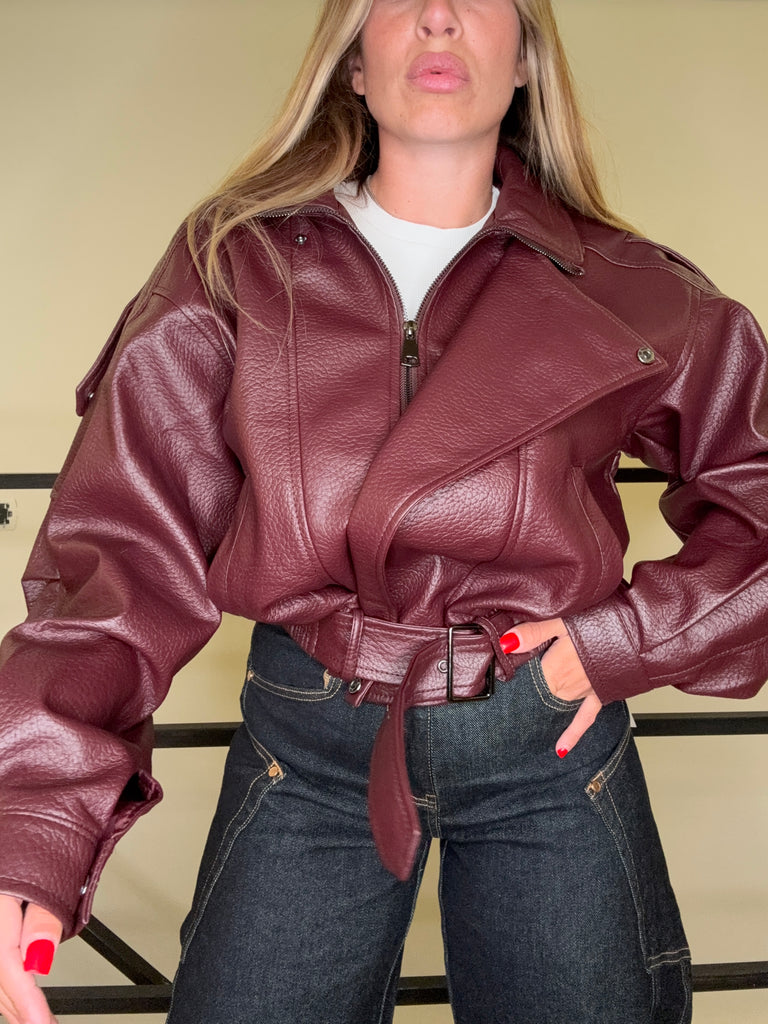 Bomber oversize in pelle martellata con doppio colletto e cintura in vita. Disponibile in due varianti colore: vino intenso e nero profondo. Un capo dal carattere deciso e senza tempo