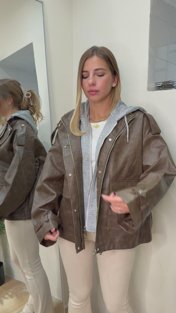 Biker oversize in pelle con cappuccio interno pelpato assemblato, che unisce grinta e comfort in un unico capo. Linee moderne e silhouette ampia per un look urbano e contemporaneo, perfetto da indossare sopra outfit minimal o layering streetwear.