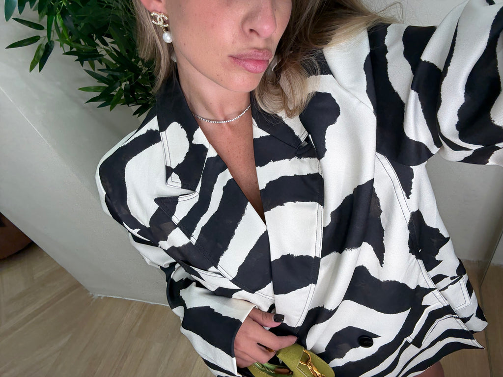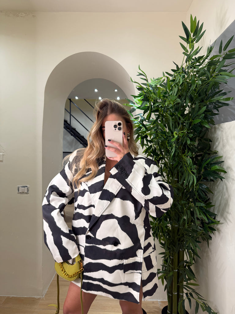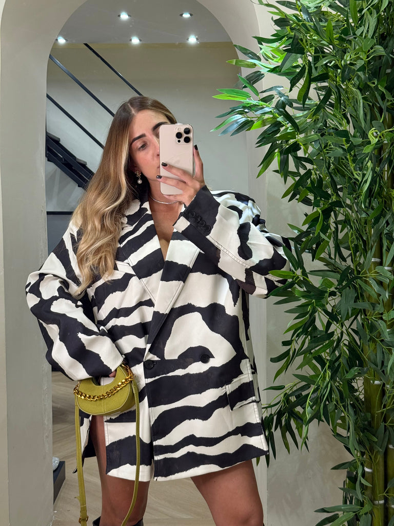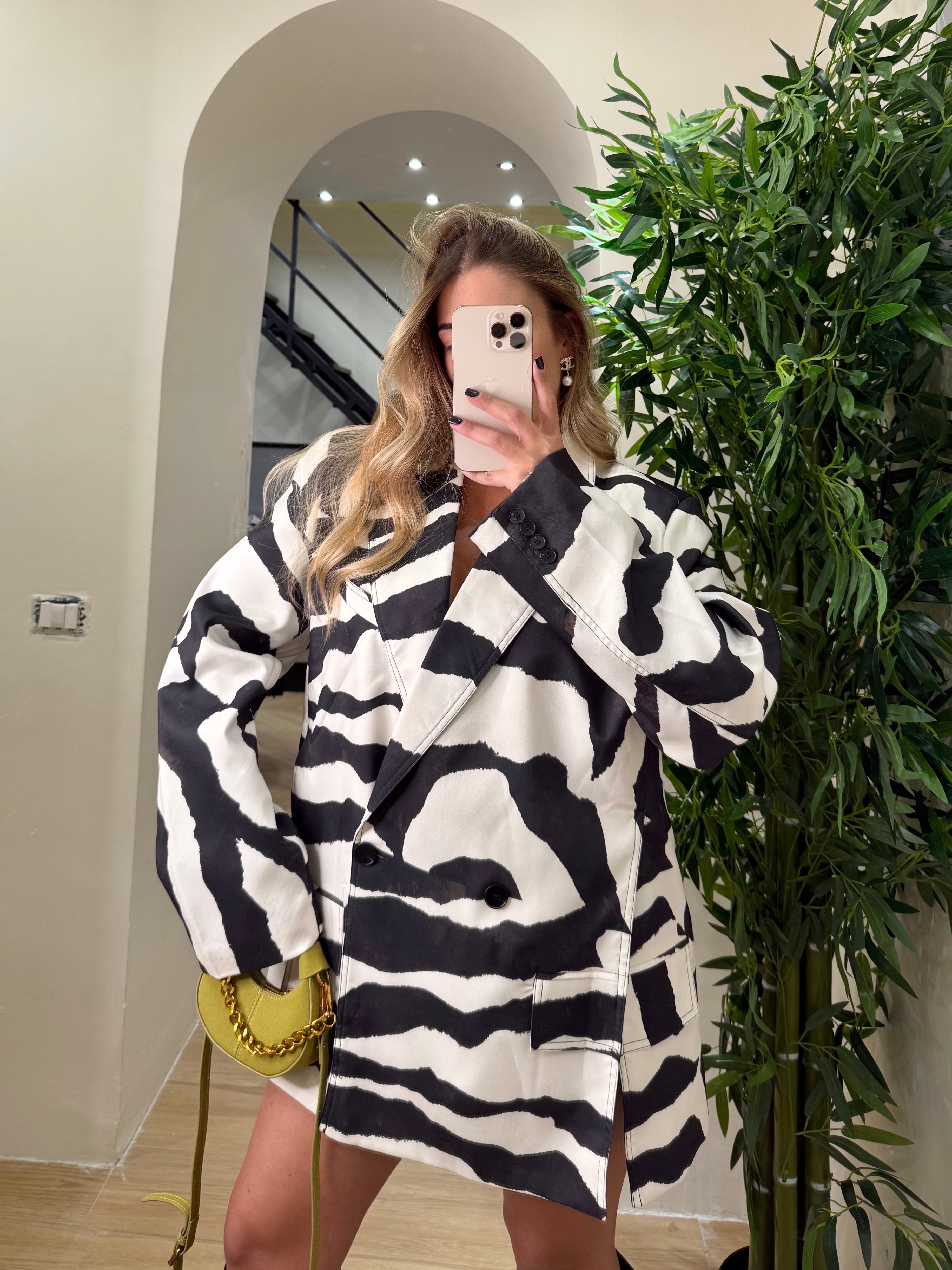 Blazer oversize in tessuto zebrato luxury, con spalline imbottite e taglio strutturato che dona carattere e presenza. Le linee decise e la stampa animalier creano un look audace, perfetto per chi vuole farsi notare.