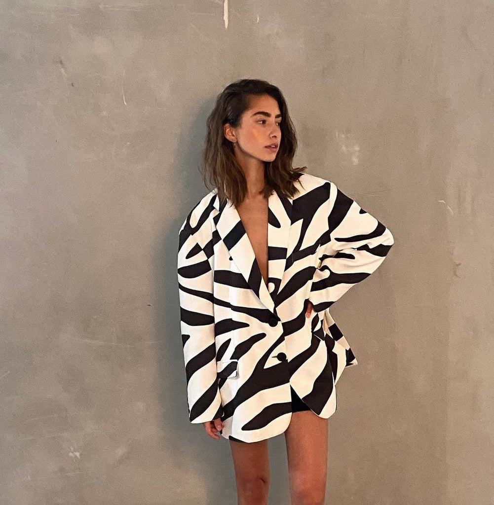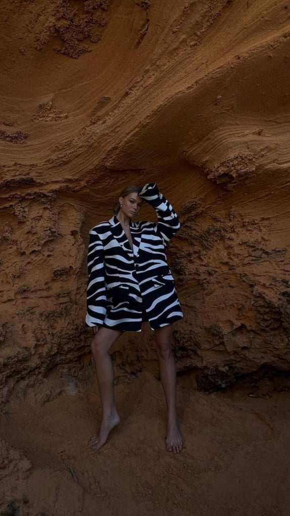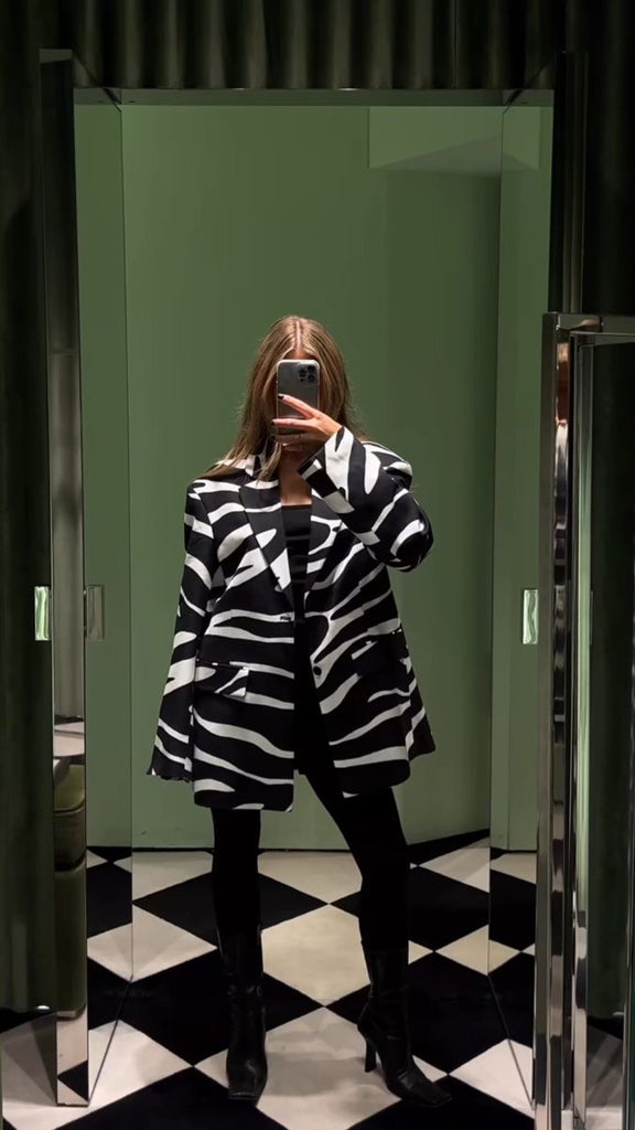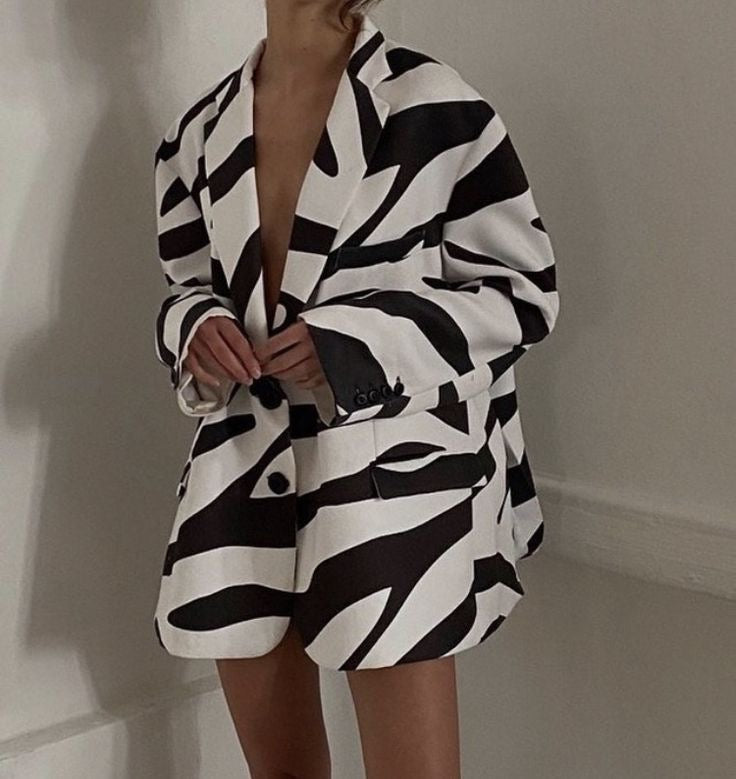 Blazer oversize in tessuto zebrato luxury, con spalline imbottite e taglio strutturato che dona carattere e presenza. Le linee decise e la stampa animalier creano un look audace, perfetto per chi vuole farsi notare.
