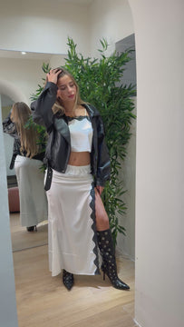 Coordinato in satin dal fascino sensuale ed elegante, composto da longuette a vita alta con spacco laterale e top corto con delicati inserti in pizzo. Un look che gioca con i contrasti di luce e trasparenze, perfetto per serate sofisticate e momenti speciali.