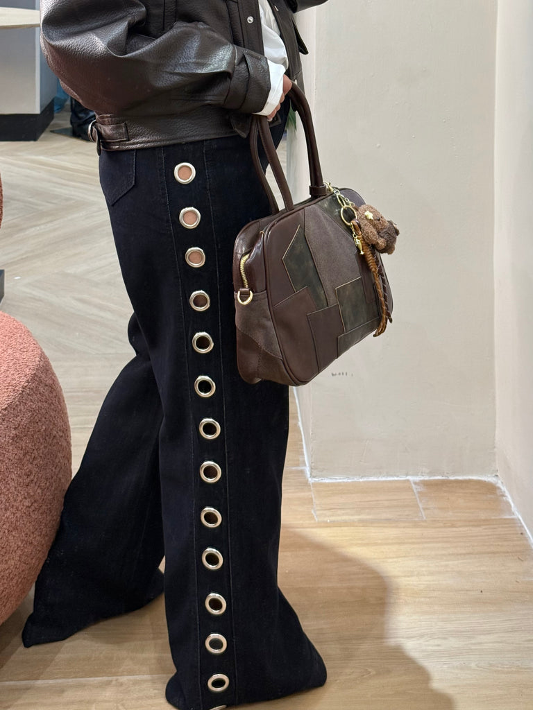 Jeans oversize con lavaggio blu notte e borchie argentate giganti sui lati. Design audace e originale per un look ribelle e personale. Vero must-have per chi cerca di esprimere la propria personalità con stile."