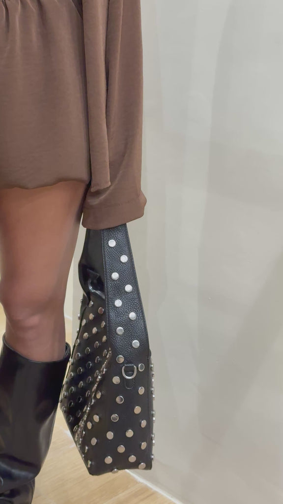 Una borsa che non passa inosservata. La “Punk Sac” è un modello a sacco in ecopelle morbida, dal design unico e originale, interamente ricoperta da borchie giganti che ne esaltano il carattere audace e contemporaneo.