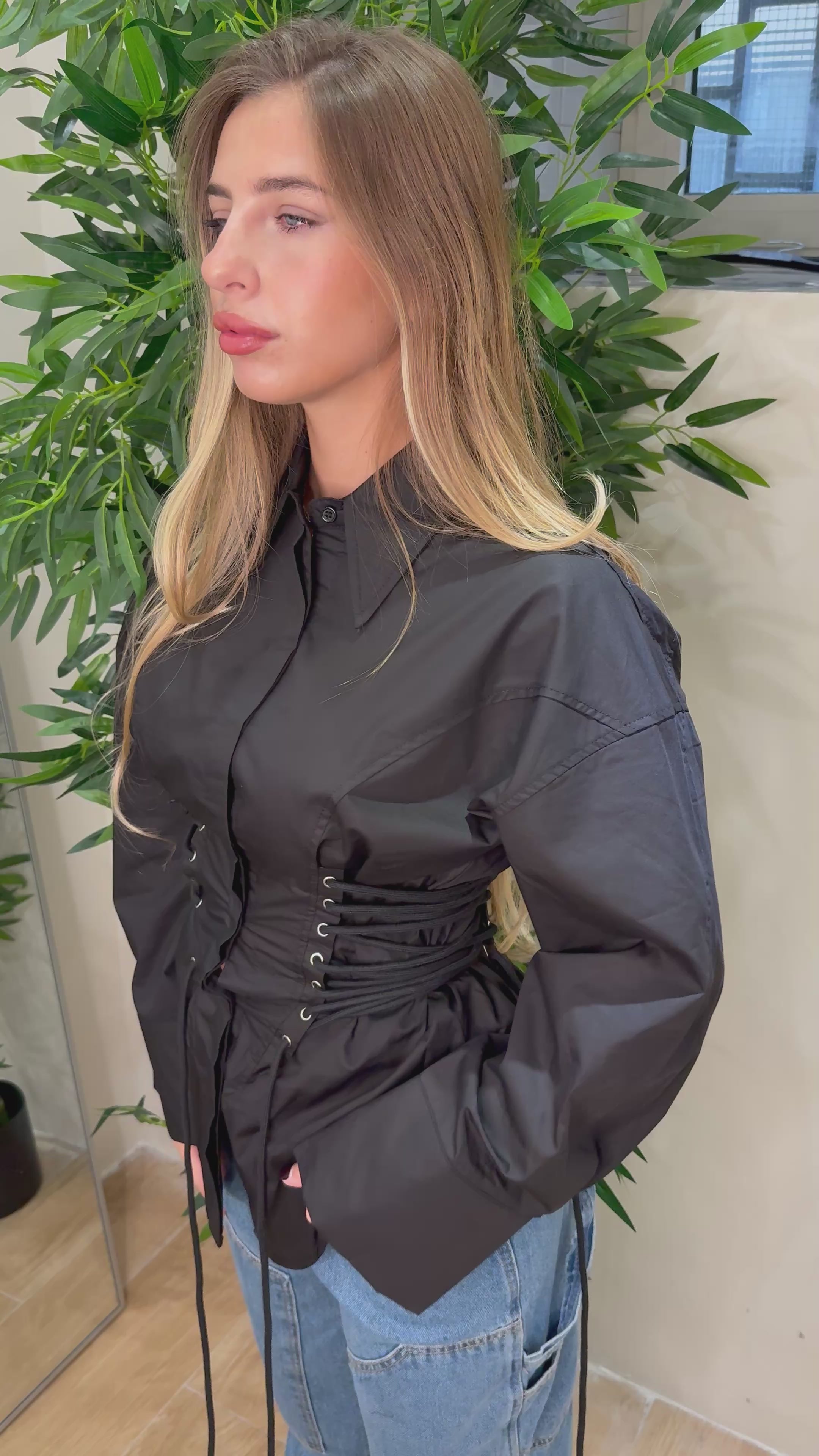 Camicia in popeline leggera con effetto bustino e lacci stringati in vita, pensata per valorizzare la silhouette. Linee pulite e dettagli femminili si incontrano in un capo sofisticato, perfetto da indossare sia con pantaloni minimal sia con gonne per un look chic contemporaneo.