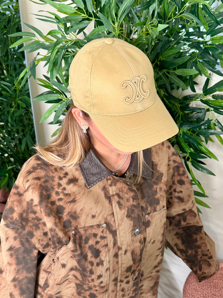 Baseball cap in tessuto color cammello con visiera curva e maxi logo ricamato tono su tono sul frontale. Un accessorio minimal e sofisticato che abbina il comfort sportivo al dettaglio ricercato del ricamo, perfetto per completare look casual-chic.