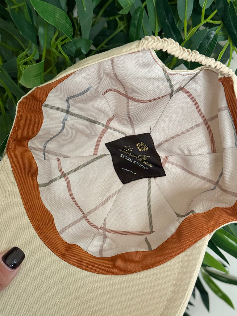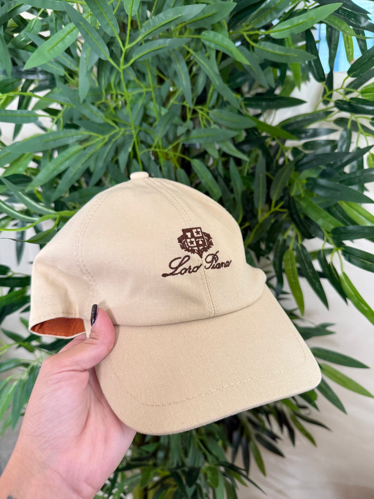 Cappello in cotone beige cappuccino con visiera curva e logo ricamato tono marrone sul frontale, caratterizzato da stemma araldico e scritta “Lord Piana”. Un accessorio casual e raffinato che unisce stile sportivo e dettagli heritage, perfetto per completare look streetwear o outfit più ricercati.