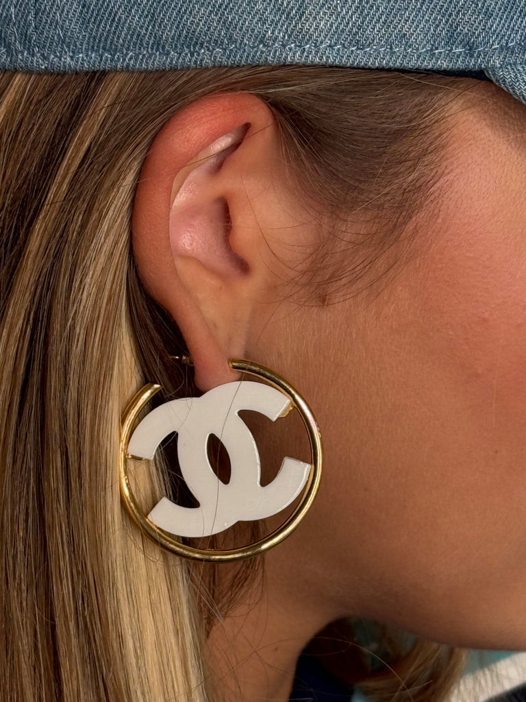Orecchini a cerchio oversize in metallo dorato con maxi logo centrale color avorio. Un design scenografico e contemporaneo che mixa la forma classica del cerchio con il dettaglio iconico del logo, perfetto per dare carattere e luce a qualsiasi outfit.