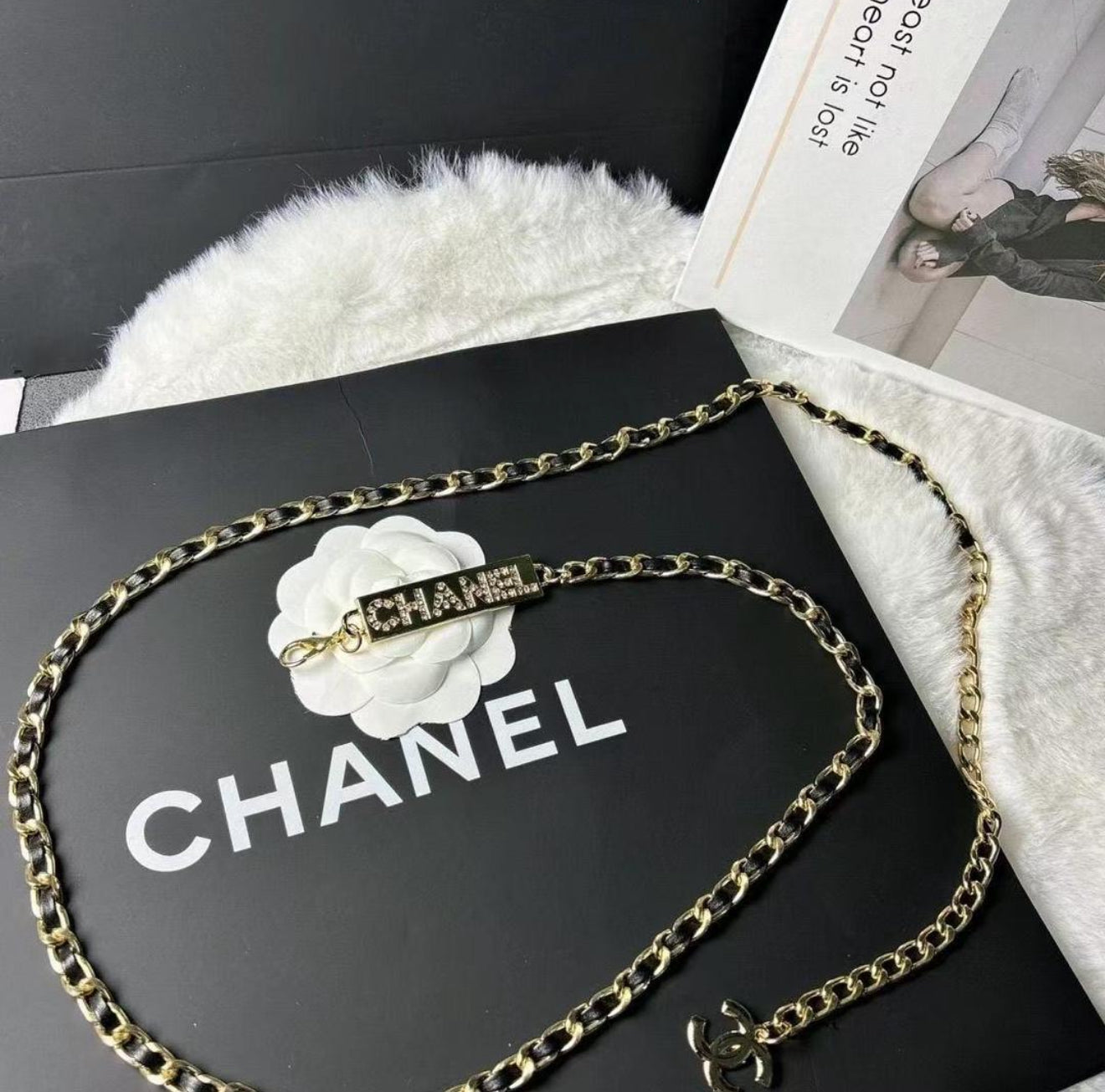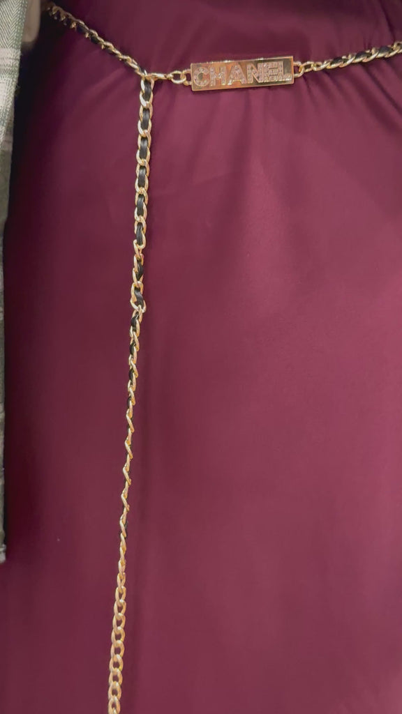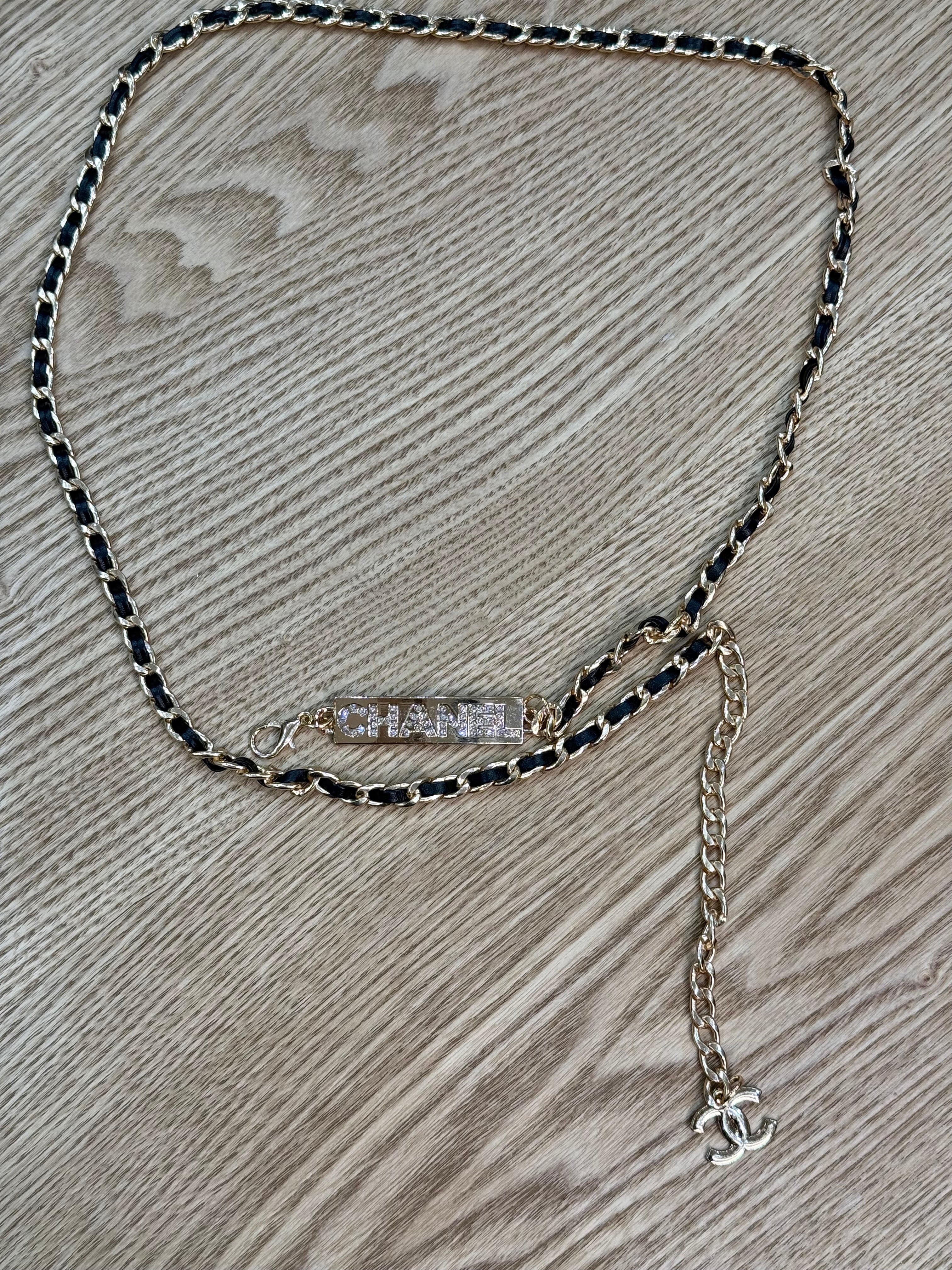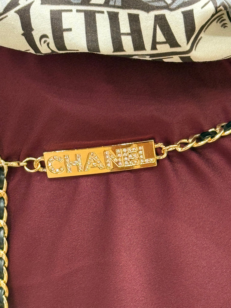 “Cintura catena in stile gioiello con intreccio in pelle nera e metallo dorato, impreziosita da una targhetta rettangolare tempestata di cristalli che formano la scritta decorativa ‘CHANEL’ e ciondolo finale con doppia C pendente. Un accessorio iconico e versatile, perfetto per dare un tocco sofisticato e di carattere a blazer, abiti o pantaloni.”