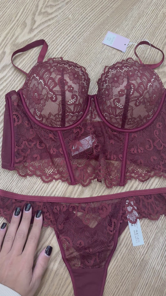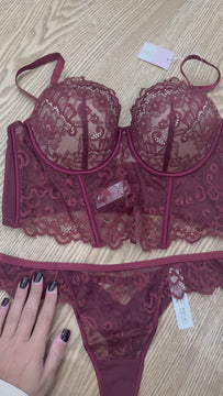 Éclipse" è un completino intimo che unisce forza e fascino in un equilibrio perfetto di forme e dettagli. Il top, strutturato come un corsetto leggero, è realizzato in un profondo bordeaux cremisi, con coppe leggermente rigide che sostengono e scolpiscono il décolleté. I ricami floreali si intrecciano sul tessuto, creando un disegno sottile ma seducente, che cattura la luce nei punti giusti.