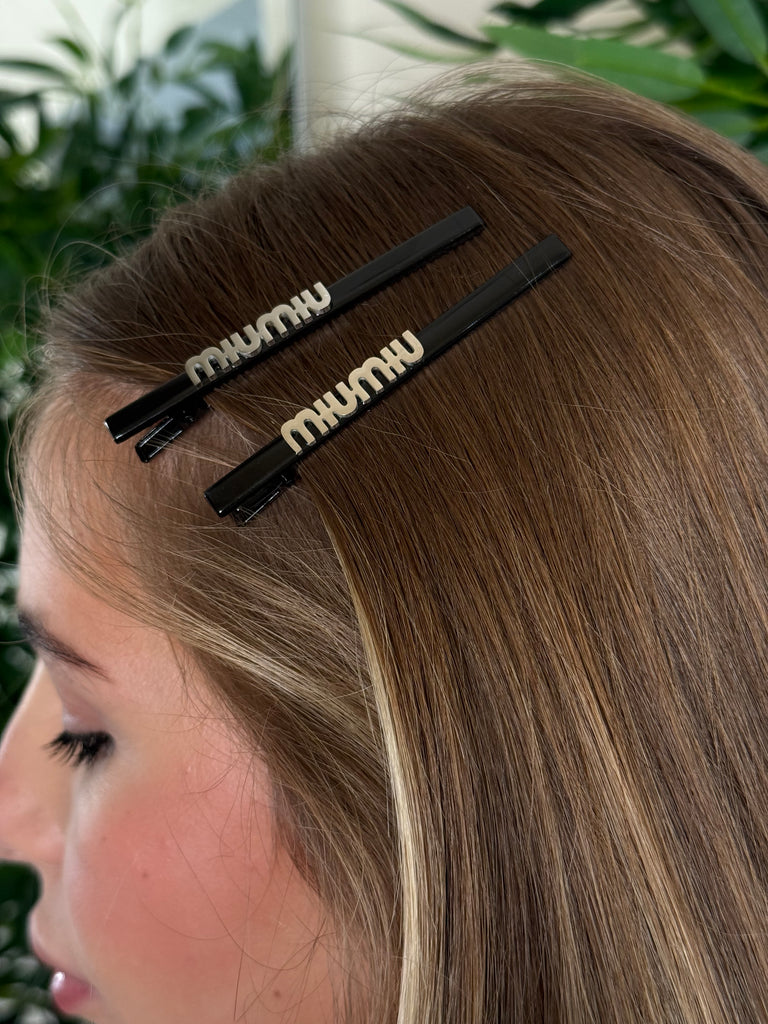 Set di due mollette per capelli in metallo nero lucido con dettaglio lettering color avorio che richiama lo stile logomania. Design minimal e lineare, perfetto per fissare ciocche frontali o impreziosire acconciature con un tocco sofisticato e contemporaneo. Ideali sia per look quotidiani che per dare un accento fashion alle pettinature più semplici.