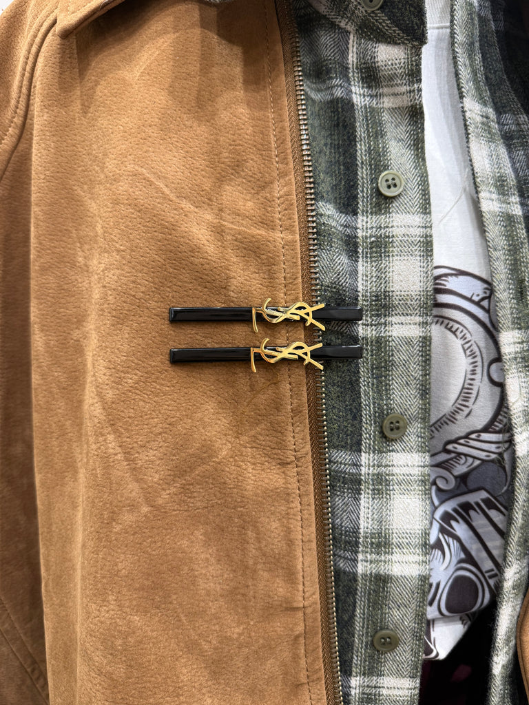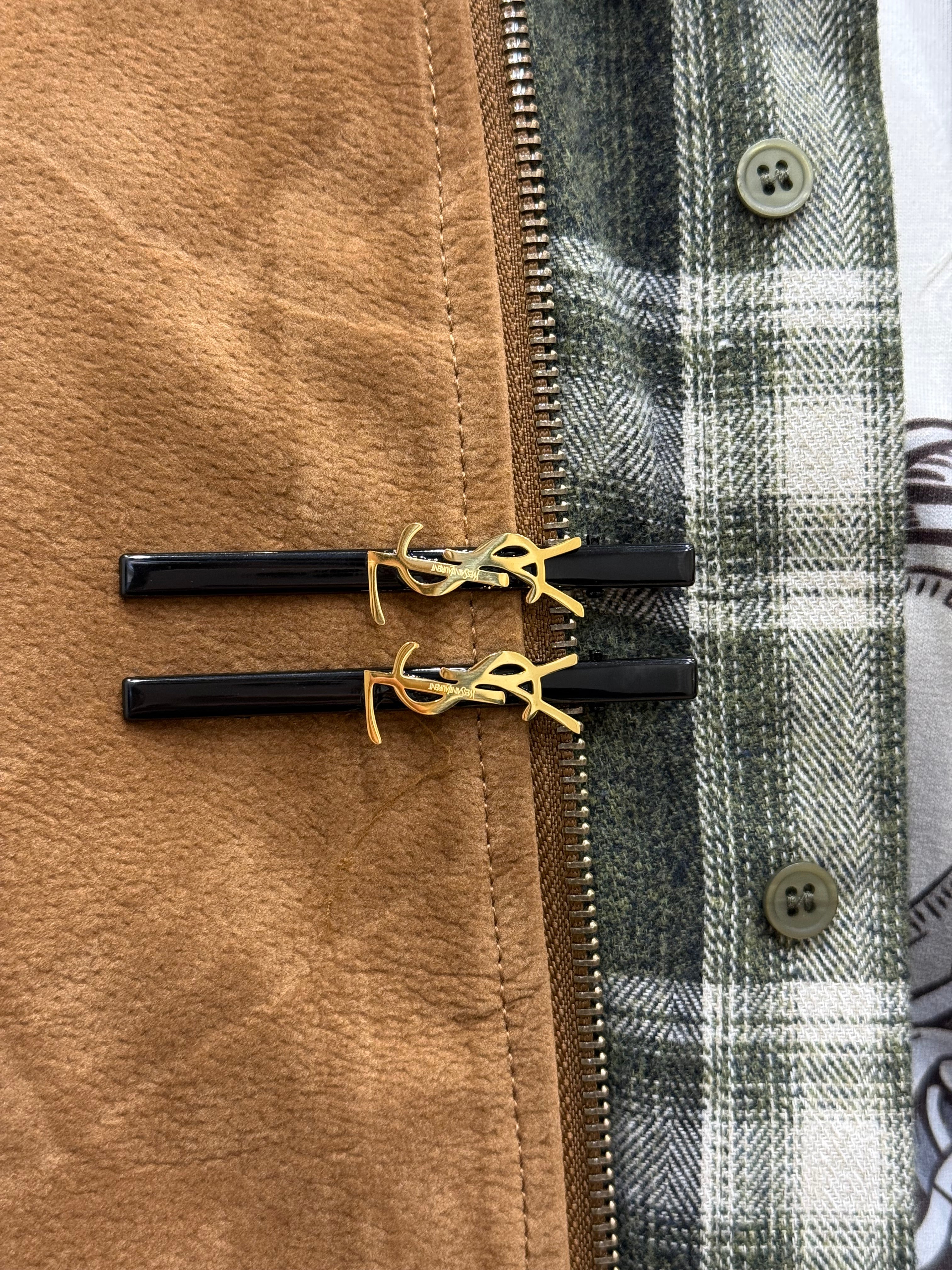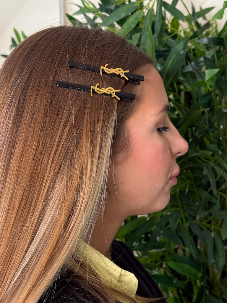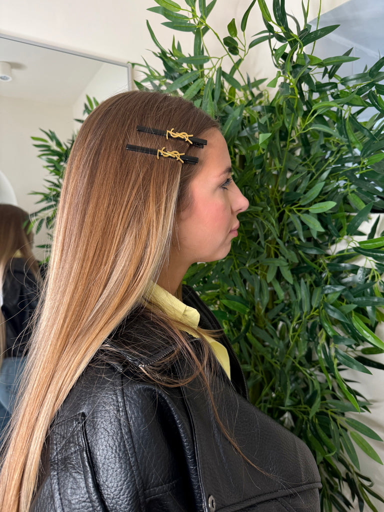 Coppia di mollette per capelli dal design lineare con barra nera lucida e dettaglio decorativo in metallo dorato a forma di logo intrecciato. Un accessorio elegante e contemporaneo, ideale per fissare ciocche con discrezione ma con un tocco luxury. Perfette da sole o abbinate per creare acconciature chic.