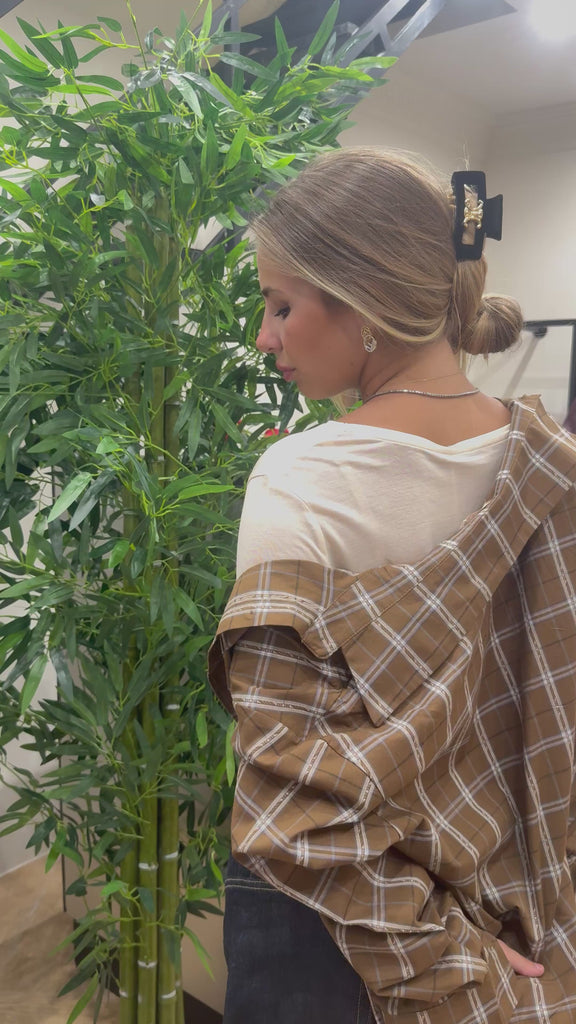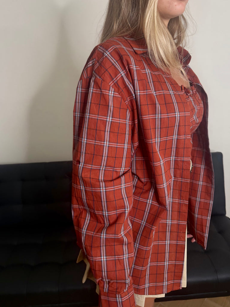 Completo in cotone con top e camicia oversize a fantasia quadri. Linea ampia con spalline imbottite per un look deciso. Disponibile in marrone e bordeaux