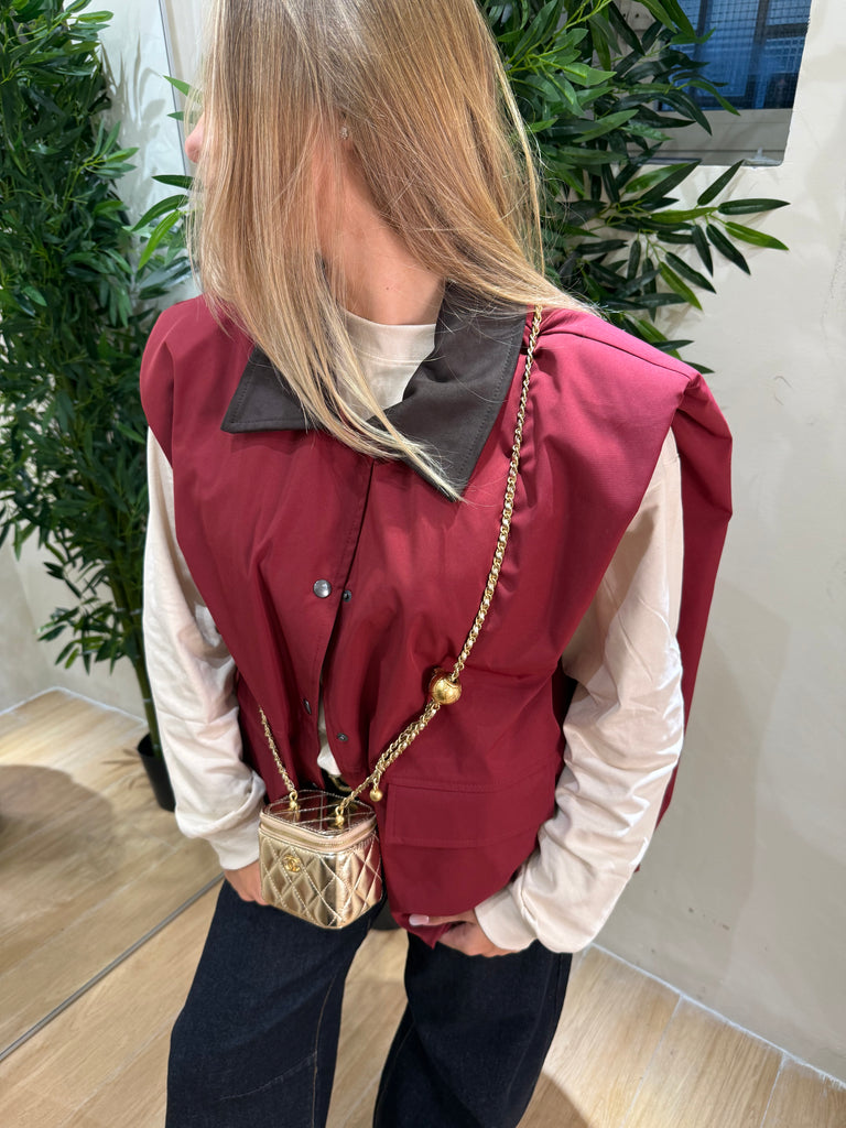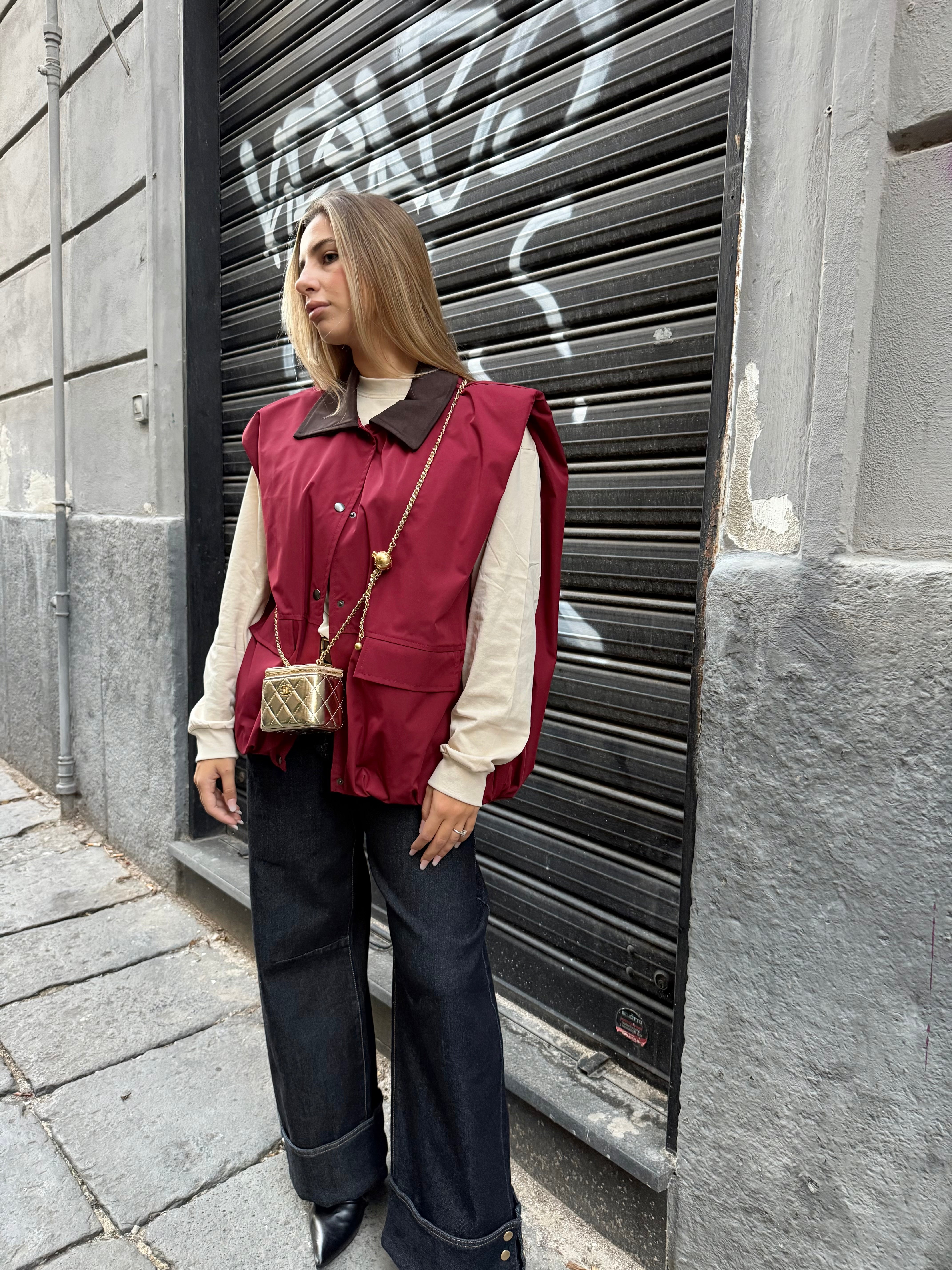 Crimson Bolt di Lumina è il giubbino smanicato over bomber che colpisce come un fulmine rosso. Il bordeaux intenso diventa un’esplosione di energia, mentre il colletto oversize avvolge il collo in un caldo abbraccio da vera armatura urbana.