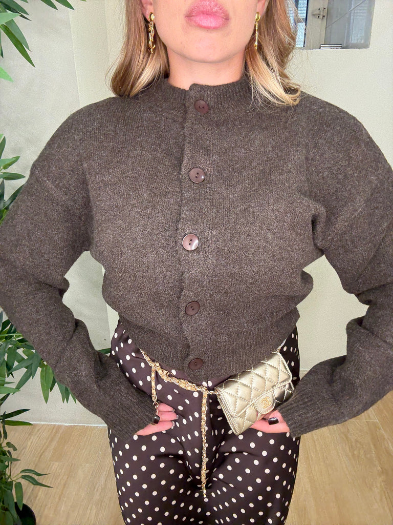 è un maglioncino corto, morbidissimo al tatto, come una carezza di velluto e una nuvola insieme. Realizzato in un filato misto alpaca e cotone organico, è leggerissimo ma caldo, perfetto per le mezze stagioni o per dare un tocco cozy anche a una serata fuori.