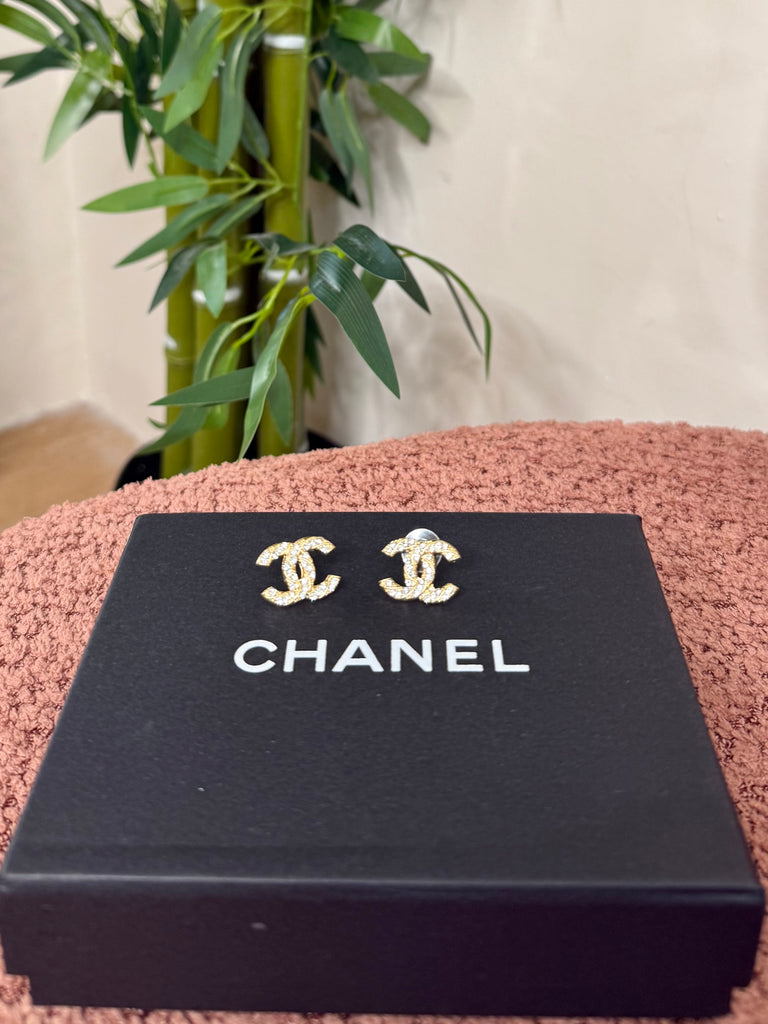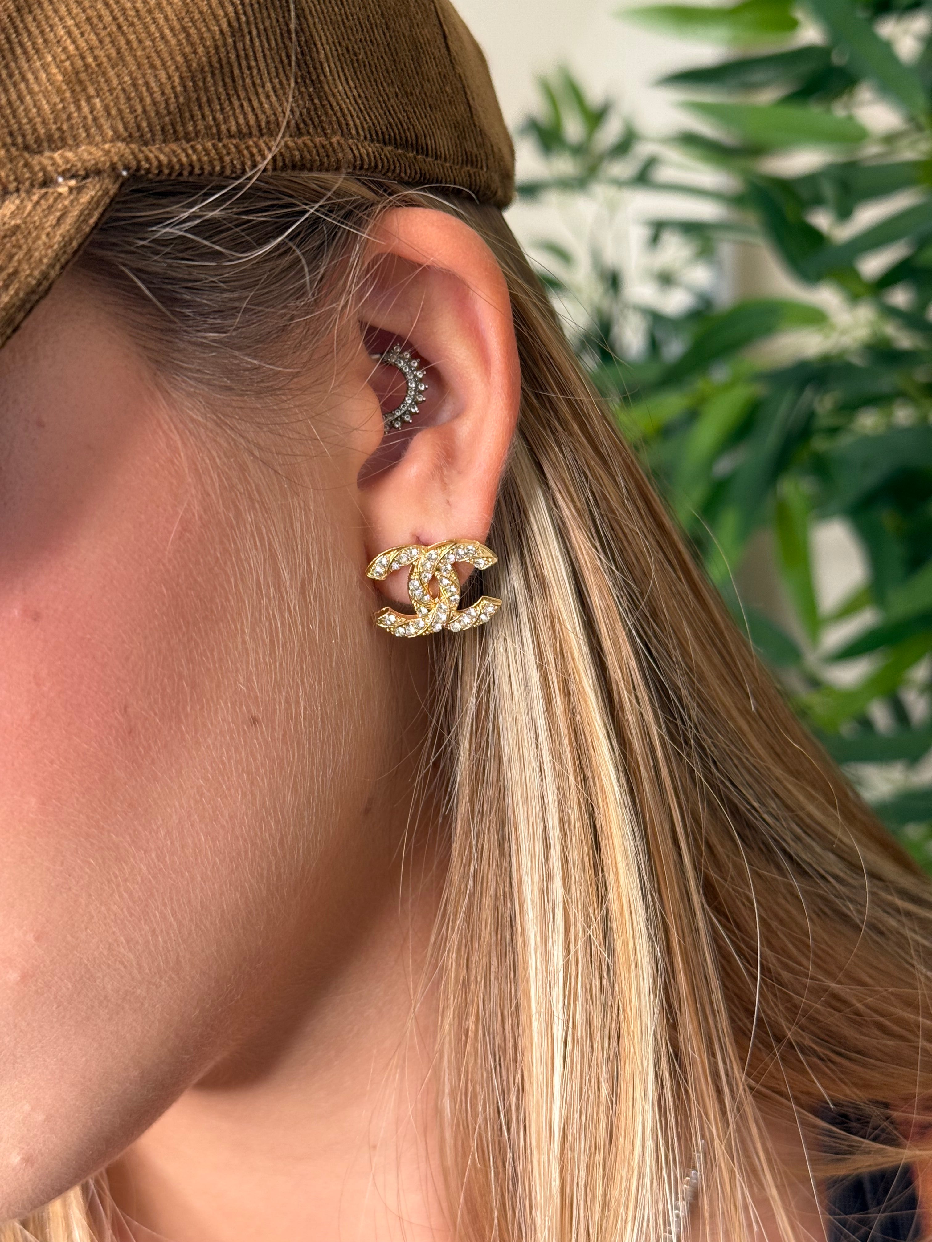 Orecchini a lobo dalla silhouette a doppia C intrecciata in metallo dorato, interamente ricoperti di micro-cristalli luminosi. Un bijoux elegante e statement che cattura la luce e aggiunge immediatamente un tocco luxury e sofisticato a qualsiasi look, dal casual chic alla sera.