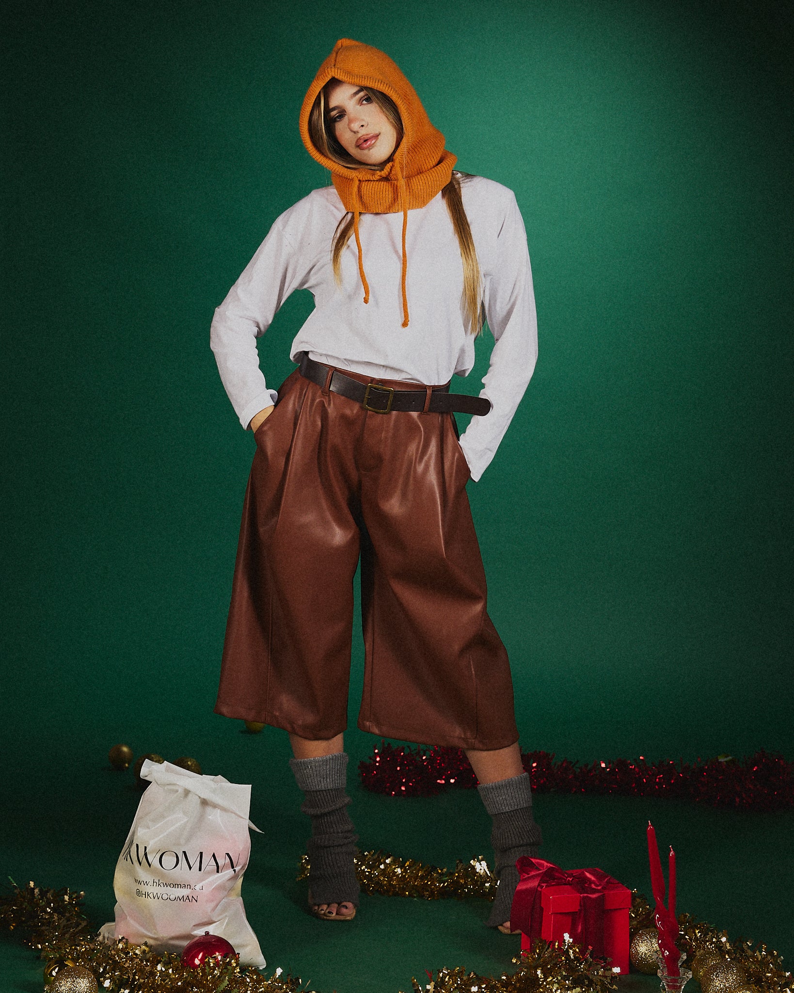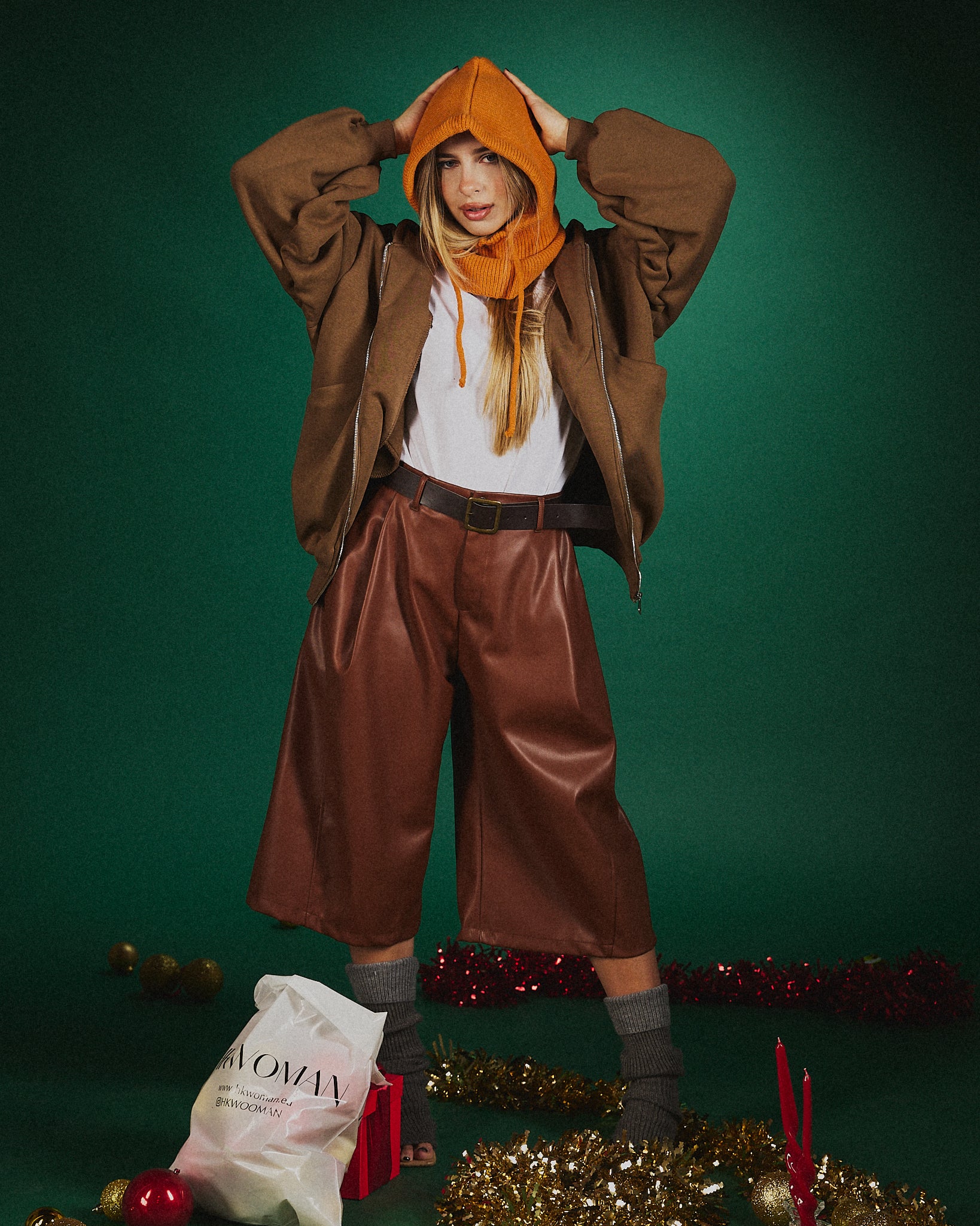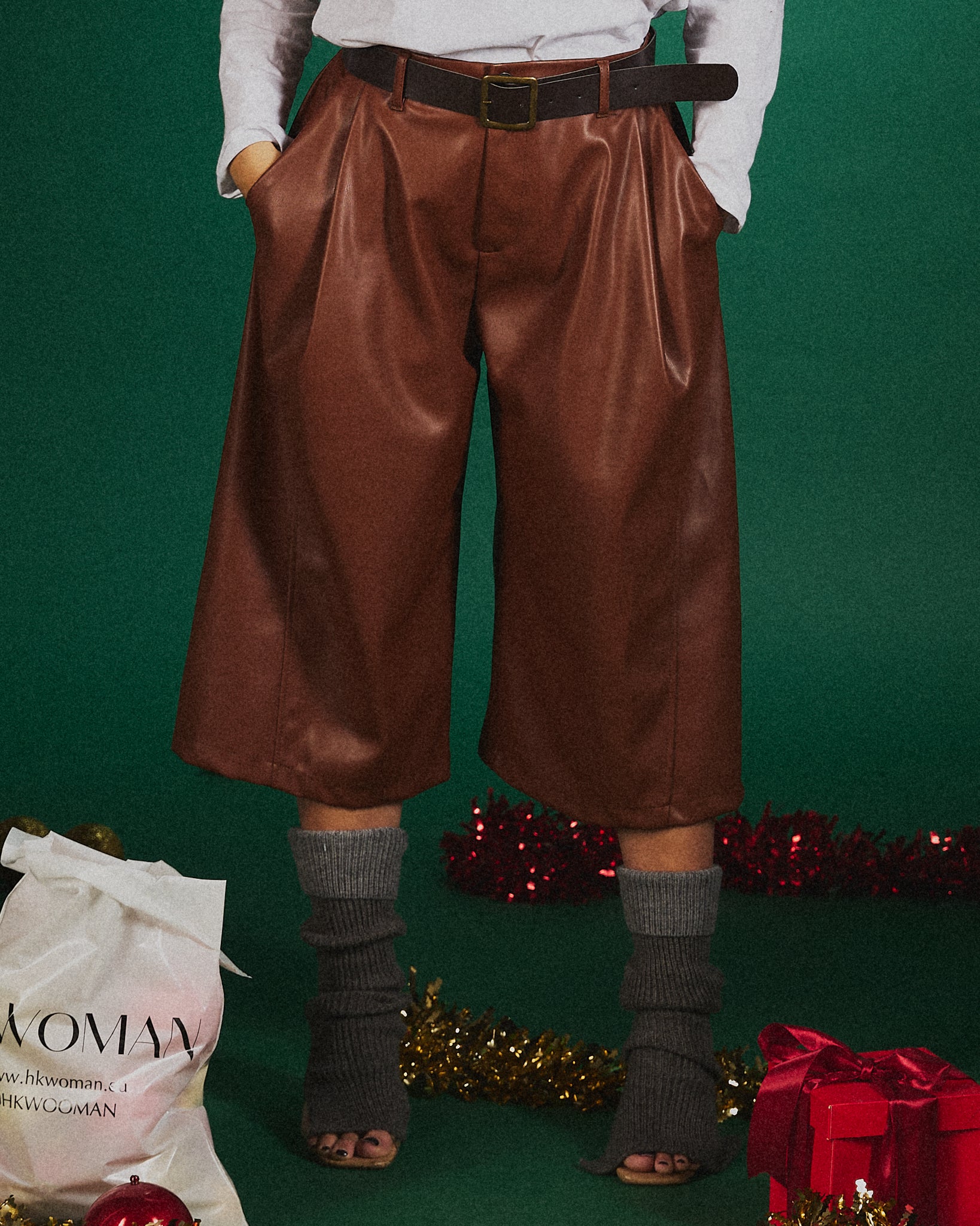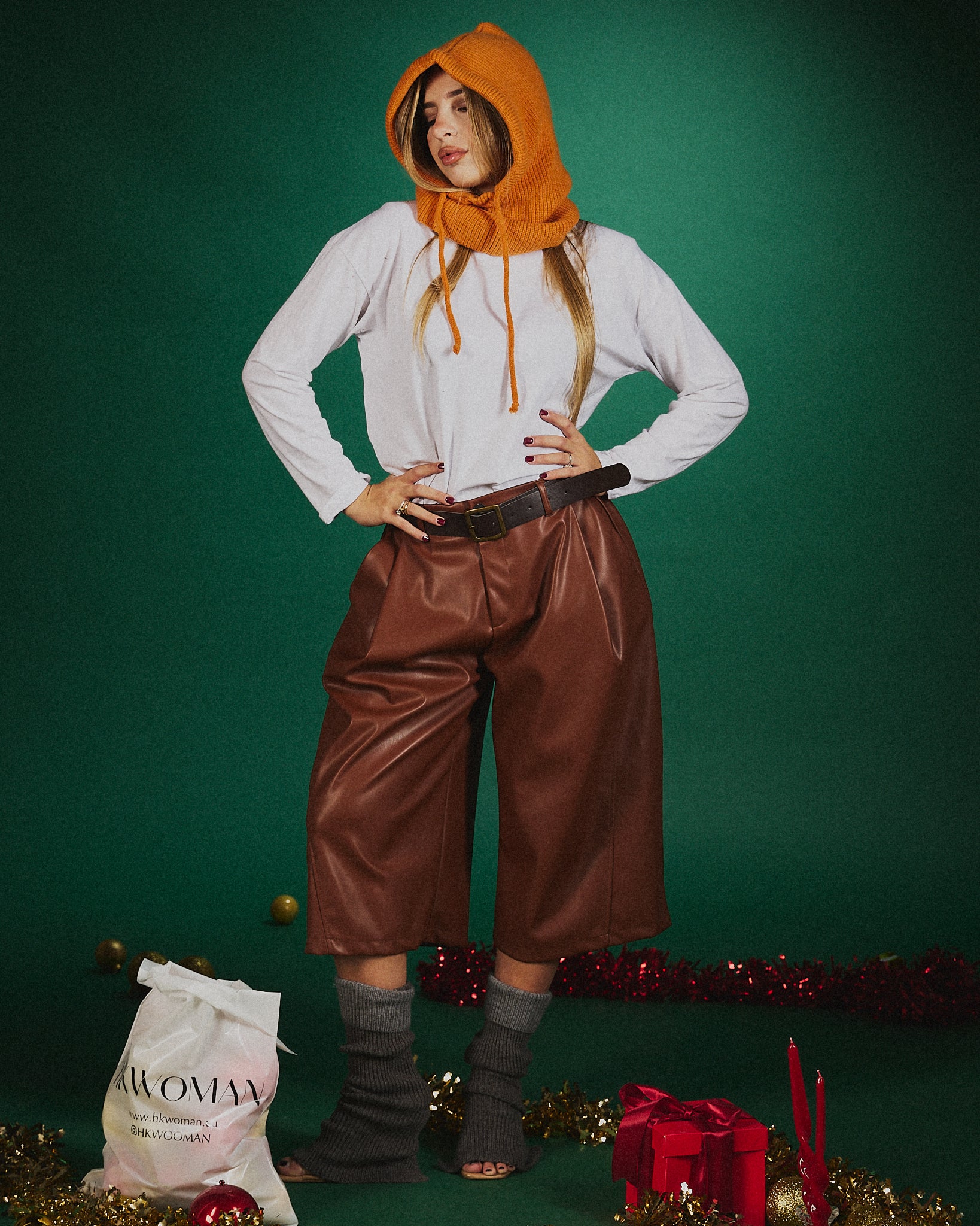 Bermuda in eco-pelle con cintura inclusa, dal taglio ampio e sartoriale. La vita definita, le pinces frontali e la lunghezza midi creano una silhouette moderna e strutturata, perfetta per look chic e contemporanei.