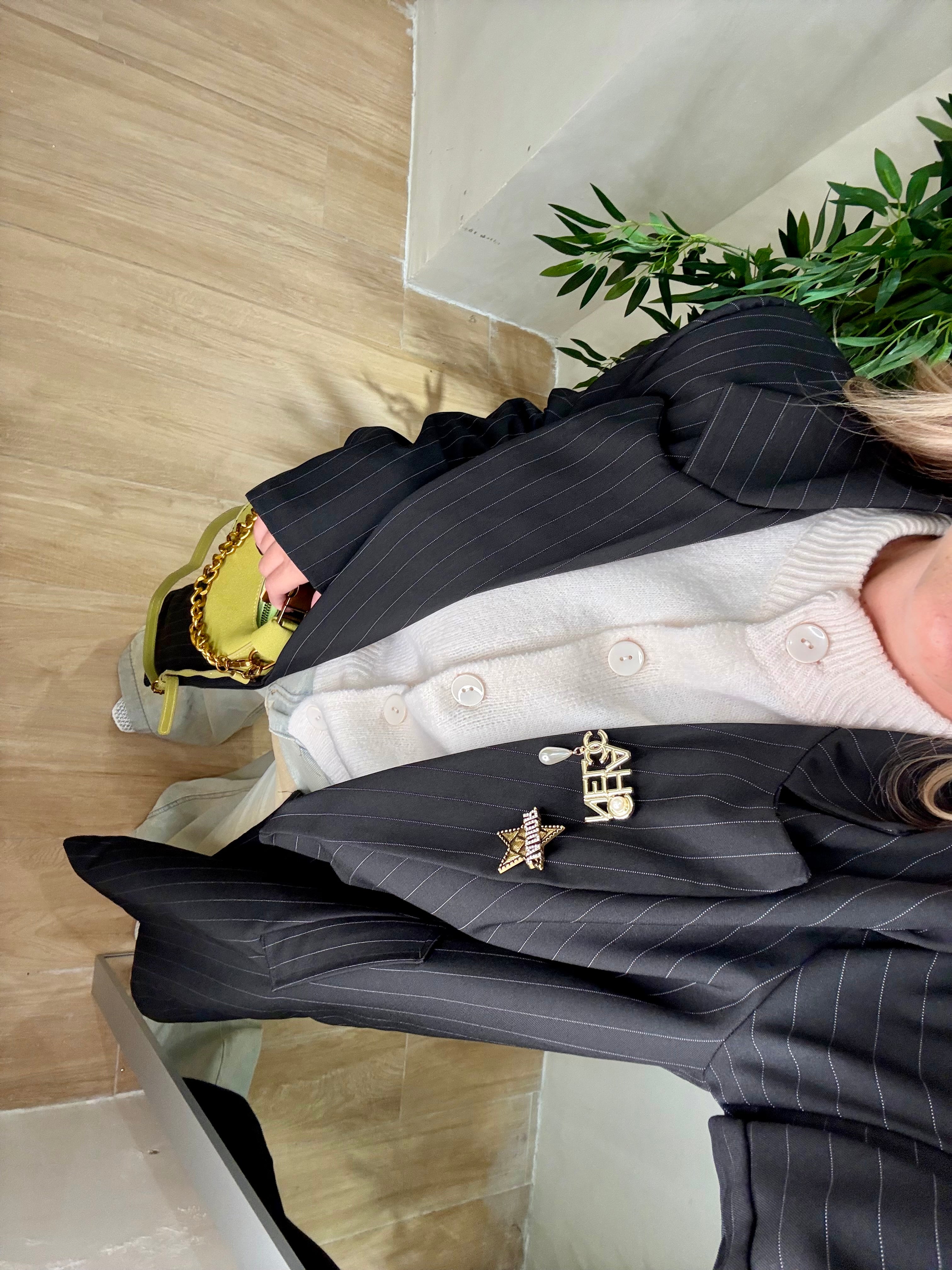 Blazer nero gessato con un design classico e sofisticato, caratterizzato da una lunghezza extra-long che crea un impatto visivo unico. Perfetto per aggiungere un tocco di stile e autorità al tuo outfit, ideale per occasioni formali o per chi cerca di fare una dichiarazione di moda."