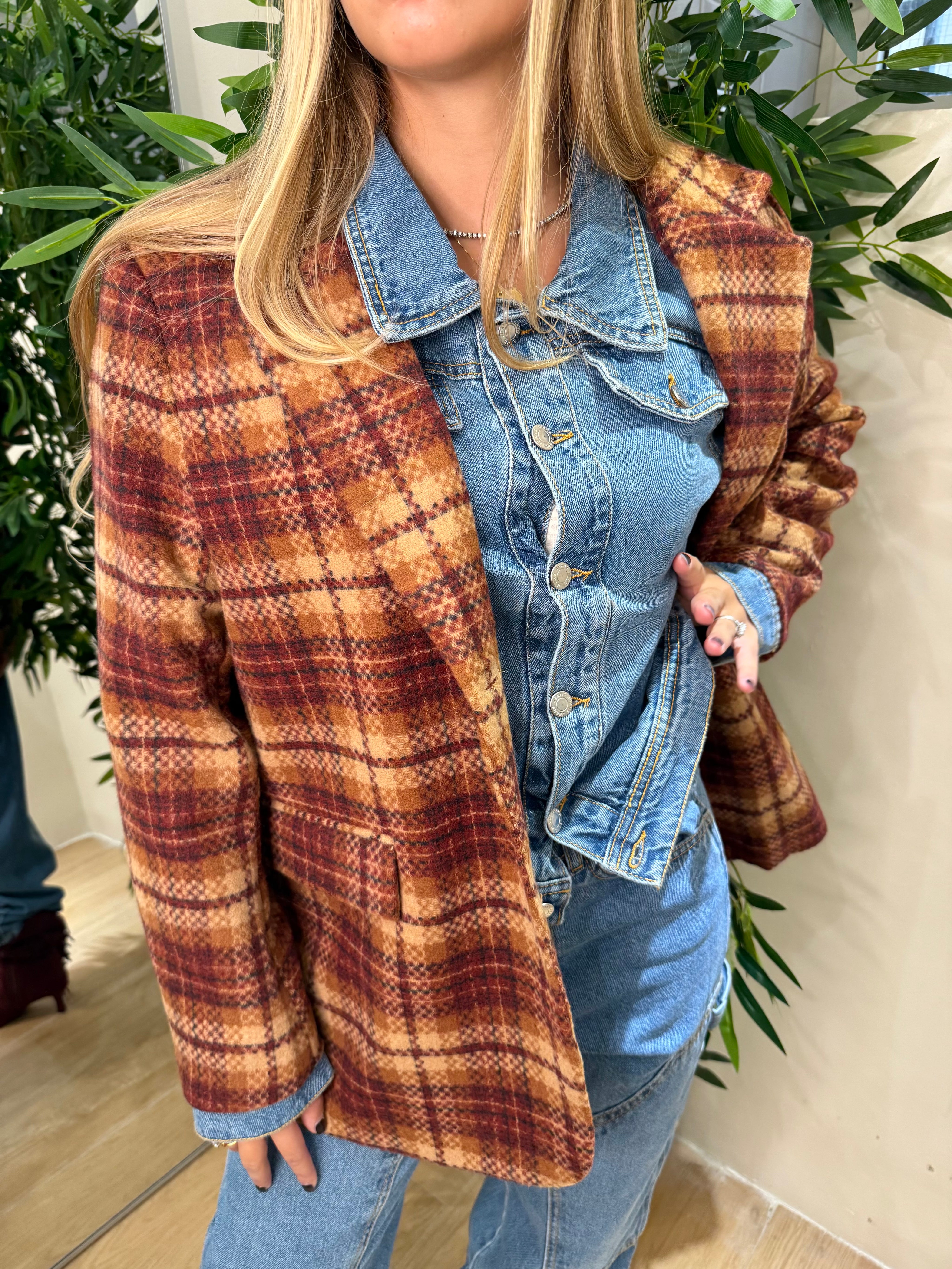 Blazer oversize vintage in lana pettinata, motivo a quadri “Prince of Wales” grigio e nero/anthracite con sottili linee beige. Spalle accentuate con imbottitura interna rigida, rever larghi e doppiopetto, con 2 bottoni frontali. Manica lunga con spalle cadenti che amplificano l’effetto oversize, lunghezza che arriva sotto i fianchi. Fodera interna in cupro o viscosa, tasche con pattina frontali, taschino al petto. Cuciture sartoriali, finiture a mano, bottoni in corozo o madreperla. Taglio strutturato ma confortevole, adatto sia abbinato casual (jeans, maglioni) sia indossato come dettaglio strong su outfit raffinati.