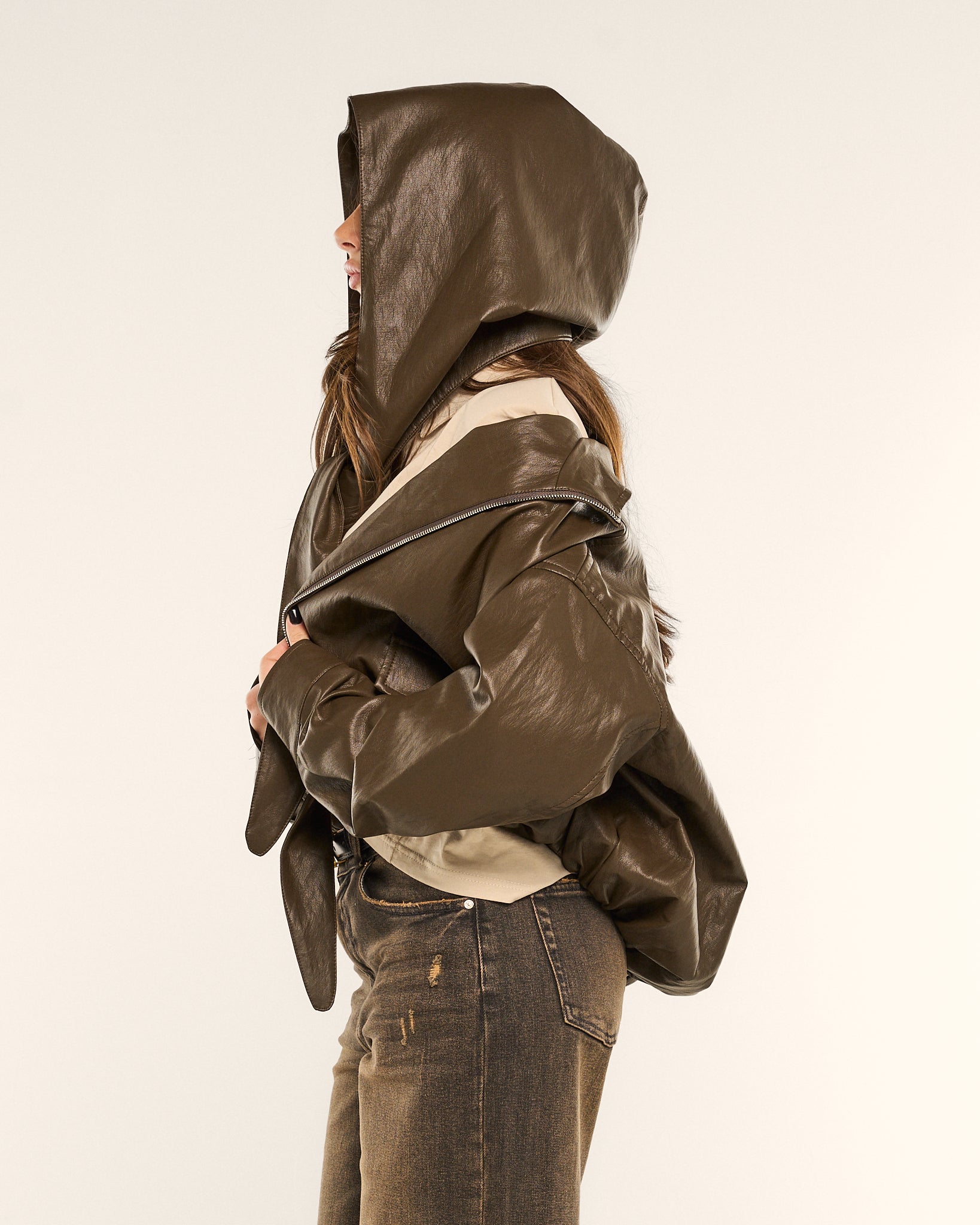 Una fascia in pelle coordinata con cappuccio integrato, removibile, da indossare come foulard o come hood strutturato.