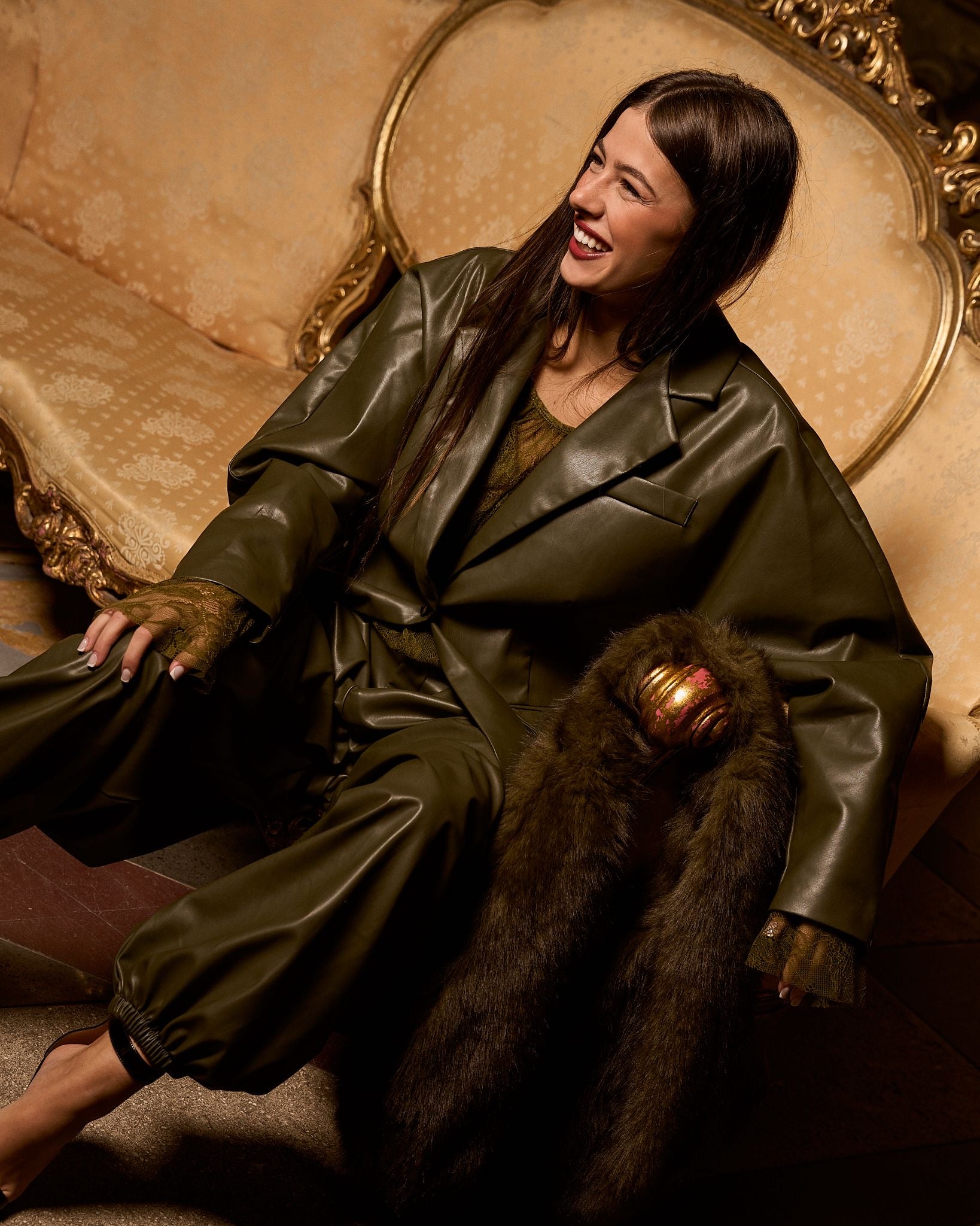 Il colore cachi, profondo e sofisticato, aggiunge un carattere contemporaneo e versatile: una tonalità neutra ma originale, facile da abbinare e ideale per look autunnali e invernali.