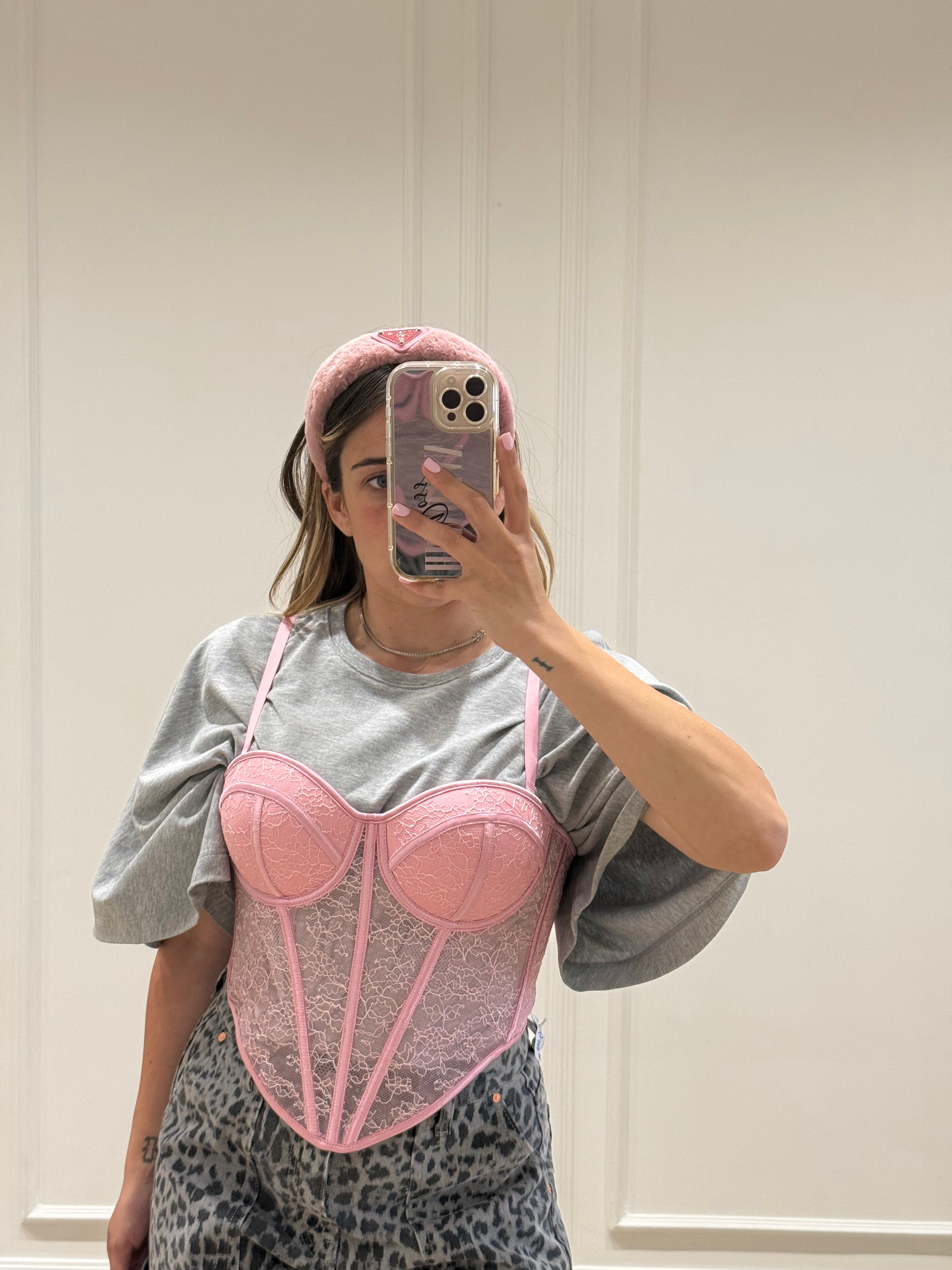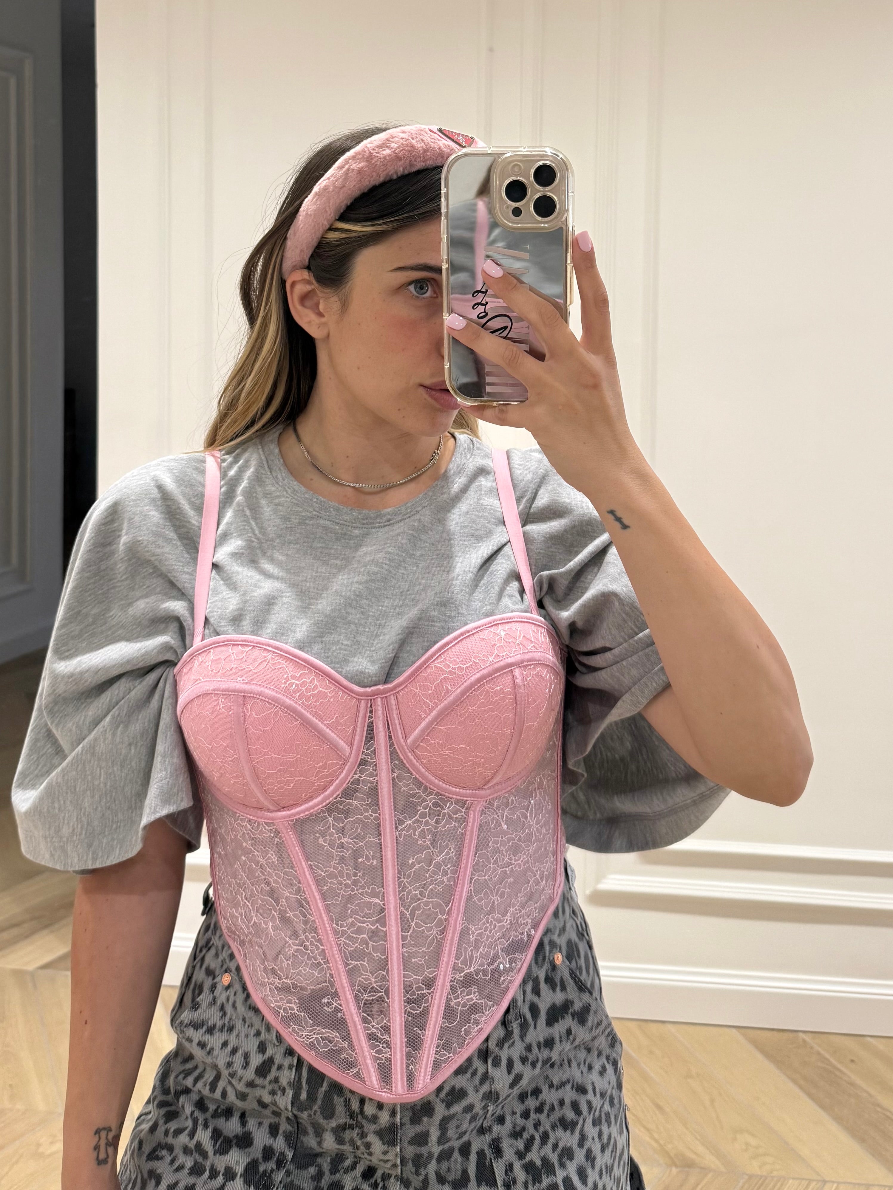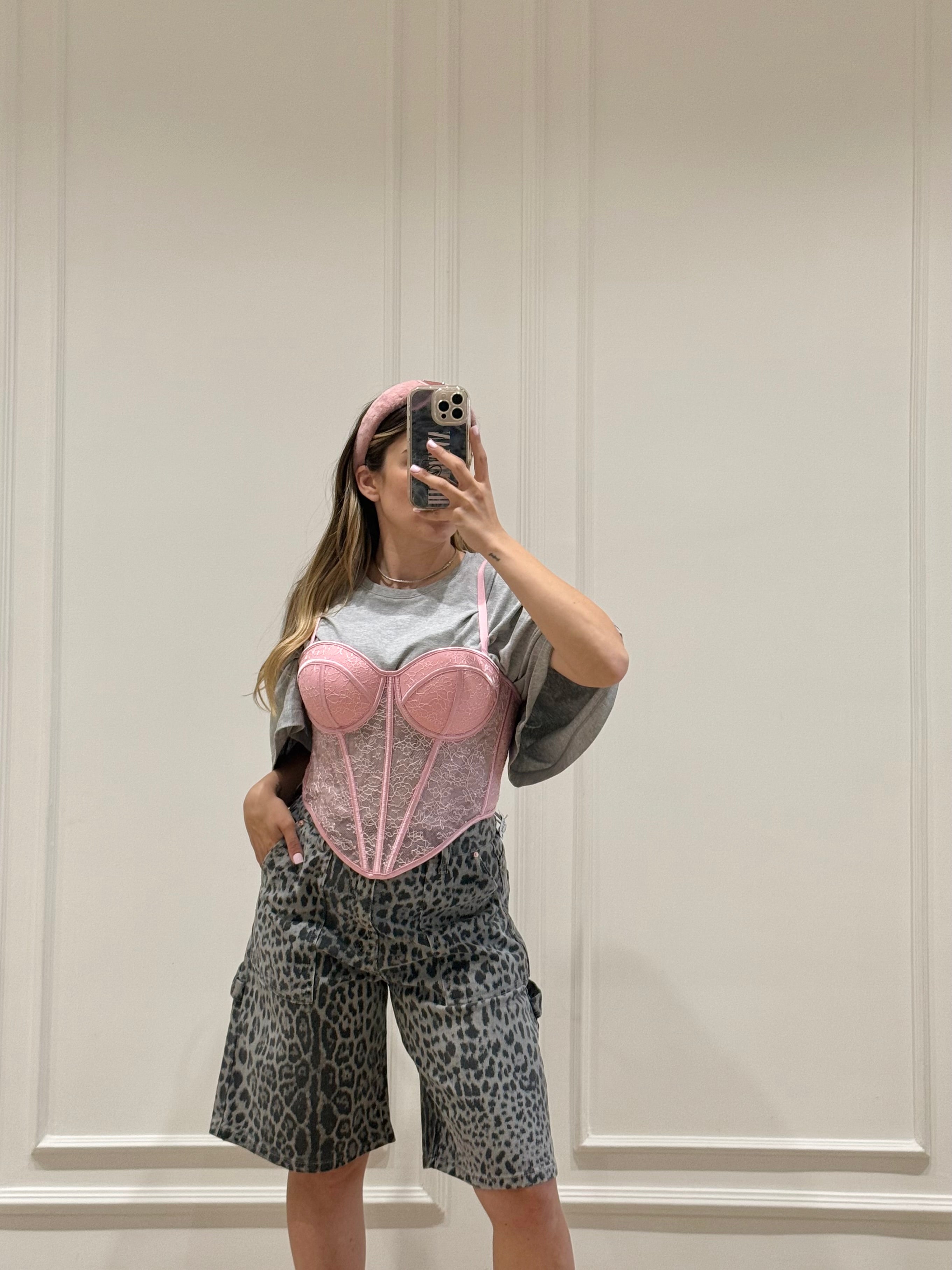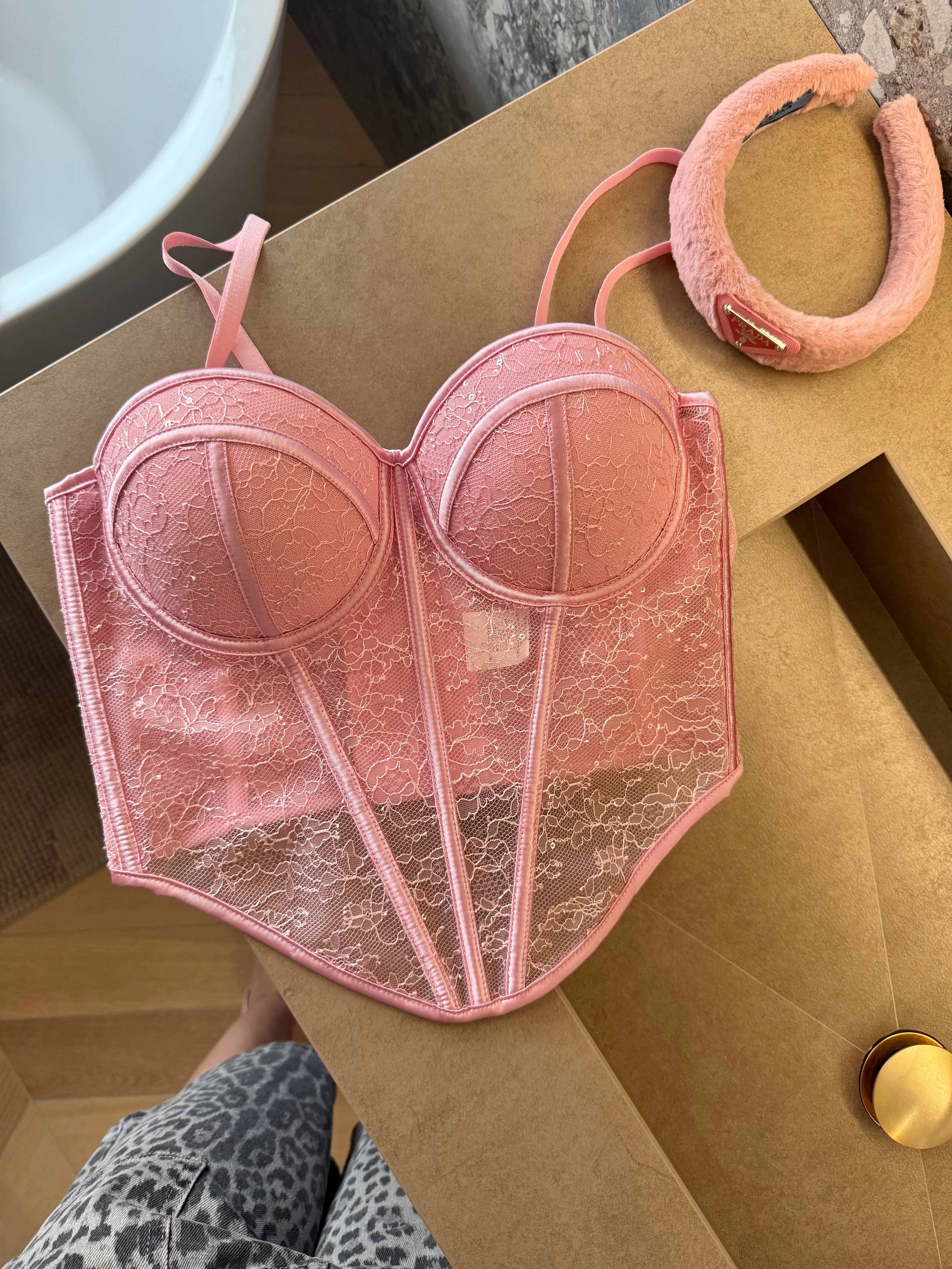 Bustino steccato rosa con leggere pailettes tono su tono. Un capo di lingerie elegante e sofisticato, realizzato con un tessuto rosa delicato e impreziosito da leggere pailettes che aggiungono un tocco di luce e glamour. Le stecche garantiscono un sostegno perfetto e una silhouette elegante, mentre il colore rosa aggiunge un tocco di femminilità e romanticismo