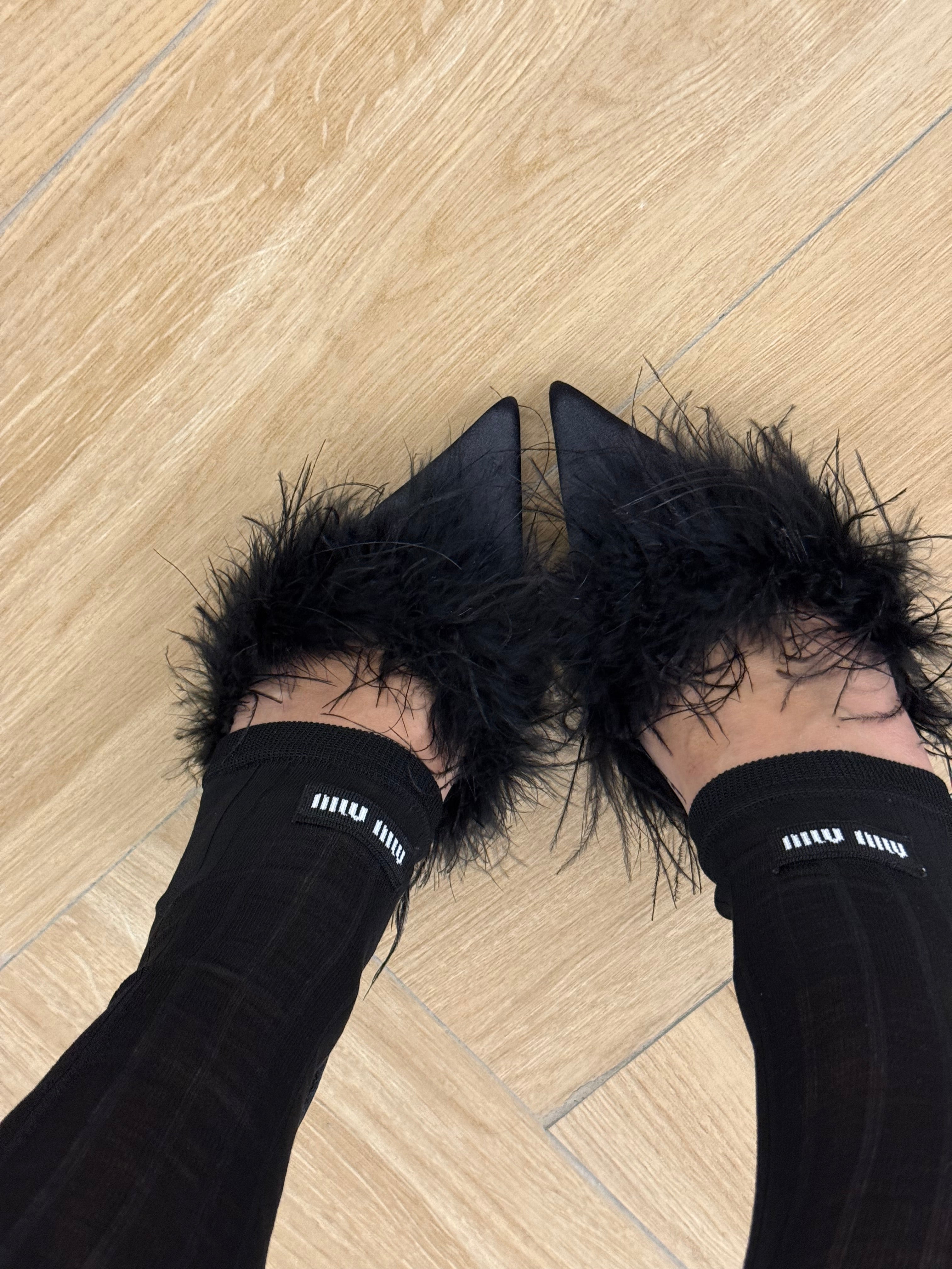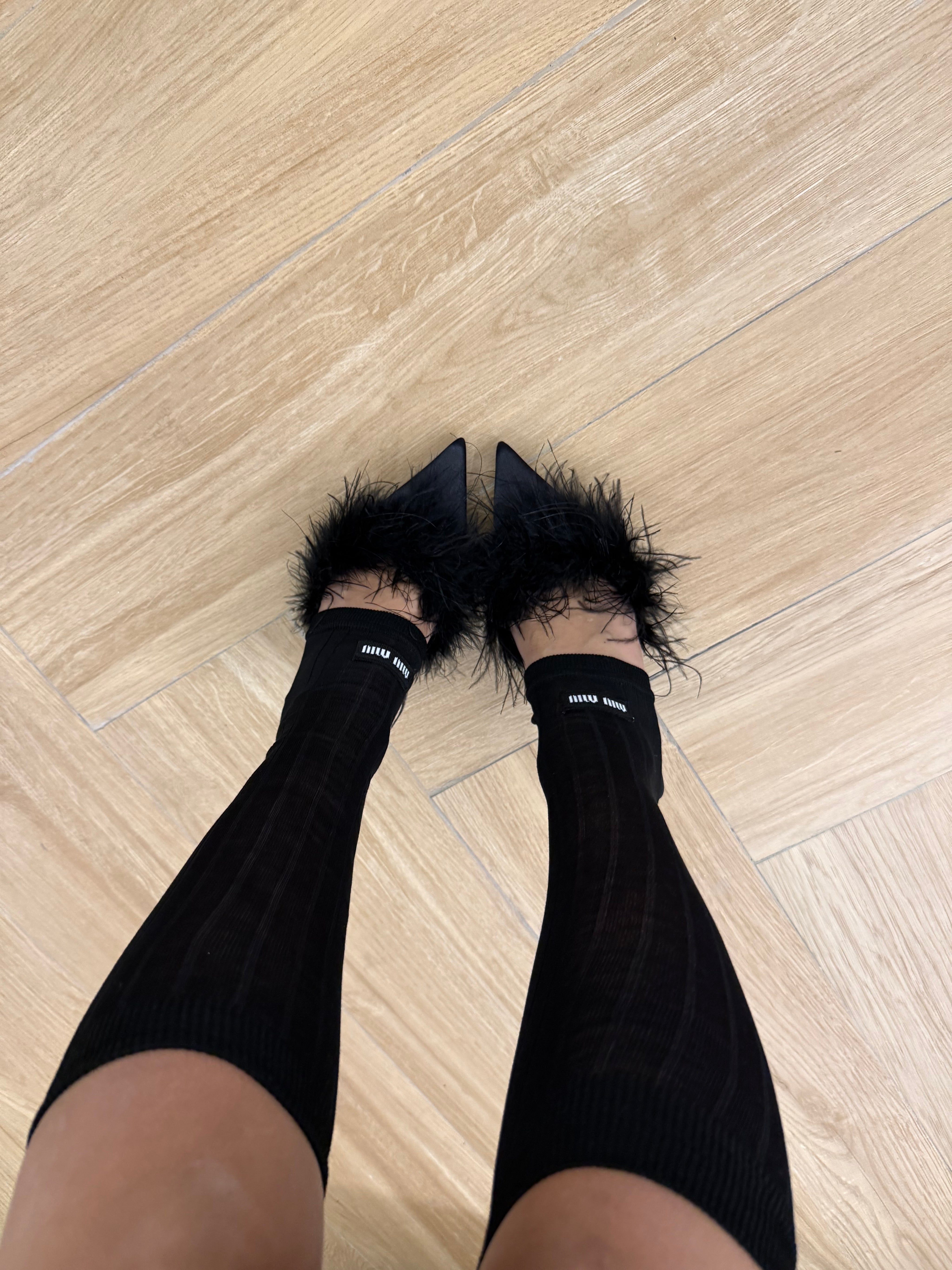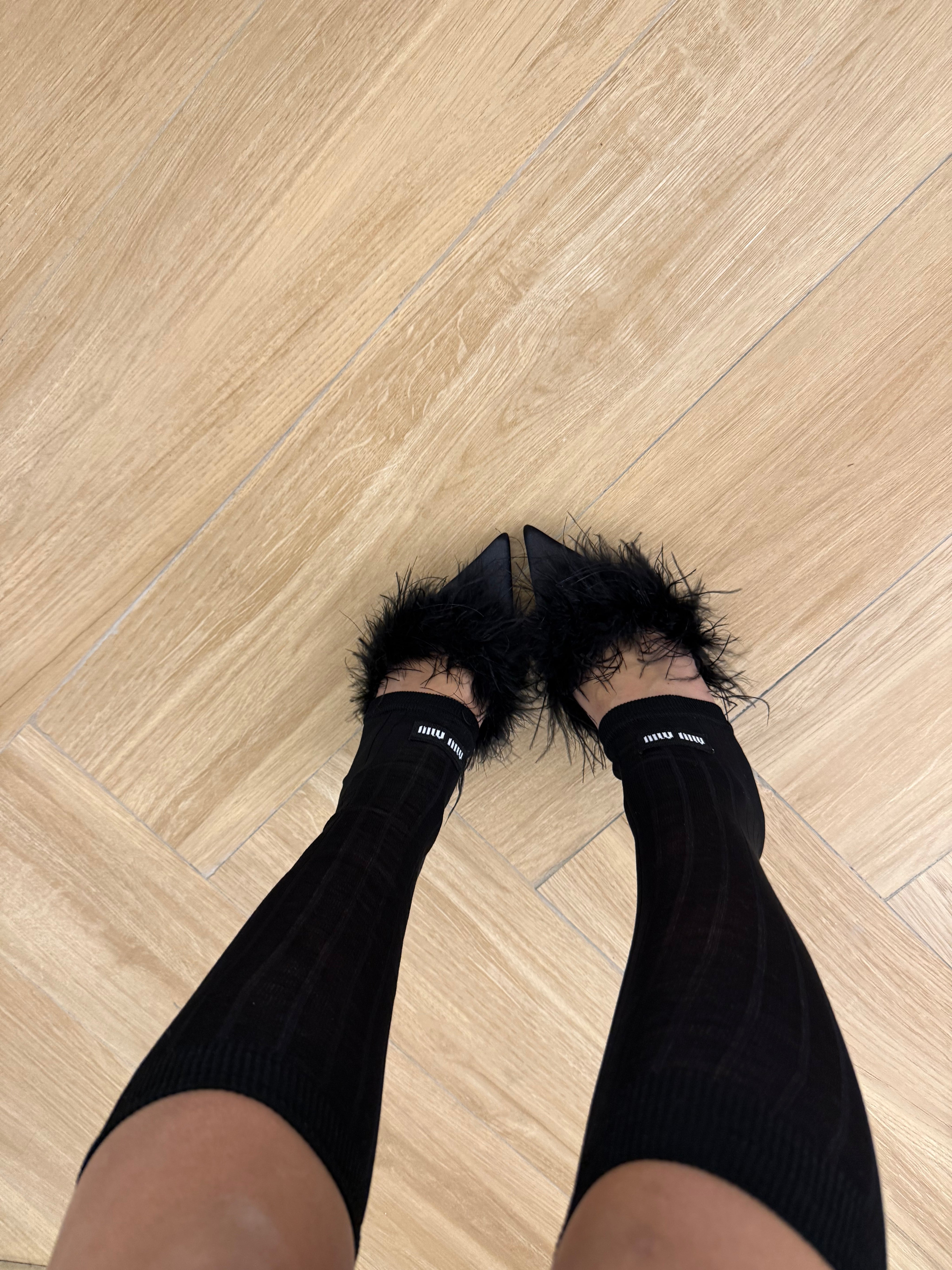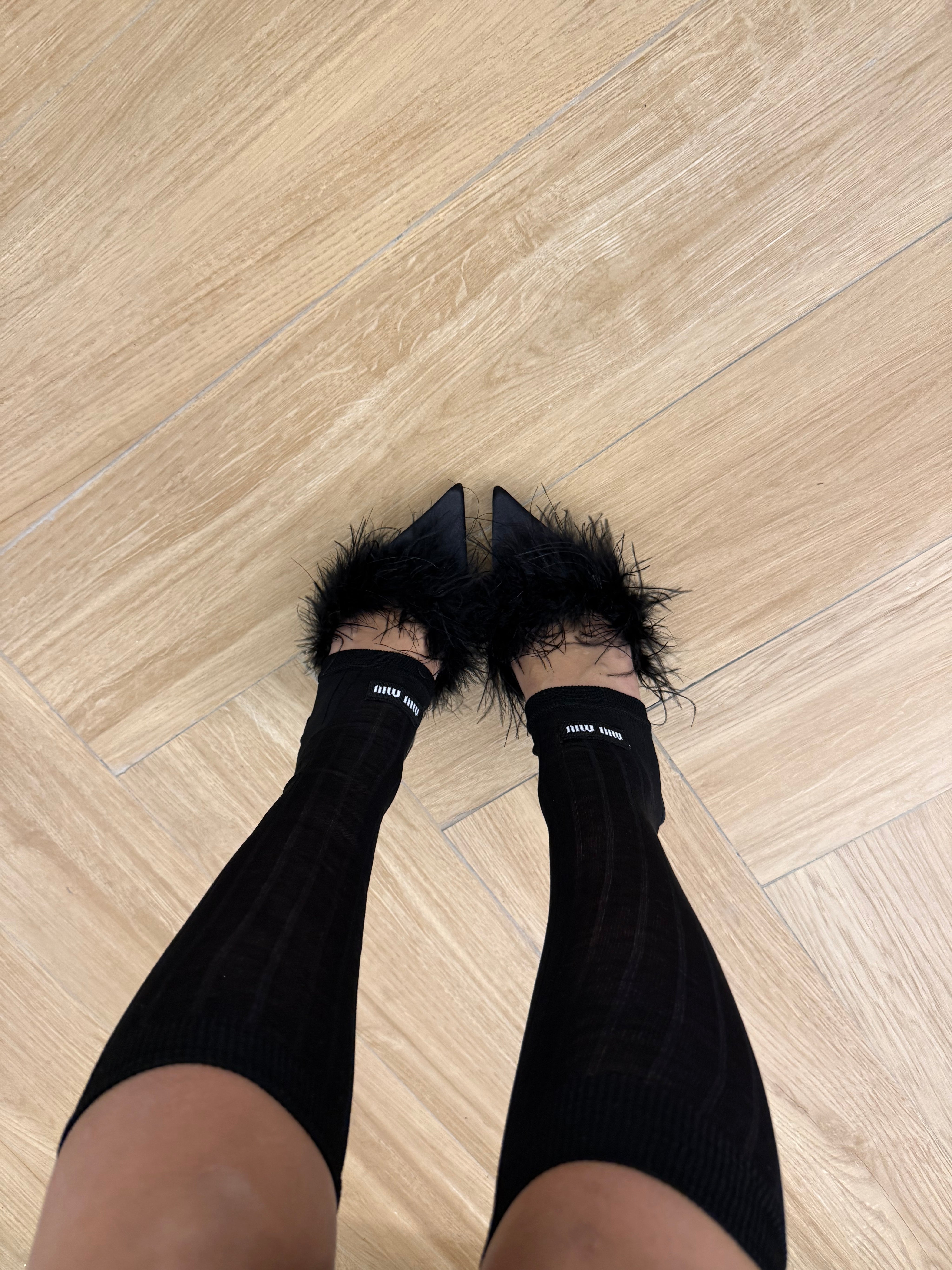 Realizzati in filato morbido e leggero, questi calzini Miu Miu neri rigati si distinguono per la scritta Miu Miu sul lato. Dal design lungo fino al ginocchio, lasciano scoperto il tallone per una vestibilità originale e fashion-forward. Perfetti per completare look moderni e audaci.