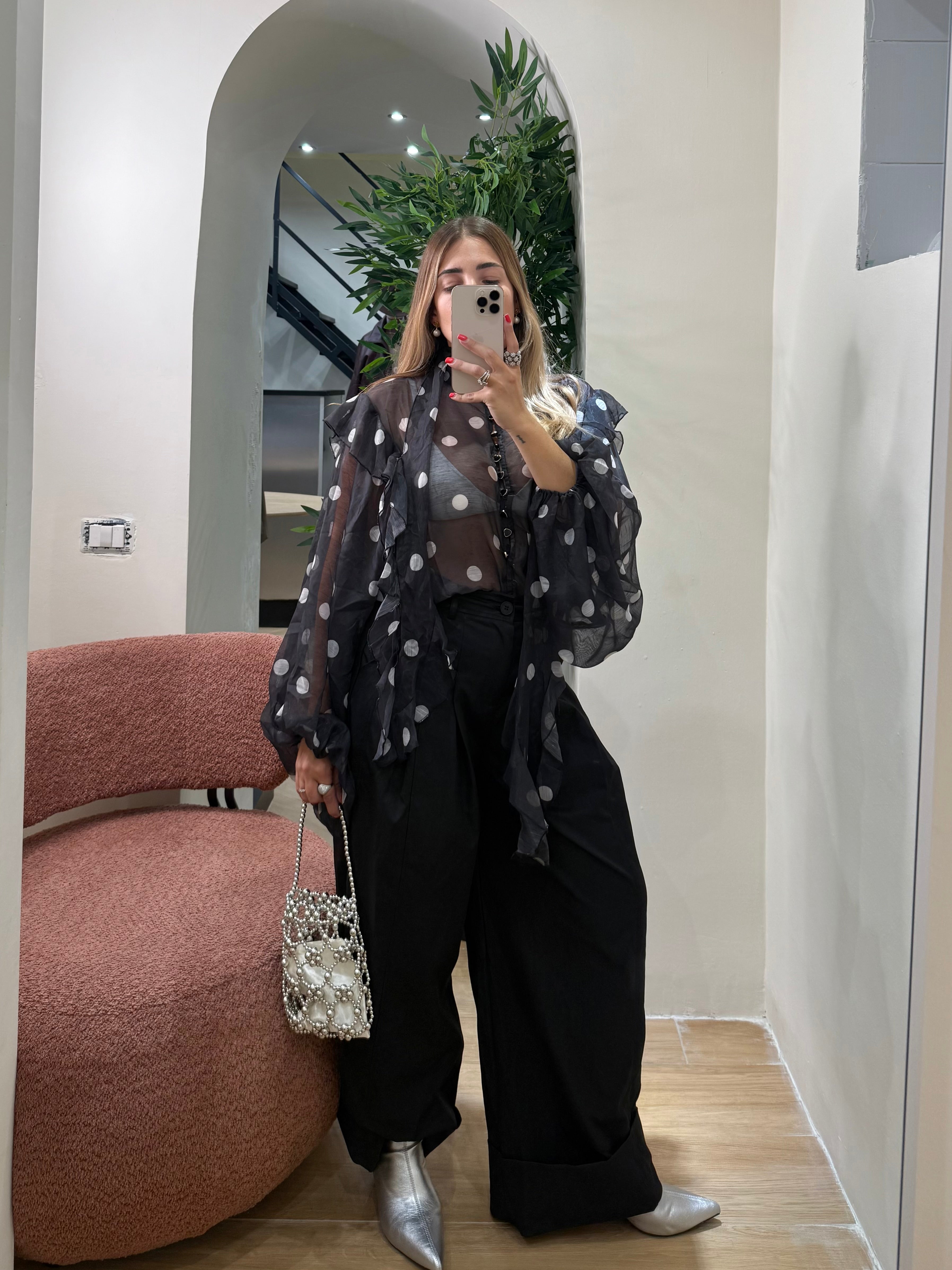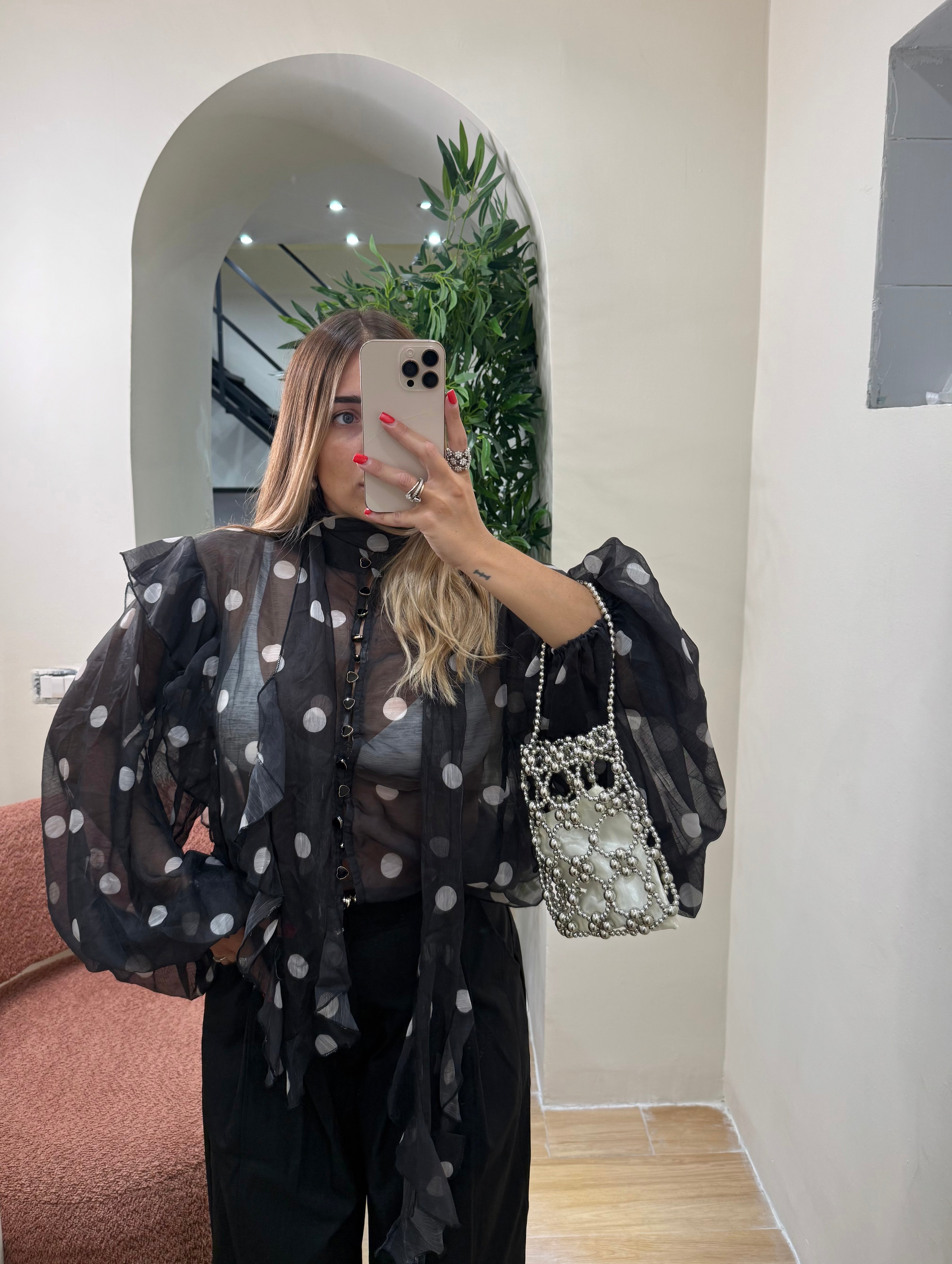 Camicia femminile in tessuto leggero e trasparente, con fantasia a pois, rouches sui polsi e fusciacca da annodare al collo. Un capo romantico e versatile, perfetto per look eleganti o layering creativo