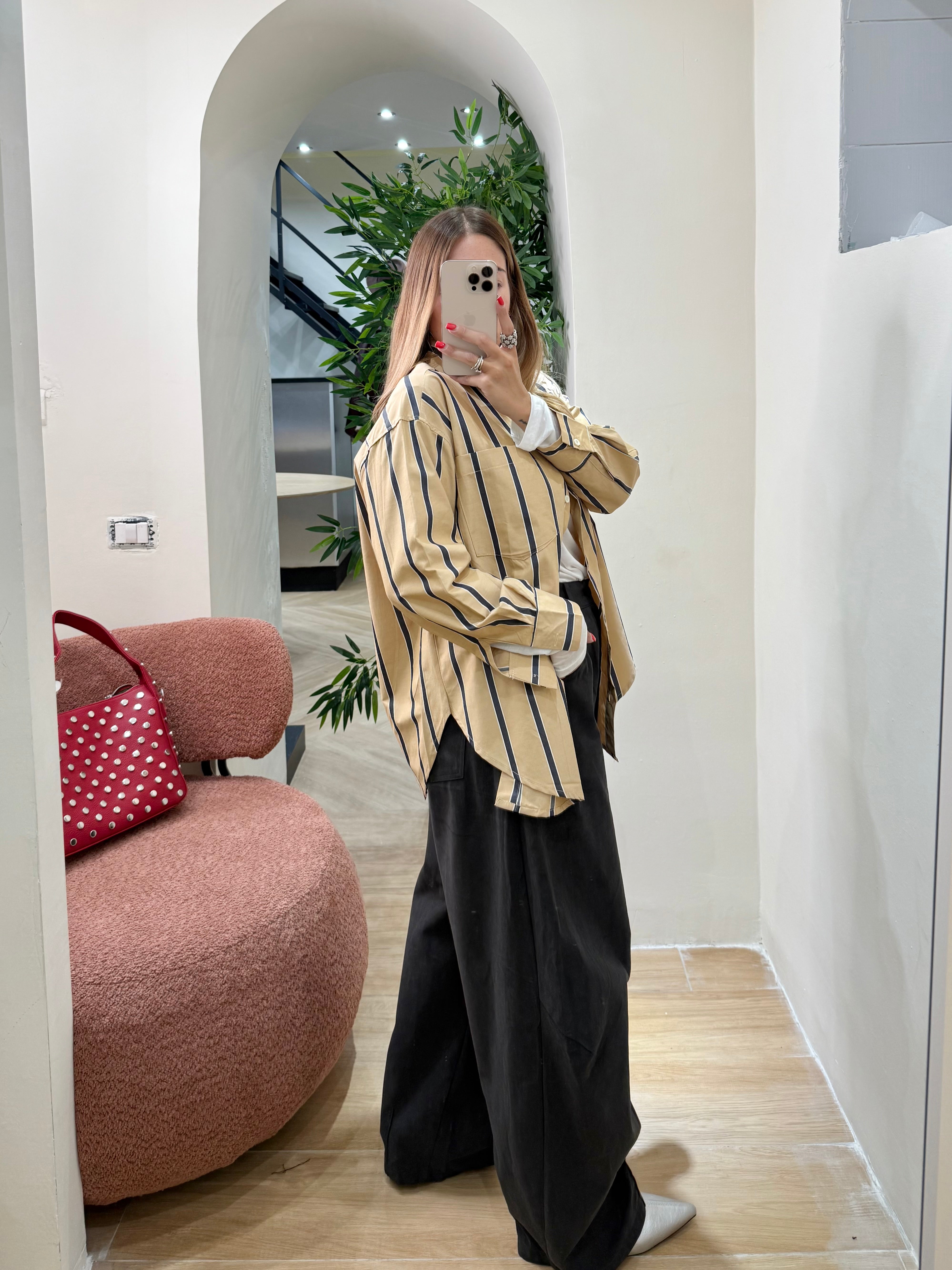 Camicia in cotone morbido dal taglio oversize, pensata per uno stile disinvolto e contemporaneo. Il fondo color burro è attraversato da righe blu ampie e decise, che donano carattere e luminosità al capo. Versatile e sofisticata, è perfetta sia come pezzo protagonista che come sovracamicia leggera, ideale per look casual chic.
