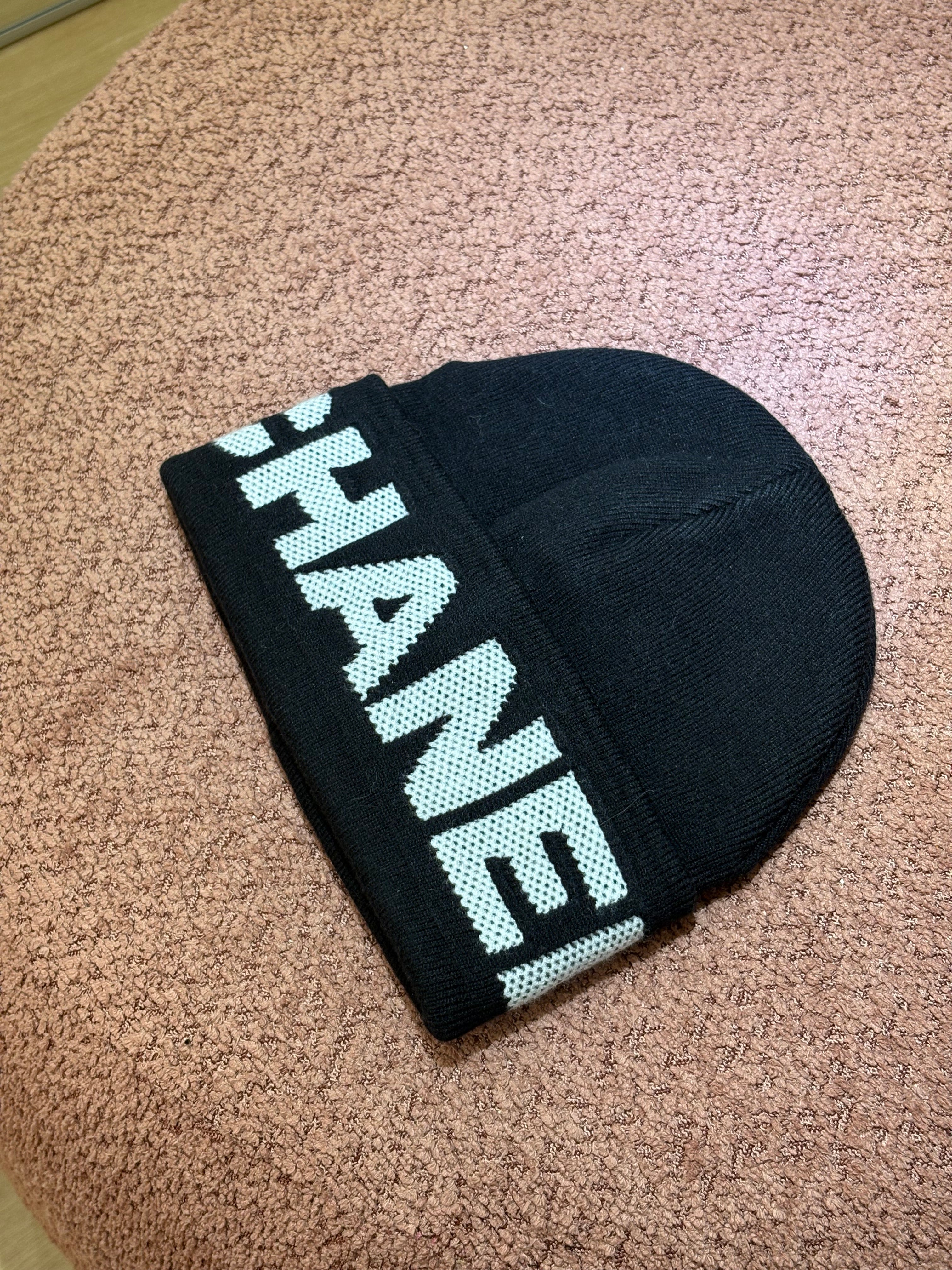 realizzato in pregiata lana a righe su fondale nero. L’ampia scritta CHANEL in caratteri doppi risalta sul design minimale, donando un tocco deciso e sofisticato. Perfetto per completare look street-chic e outfit invernali dallo stile deciso.