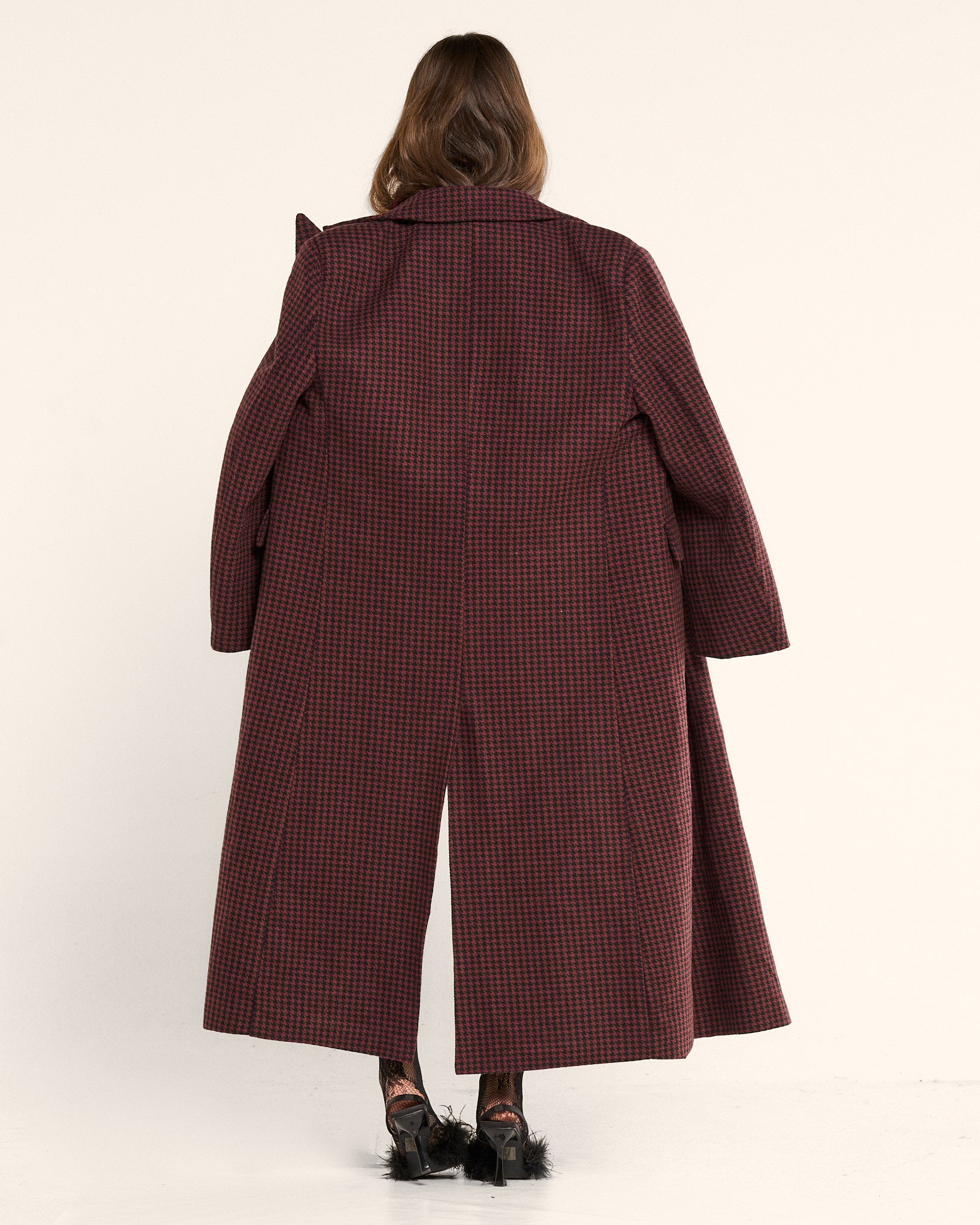 Una giacca che porta luce e forza al look. Luméra riprende la grafica dei quadroni rossi in modo elegante e dinamico, trasformando un capo classico in un pezzo couture moderno. Versatile, iconico e perfetto da mixare con altri elementi della collezione.