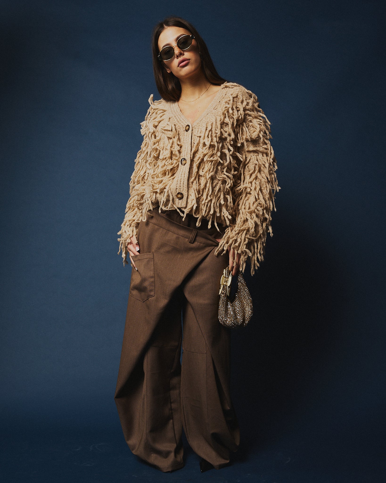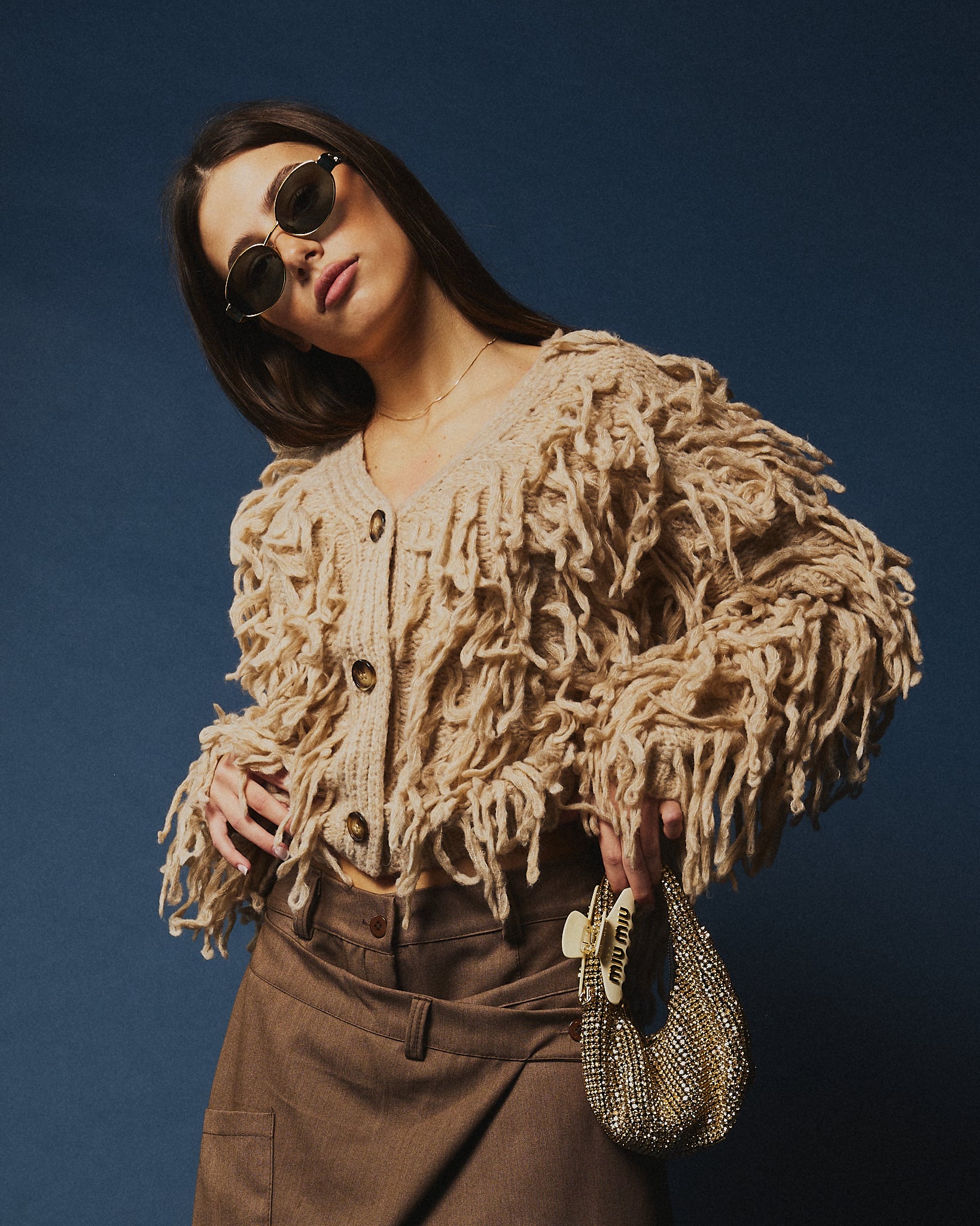 Cardigan dal design ricercato, realizzato in filato morbido con lavorazione tridimensionale effetto frange che dona movimento e carattere al capo.