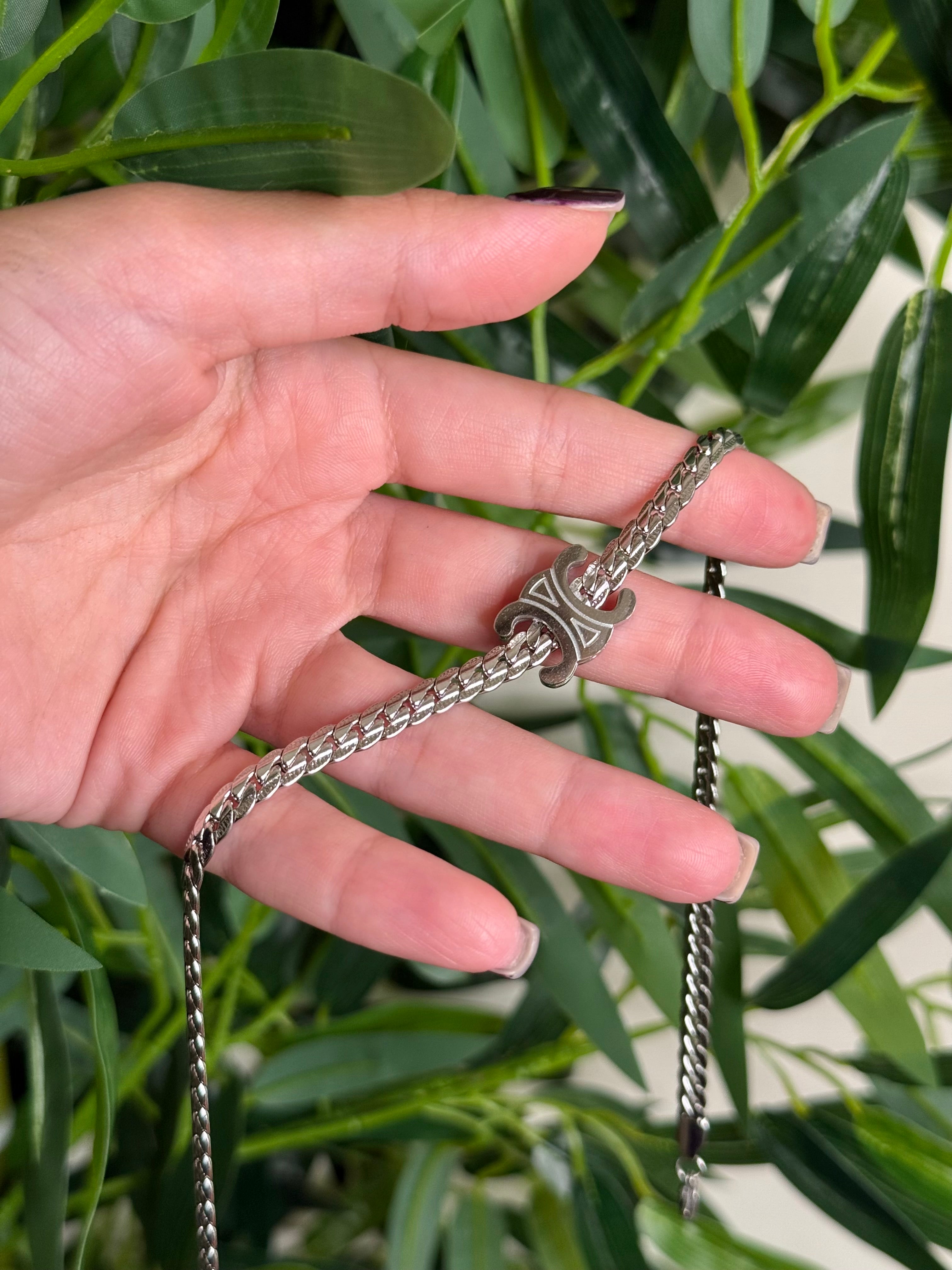 Collana girocollo modello groumette in metallo dorato lucido, caratterizzata da maxi maglia piatta e centrale iconico in metallo smaltato. Un accessorio bold e sofisticato che unisce l’allure del gioiello statement al dettaglio del logo, perfetto per valorizzare scollature e look sia casual che serali.
