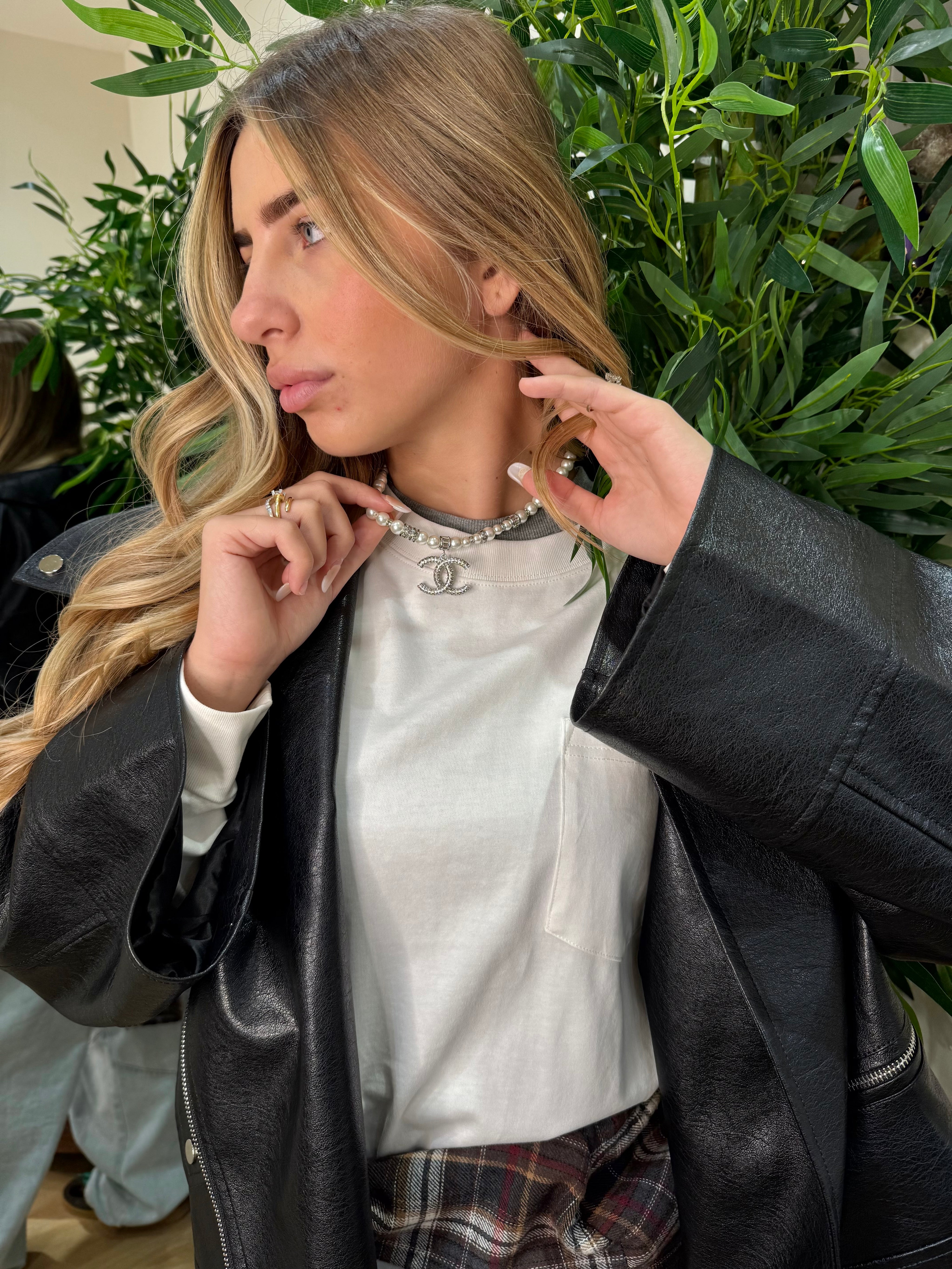 Collana di perle dal fascino intramontabile, arricchita da dettagli luminosi e da un ciondolo iconico completamente ricoperto di strass. Elegante, brillante e ultra-femminile: il pezzo che eleva anche la t-shirt più semplice e aggiunge subito un tocco chic al tuo look. Un must per chi ama distinguersi senza esagerare.