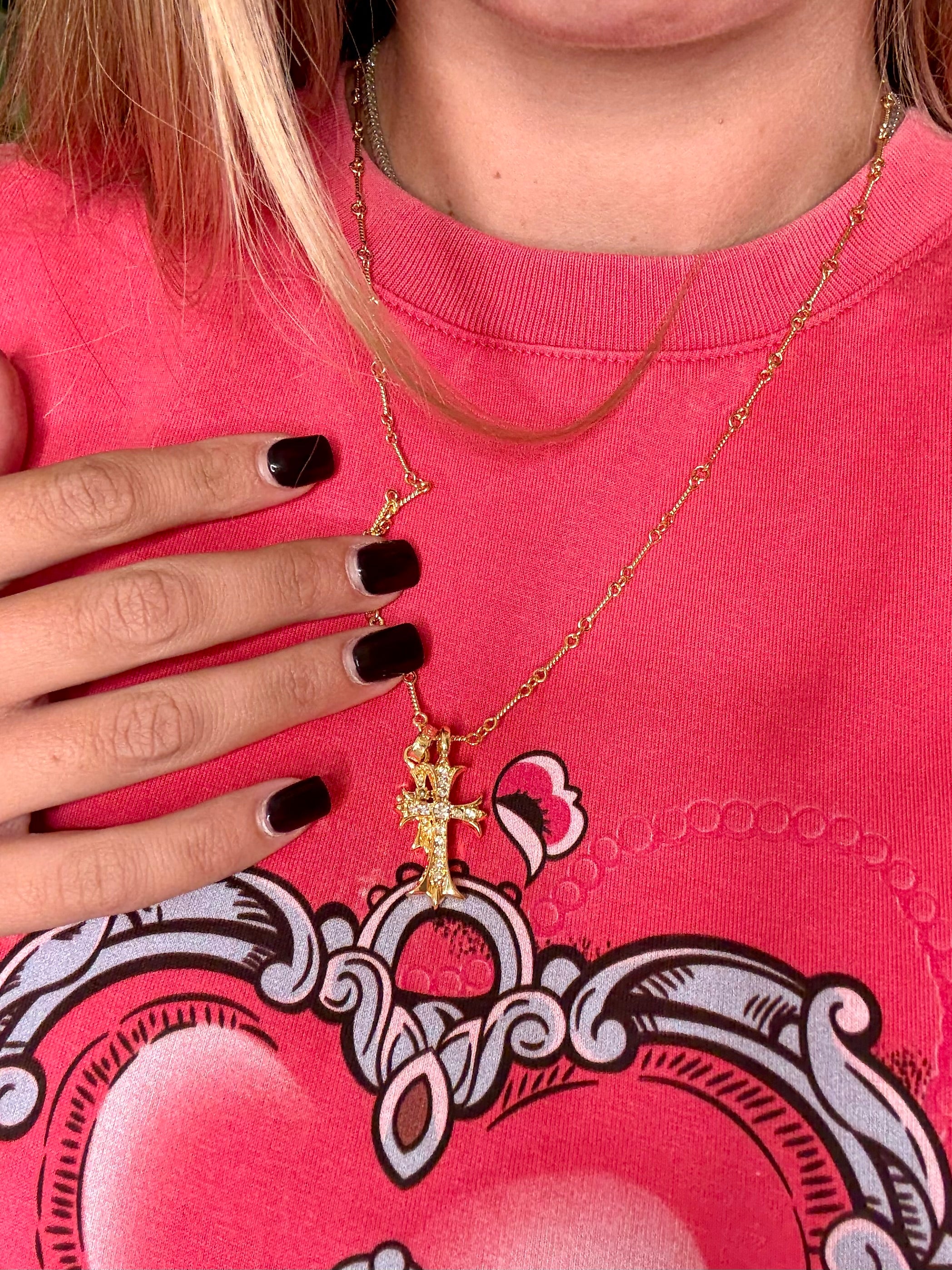 Collana in metallo dorato lucido con catena sottile a maglie lavorate e due pendenti a croce stile gotico, uno più grande e uno più piccolo, entrambi impreziositi da cristalli luminosi incastonati. Un gioiello elegante e d’impatto, perfetto per completare look raffinati o dare un tocco luxury agli outfit quotidiani.