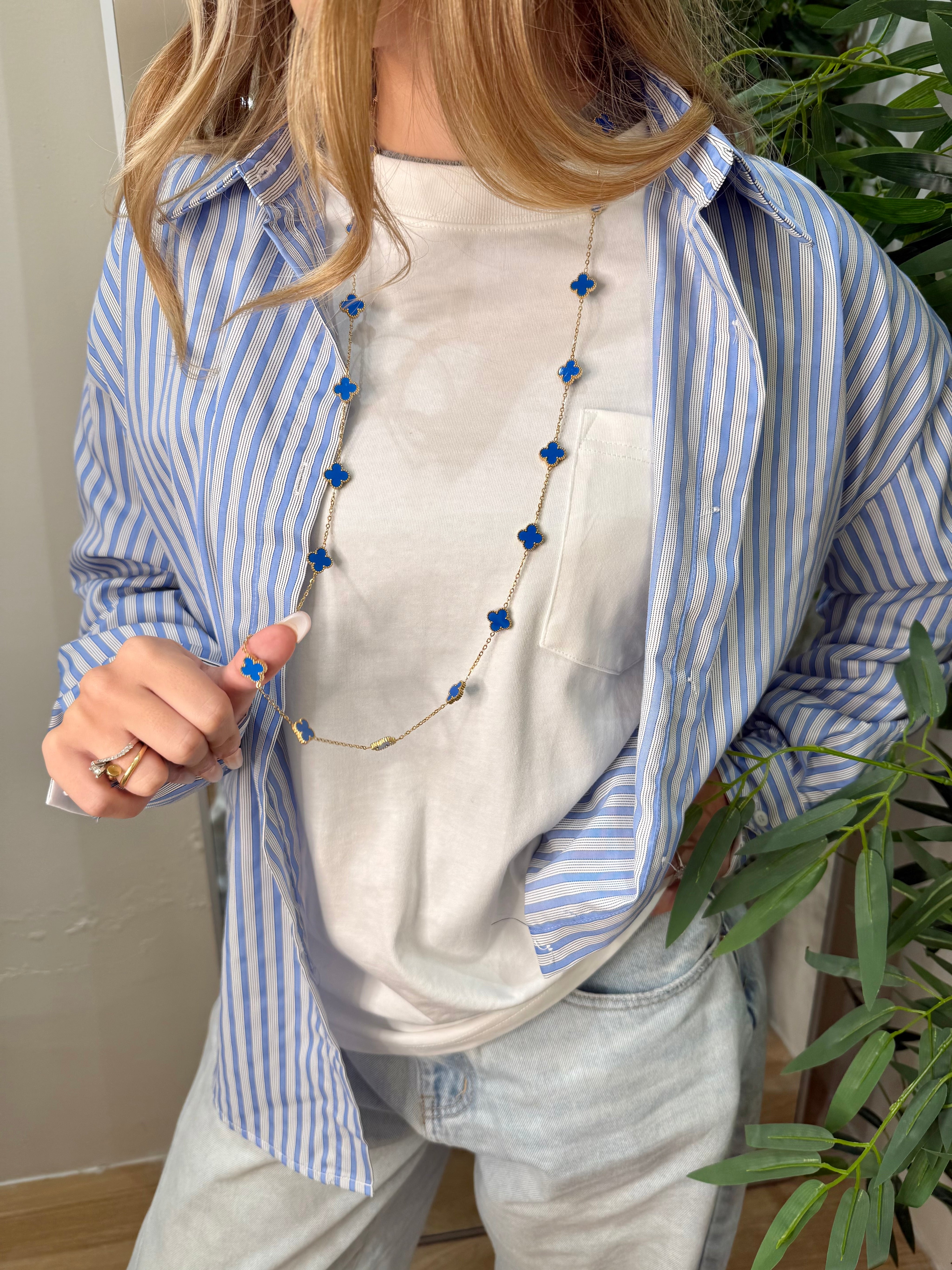 Collana lunga con charms a forma di quadrifoglio in smalto blu intenso, alternati a piccoli dettagli dorati che illuminano il décolleté. La catena sottile dorata la rende sofisticata e super versatile: perfetta sia su look casual con camicia e denim, sia per dare un tocco chic ai tuoi outfit serali. Leggera, femminile e d’impatto senza risultare eccessiva — il pezzo ideale per completare qualsiasi stile con un accento raffinato e moderno.