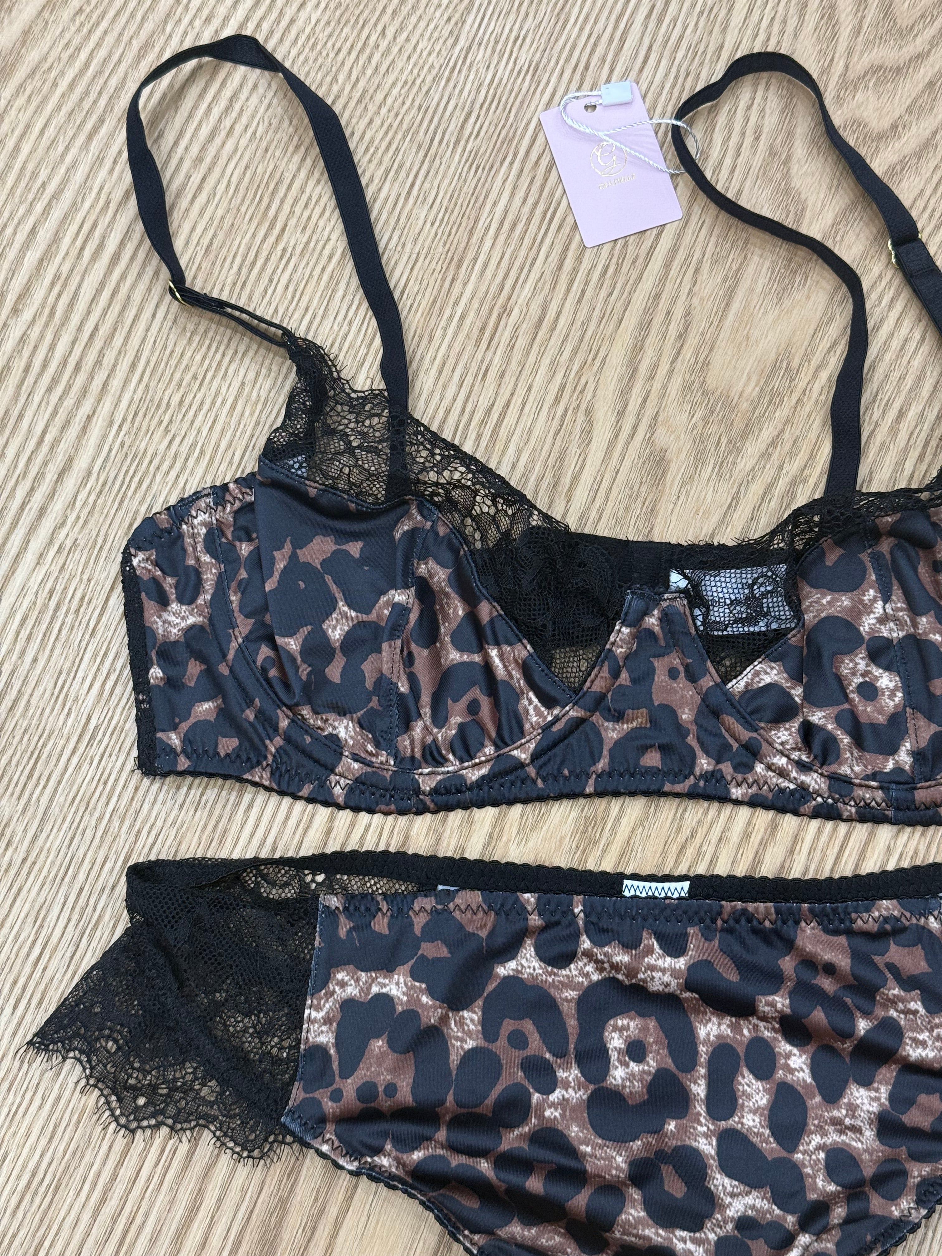 è un completino intimo pensato per chi ama giocare con il contrasto tra istinto e raffinatezza. Il reggiseno a balconcino scolpisce il seno con eleganza, avvolto in un tessuto leopardato moderno dai toni caldi e profondi. Le coppe sono impreziosite da ricami neri che disegnano motivi sinuosi, aggiungendo un tocco di lusso alla sensualità dell’animalier.