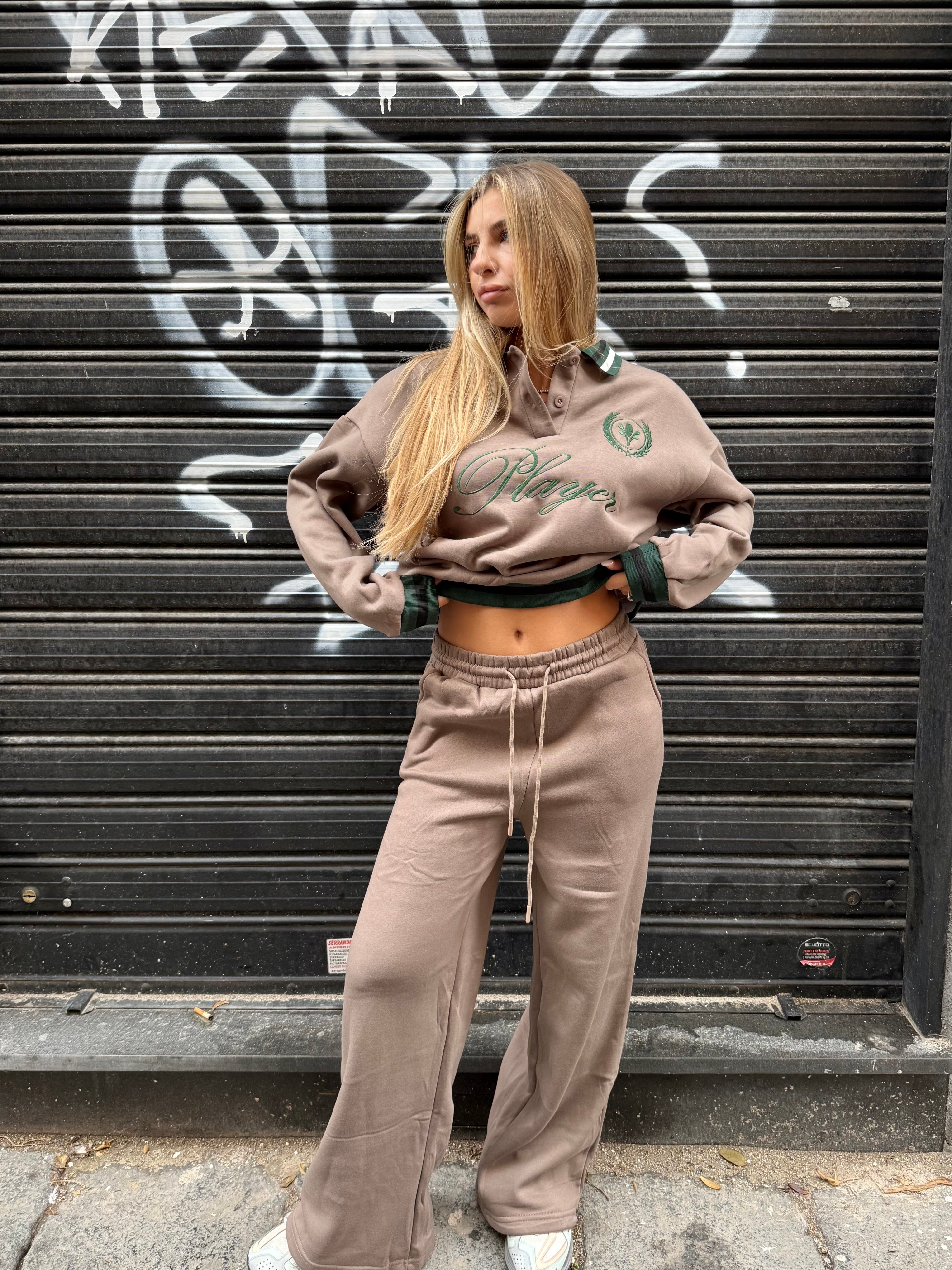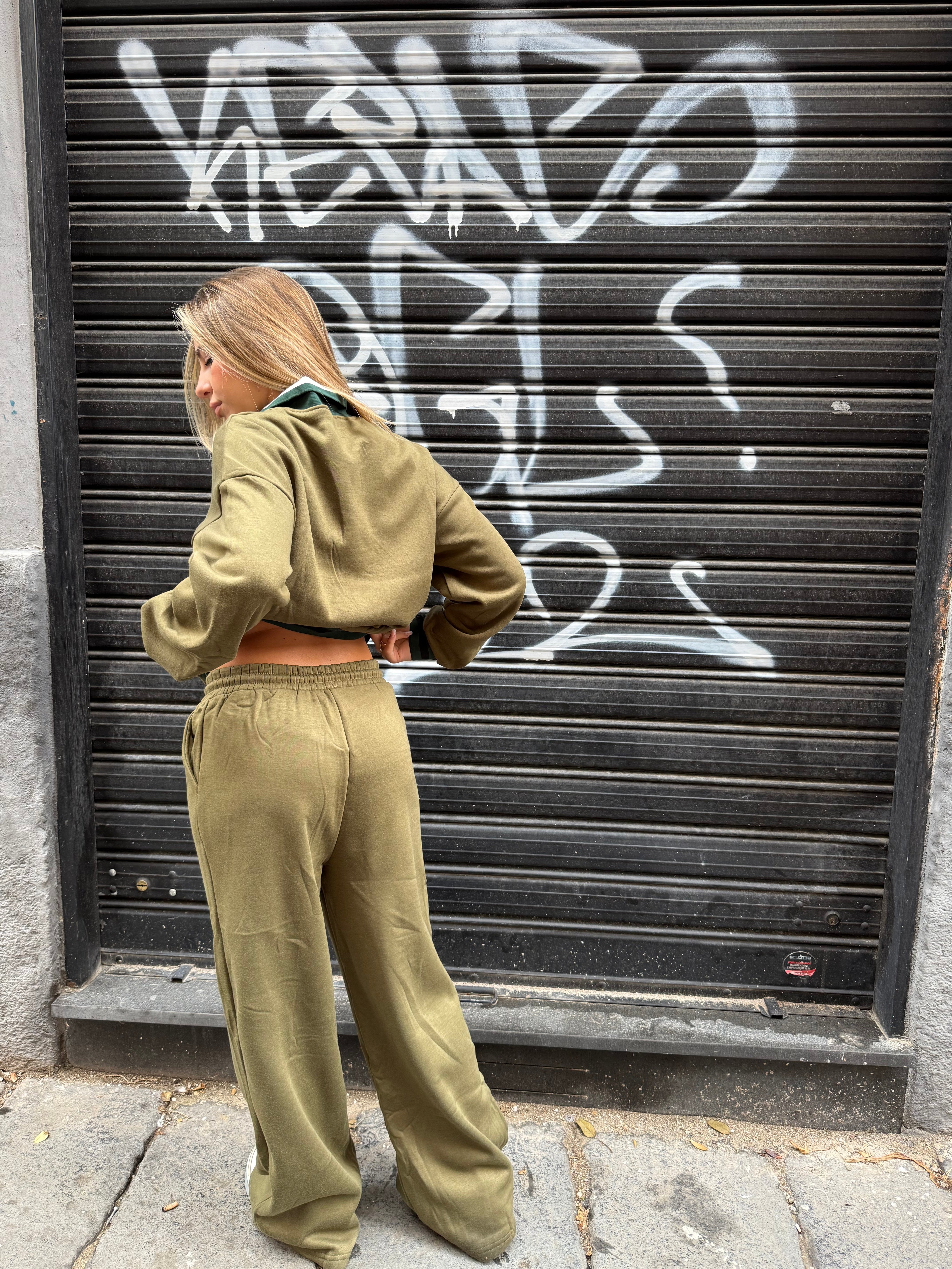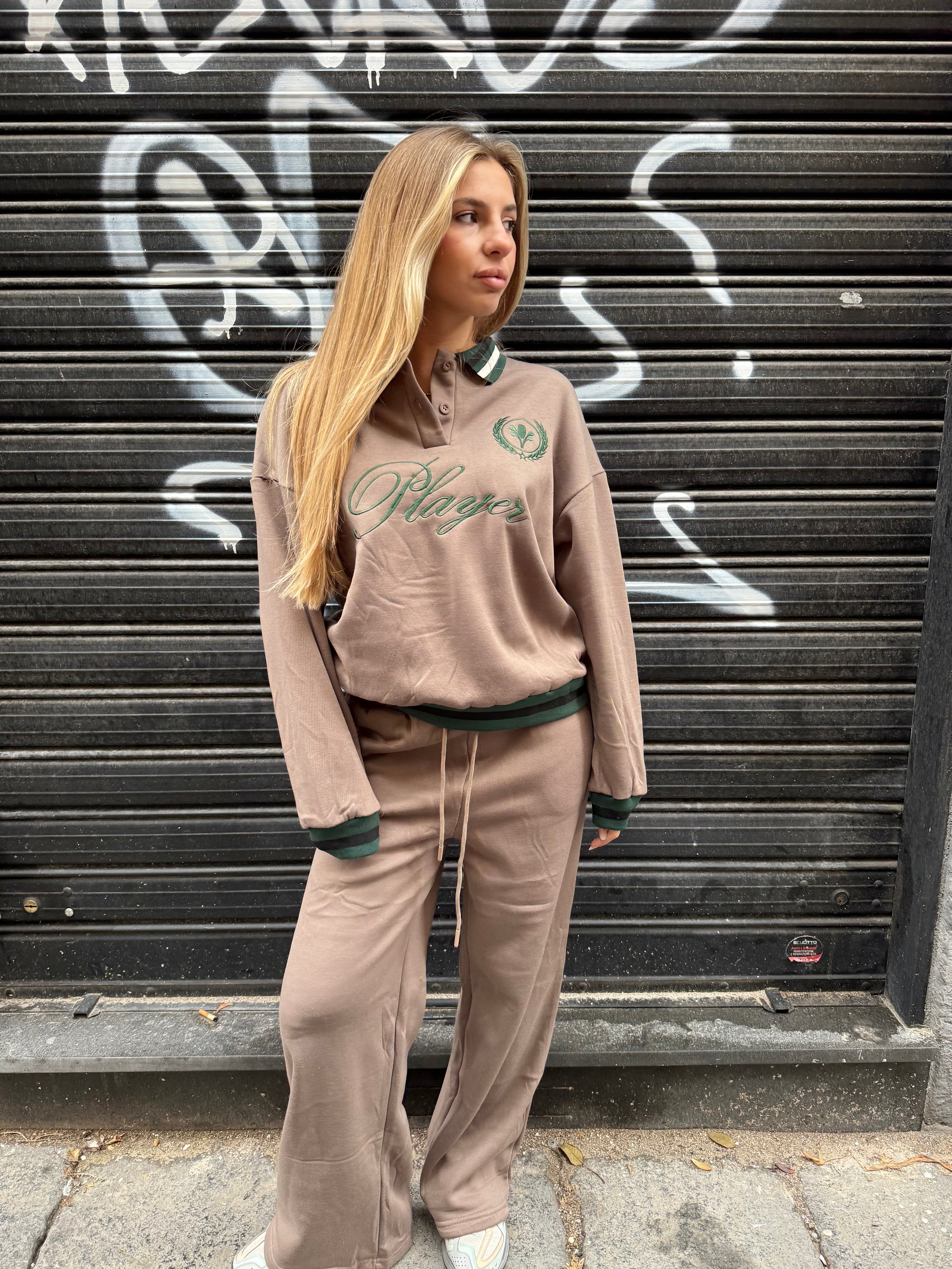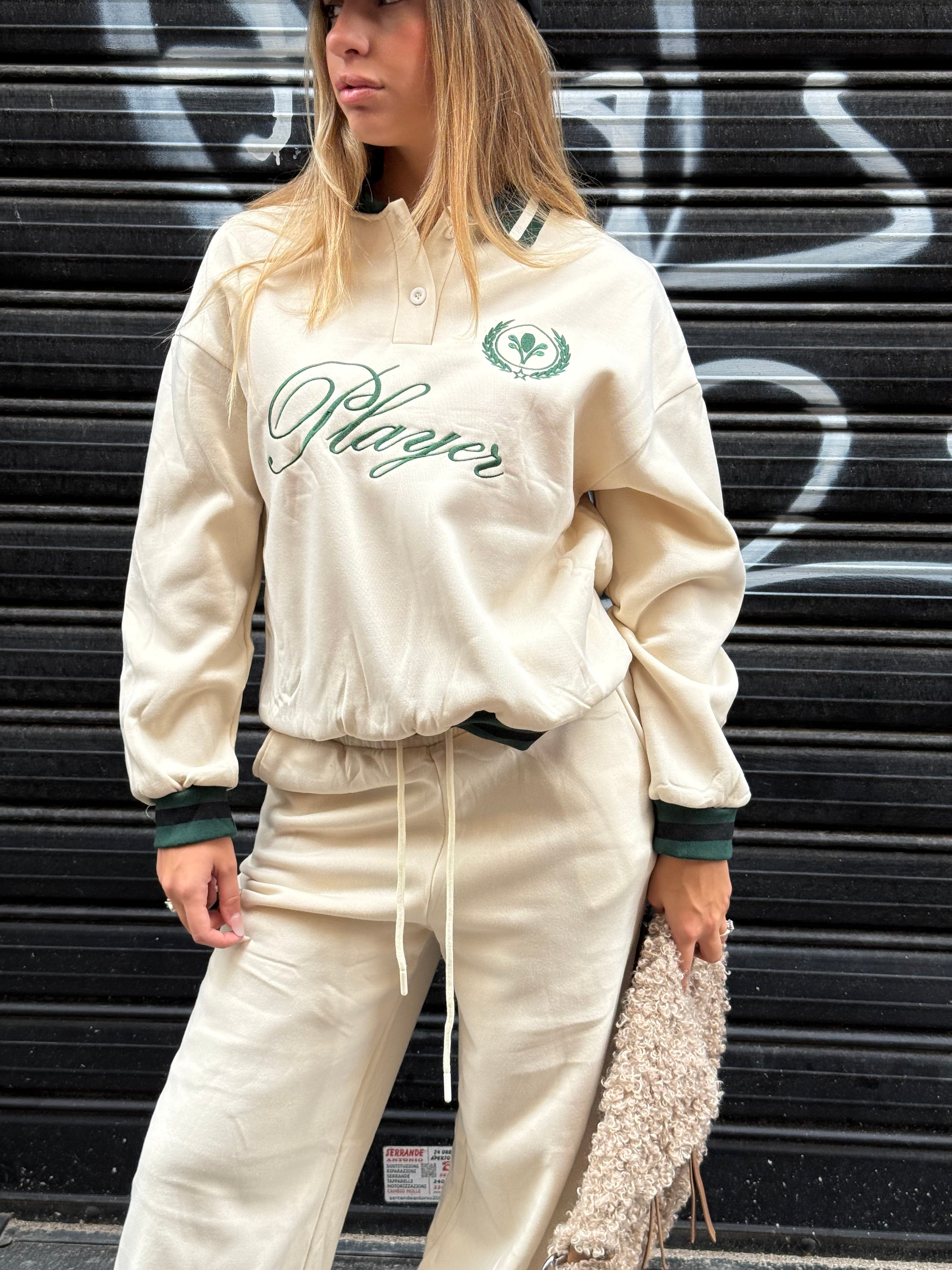 Green Player Set è un completo coordinato che unisce comfort streetwear e vibe da college americano. Composto da una felpa oversize con colletto stile varsity e pantaloni jogger abbinati, il set è realizzato in morbido cotone felpato per un fit rilassato ma curato. Le scritte verde acceso — con font bold ispirato al mondo del gaming e dello sport — donano un tocco grafico deciso e contemporaneo. Perfetto per chi vuole uno stile urbano con personalità, senza rinunciare al comfort.