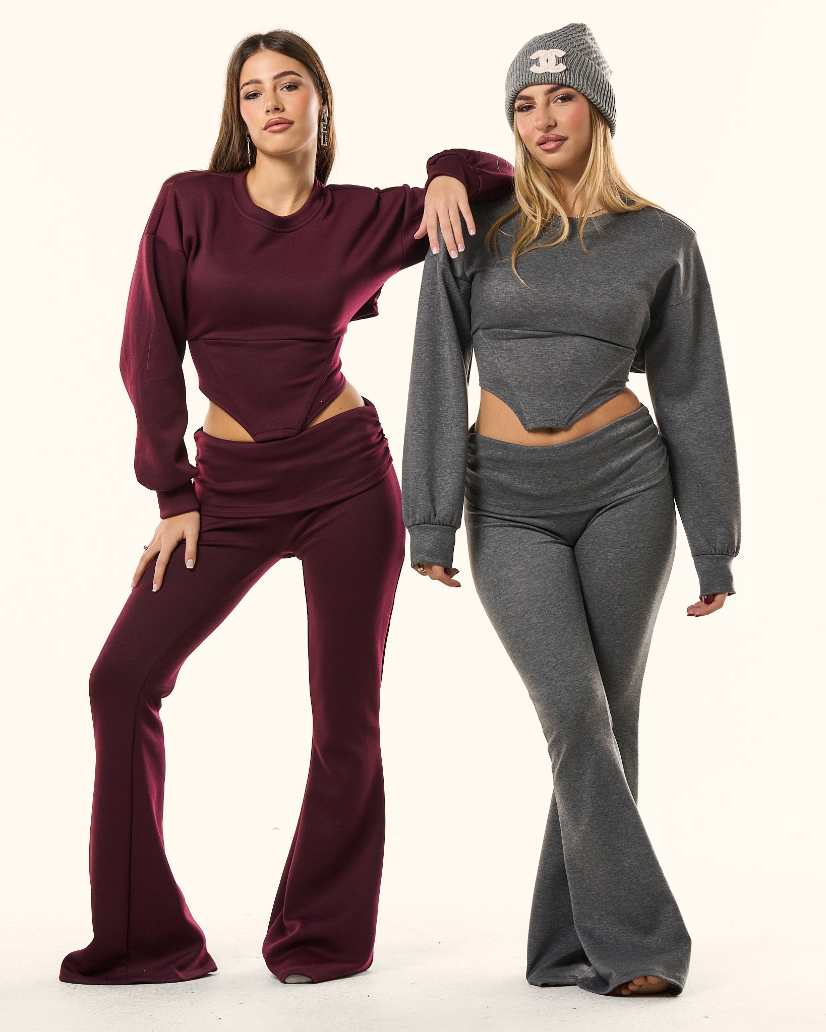 questo Coordinato è pensato per valorizzare al massimo la silhouette, unendo comfort e stile in un look unico. Realizzato in felpa premium elasticizzata, il set comprende un top sagomato con tagli che slanciano la figura e un pantalone flare che cade morbido fino al fondo, creando un effetto allungante ed elegante anche in versione tuta.