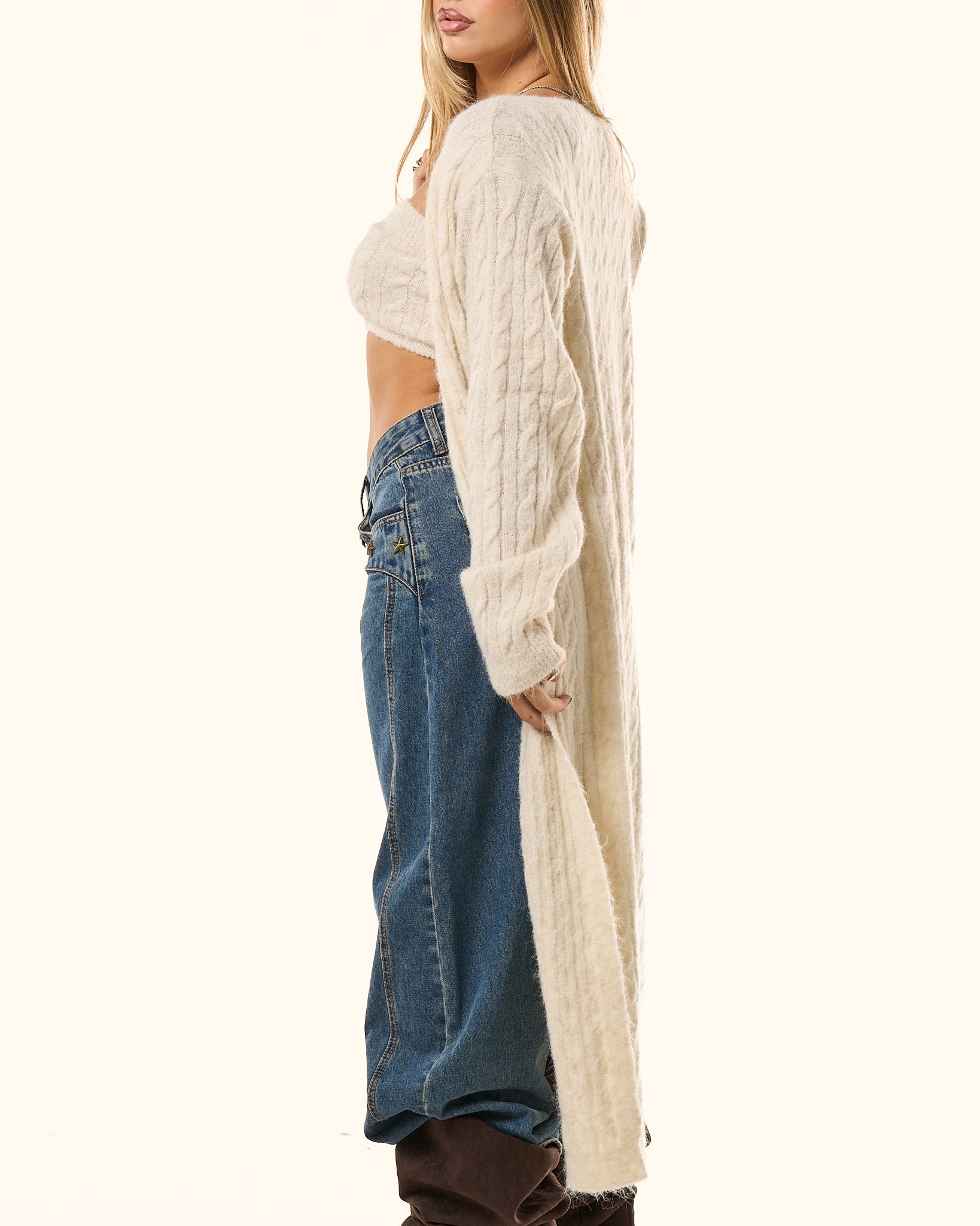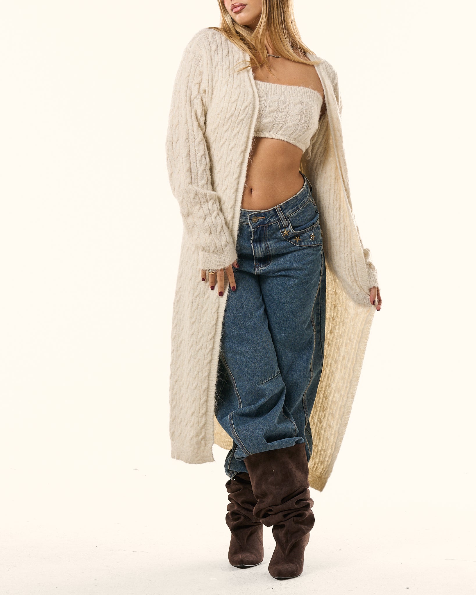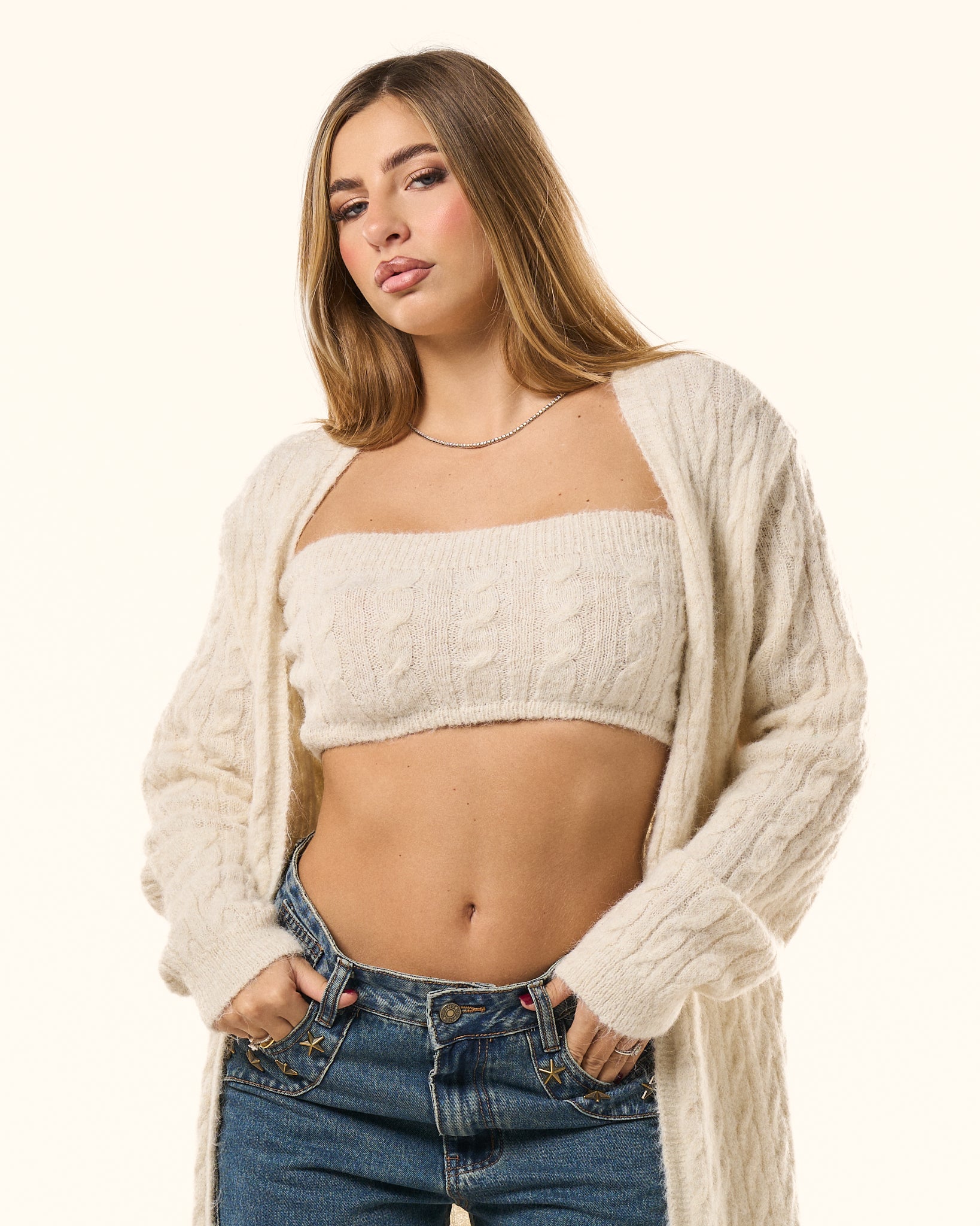 coordinato in maglia intrecciata che unisce calore, morbidezza ed estetica femminile. Composto da una fascia top a lavorazione treccia e un cardigan lungo abbinato, avvolge la silhouette con un mood cozy ma ricercato. Il design minimal e il colore neutro lo rendono un set estremamente versatile, perfetto da indossare con denim, pantaloni soft o look più eleganti.