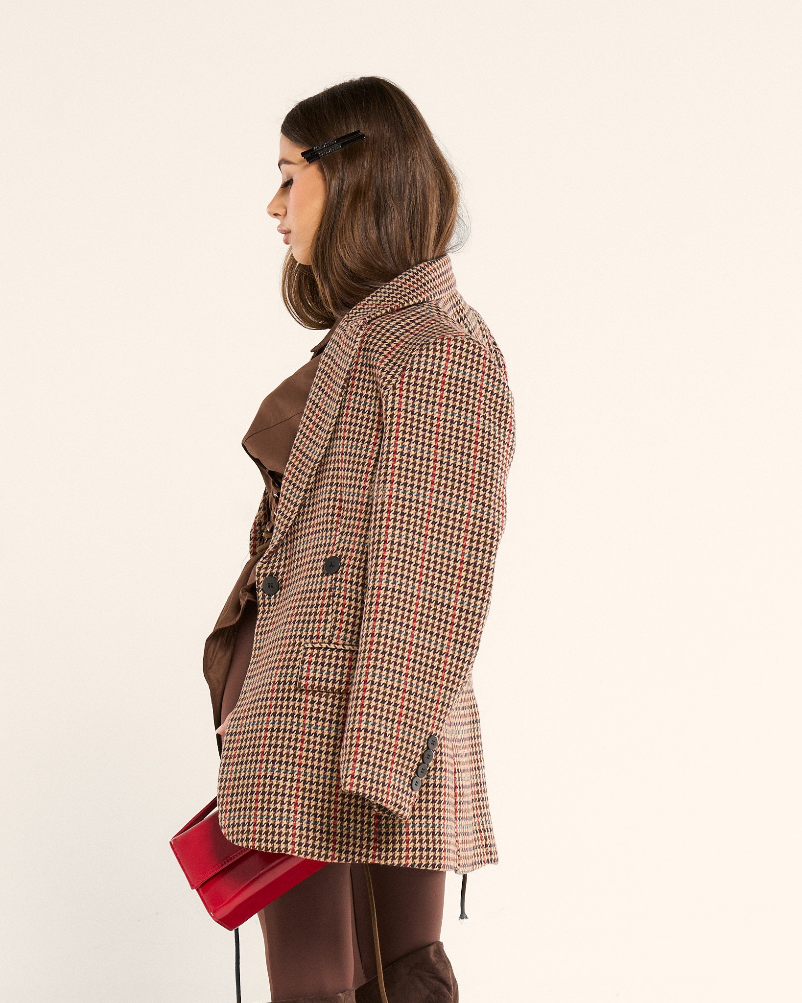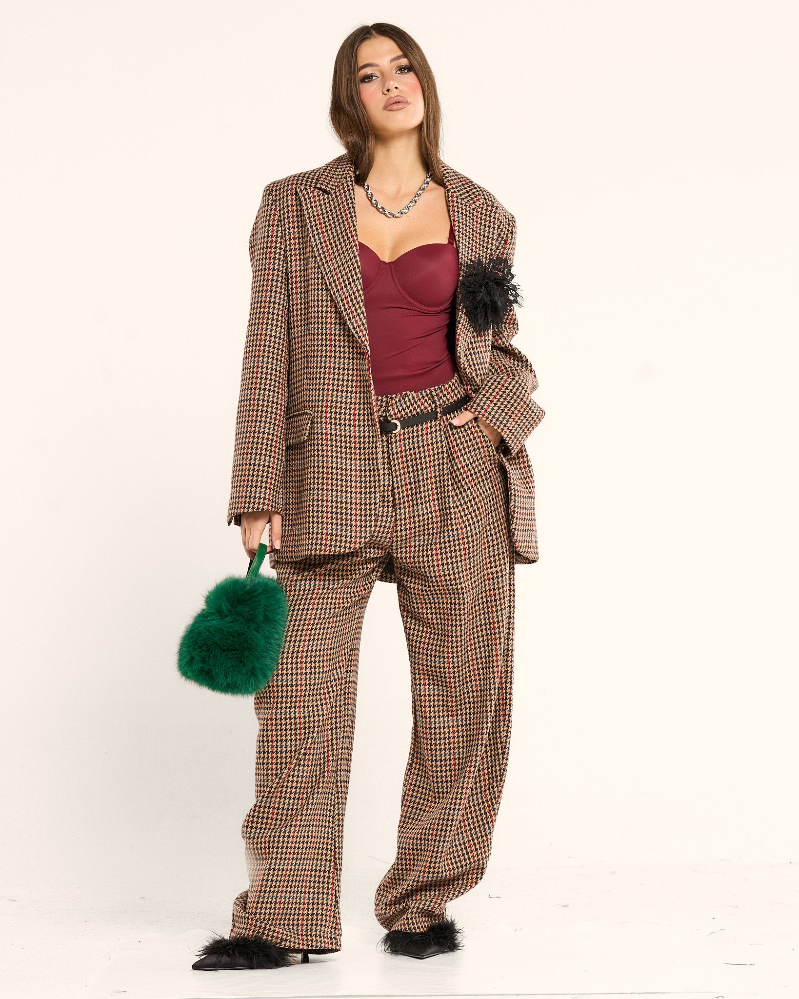 Un completo che gioca tra classico e contemporaneo. Piedra reinterpreta il pied-de-poule in chiave moderna: giacca strutturata e pantaloncini morbidi creano un equilibrio perfetto tra eleganza e comfort urbano. Minimal ma memorabile, è il capo che comunica stile deciso e personalità.