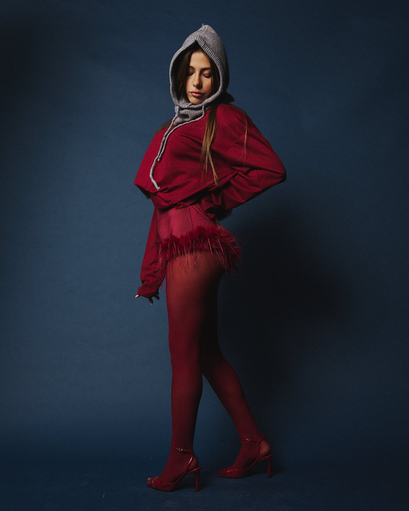 Il dettaglio in piume sul fondo aggiunge movimento, luce e un tocco glamour, rendendo il capo immediatamente protagonista.