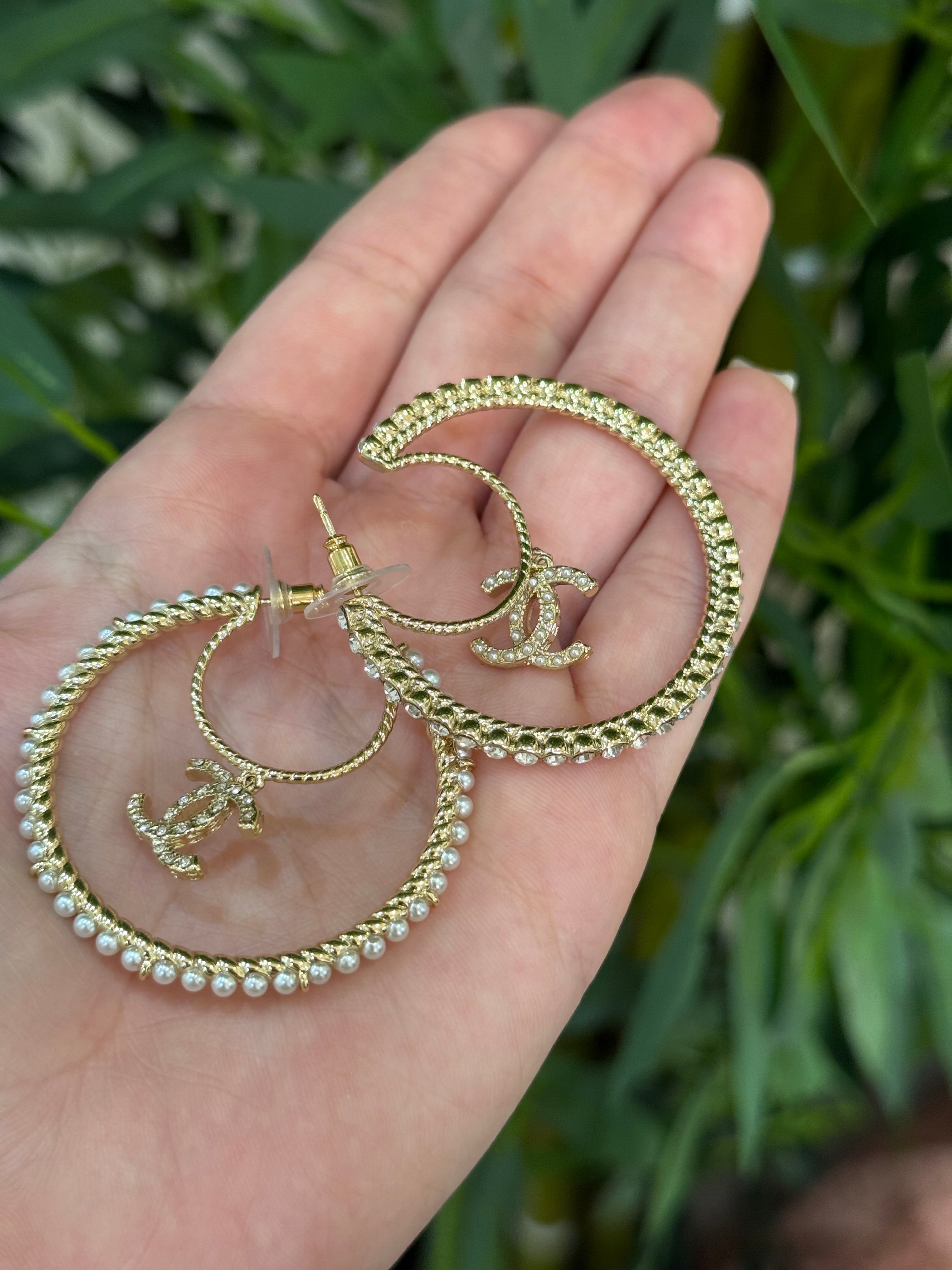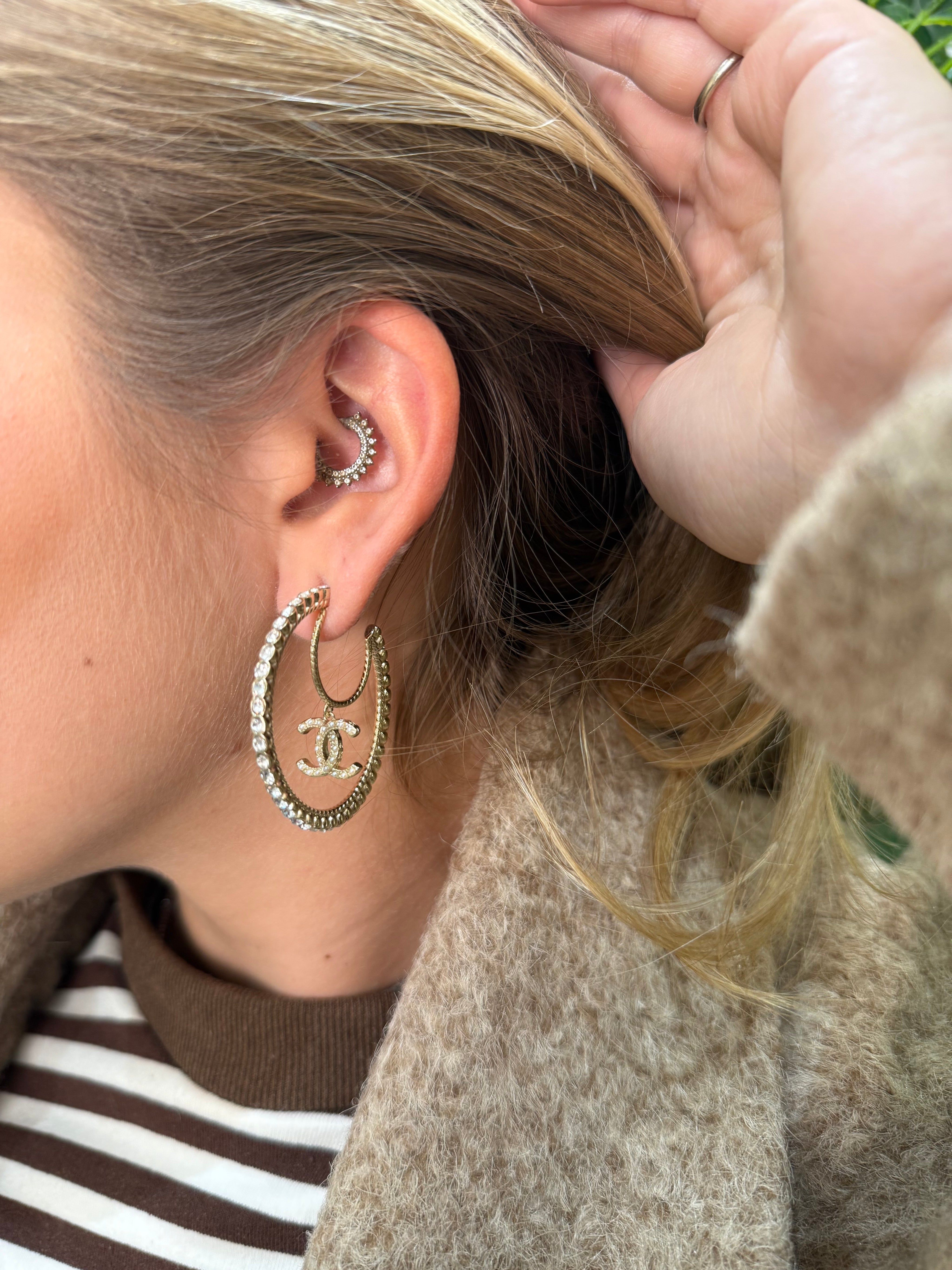Orecchini Chanel a cerchio con brillantini, luminosi ed eleganti, perfetti per aggiungere un tocco di classe a qualsiasi look.