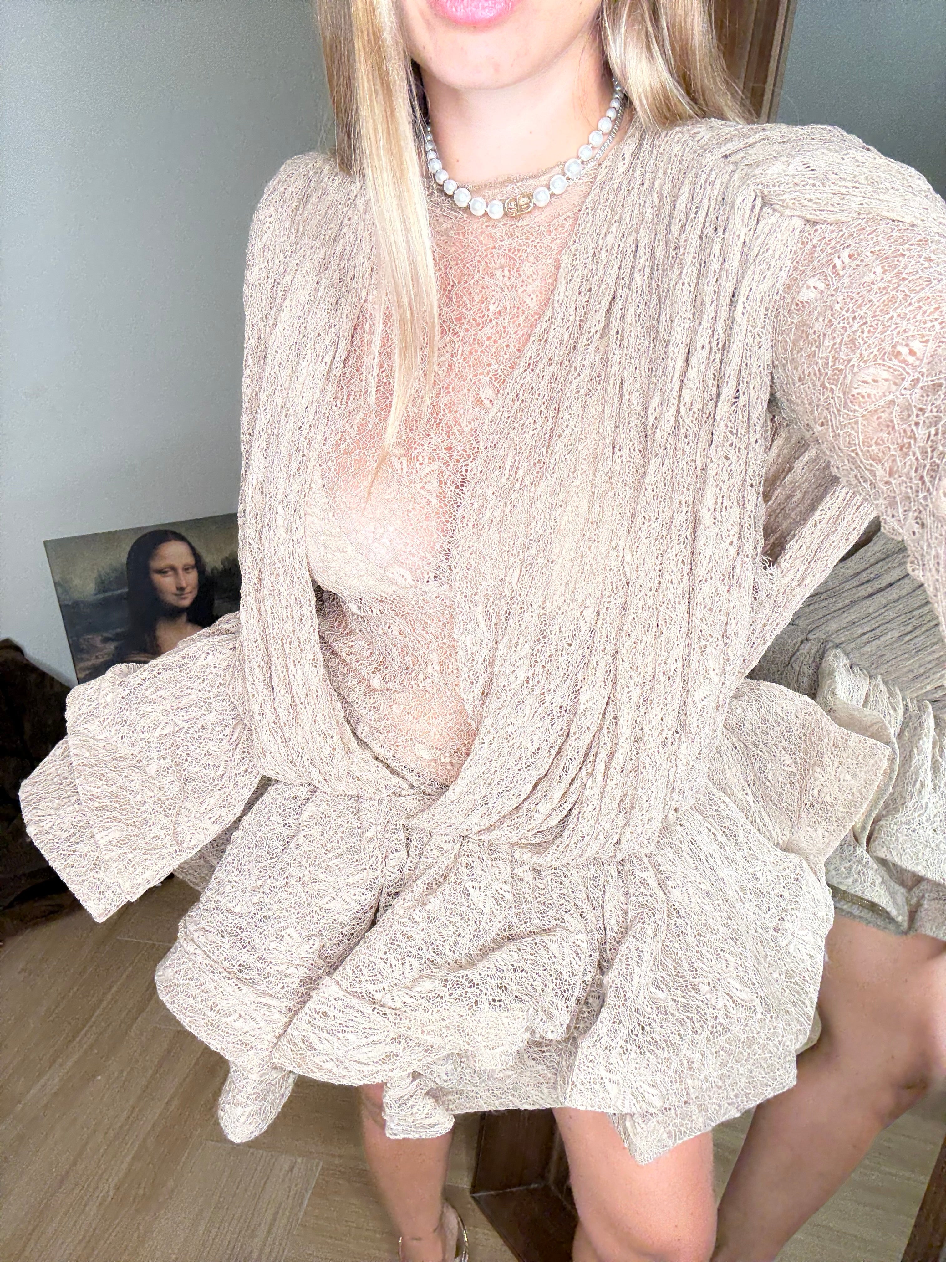Un capolavoro di alta moda che unisce eleganza, struttura e femminilità. La maglia a maniche lunghe funge da base raffinata, mentre l’abito superiore in pizzo beige crea un effetto trasversale sorprendente. La gonna voilant rigida dona volume e movimento, trasformando ogni passo in una piccola scenografia. Perfetto per occasioni speciali o eventi in cui distinguersi con stile e raffinatezza senza tempo, questo abito esprime lusso e attenzione al dettaglio in ogni fibra