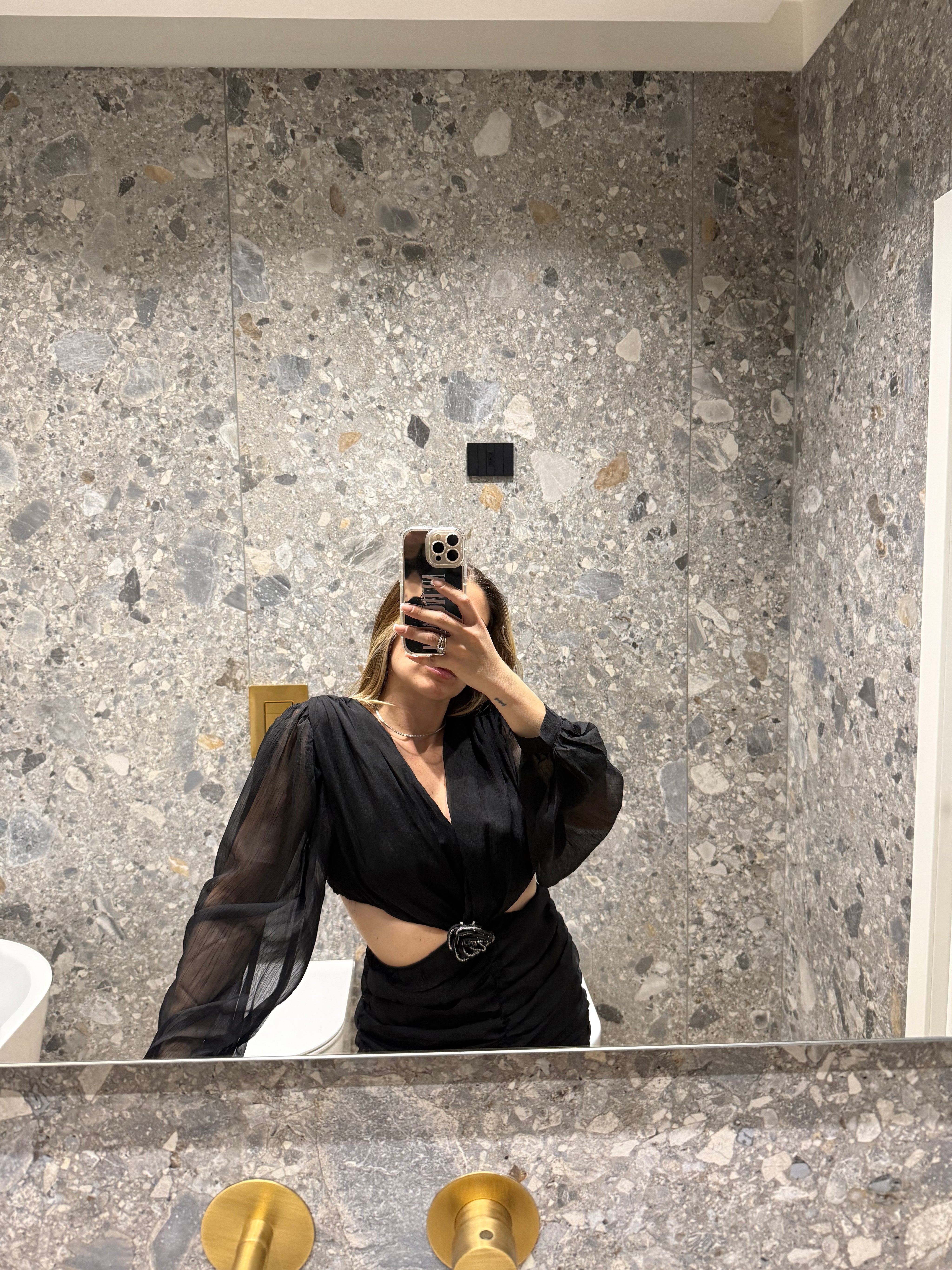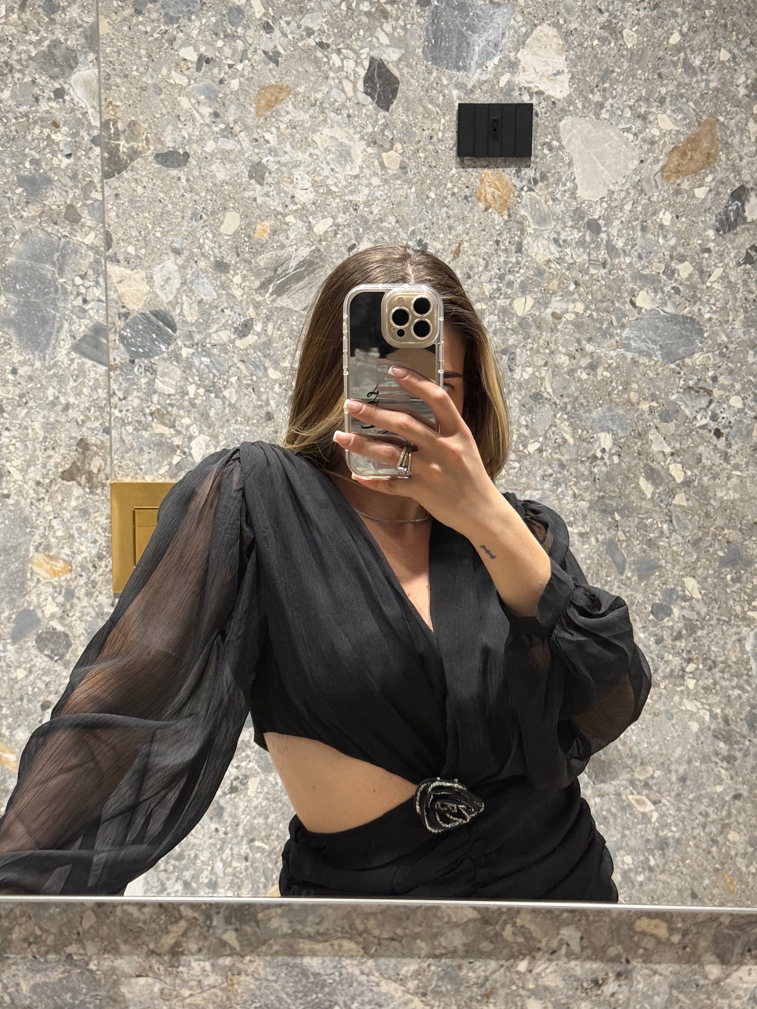 Abito in chiffon arricciato manica lunga con dettaglio cut out e spilla rosa removibile