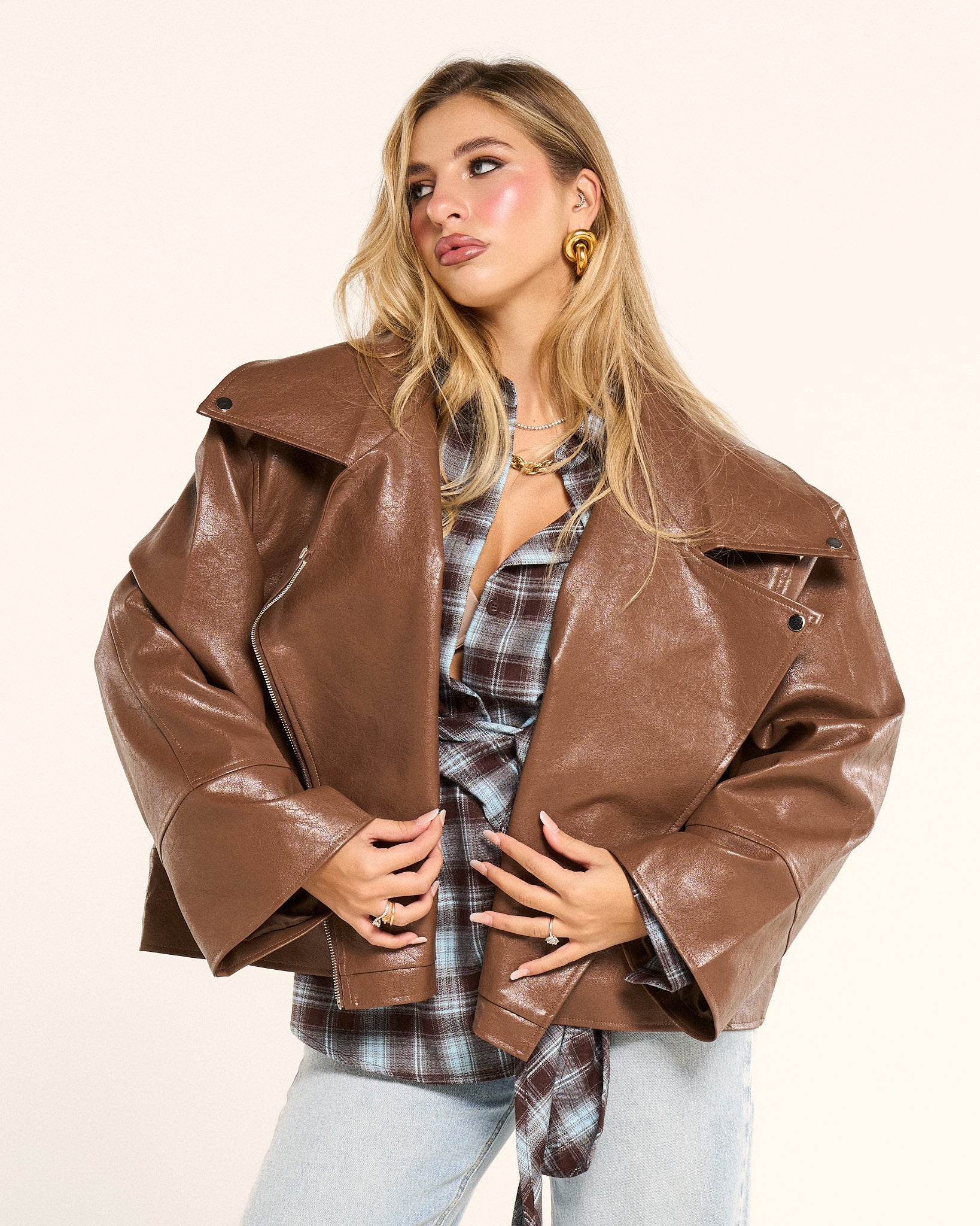 Giacca oversize in pelle semi lucida, dal carattere deciso e contemporaneo. Un capo statement perfetto per completare outfit urbani e di tendenza.
