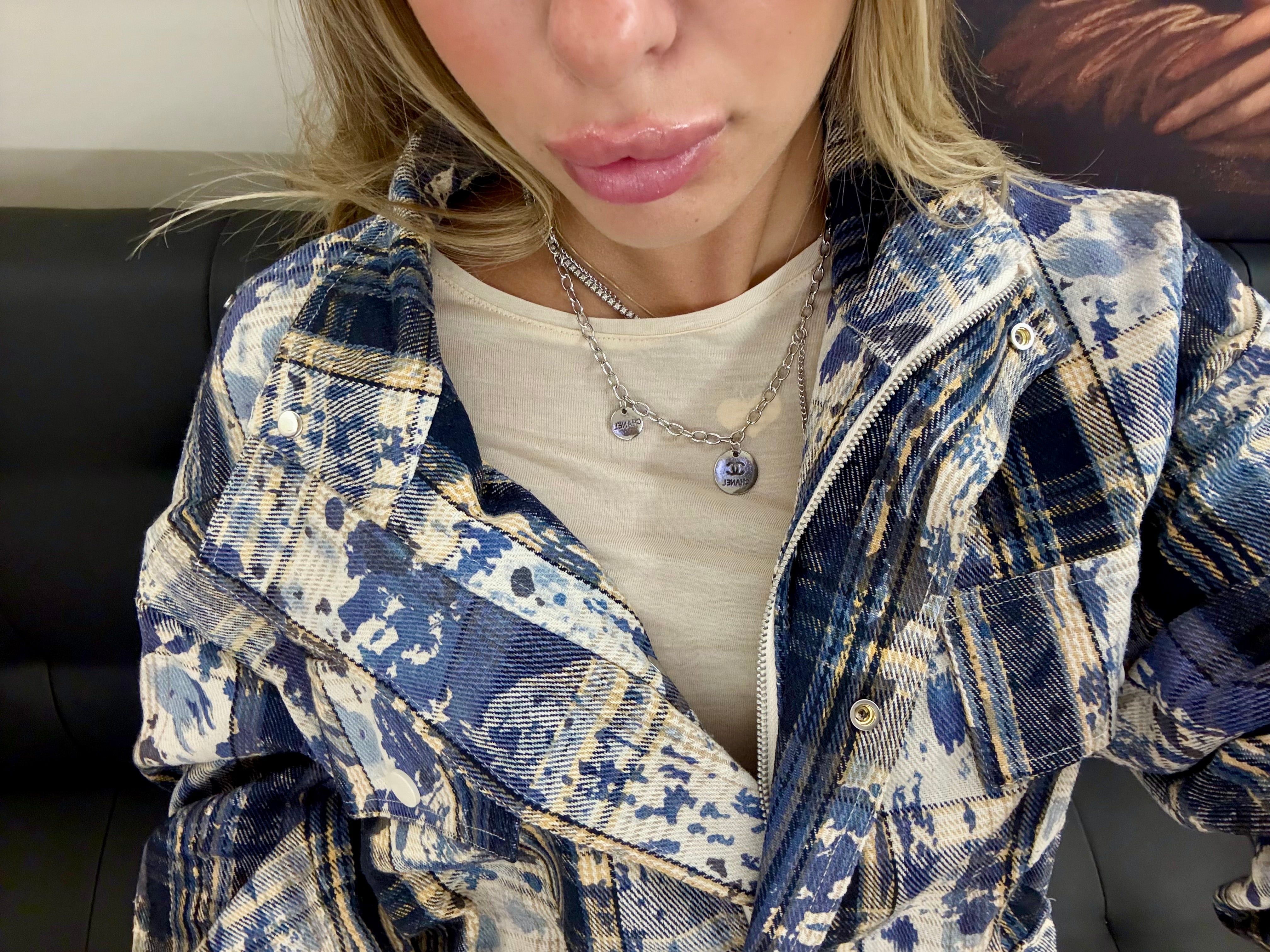 Giacca oversize in denim fantasia quadri con effetto macchie. Versatile: indossala come giacca o come scamiciato/vestito. Un capo unico per look decisi e moderni