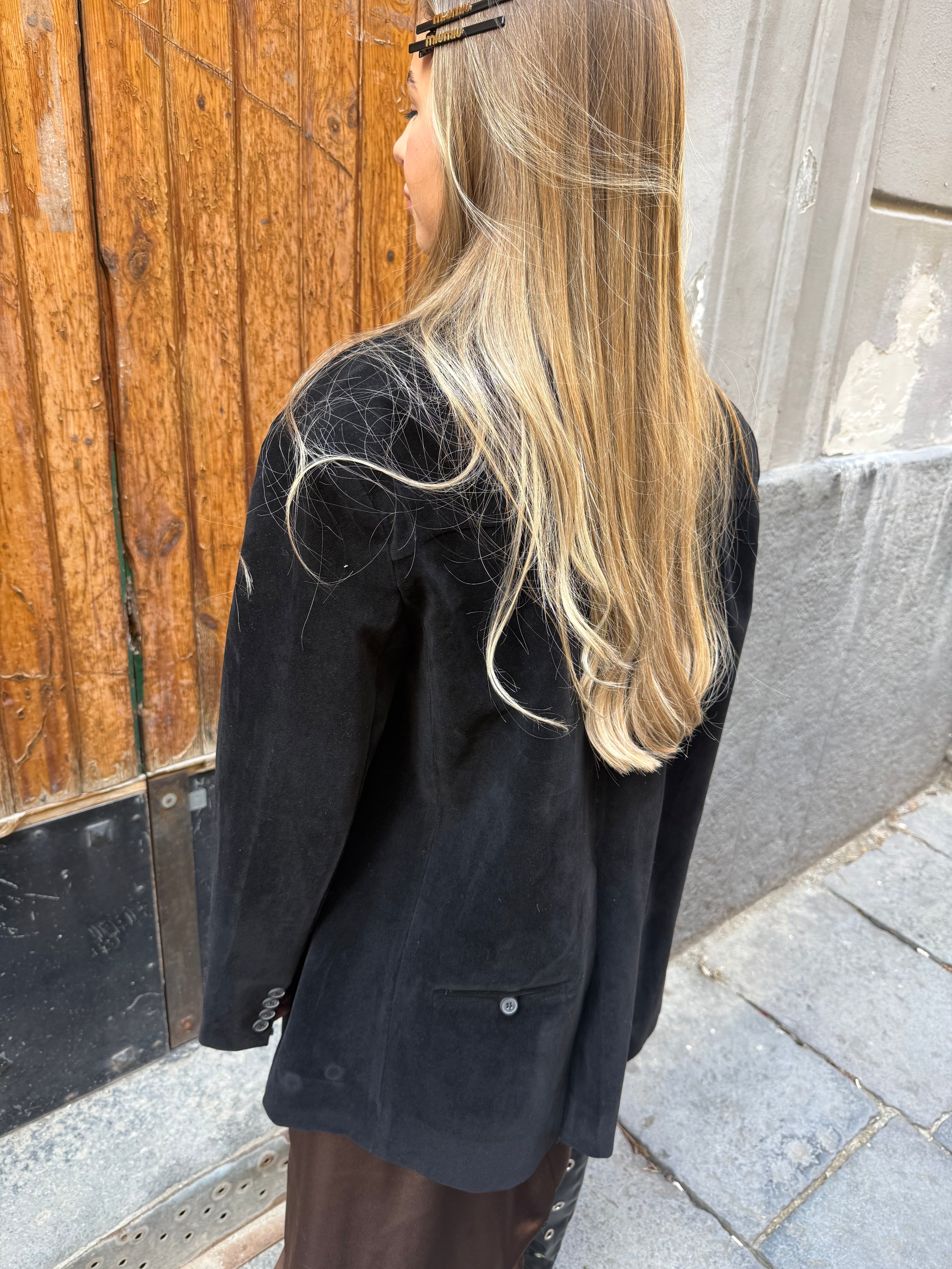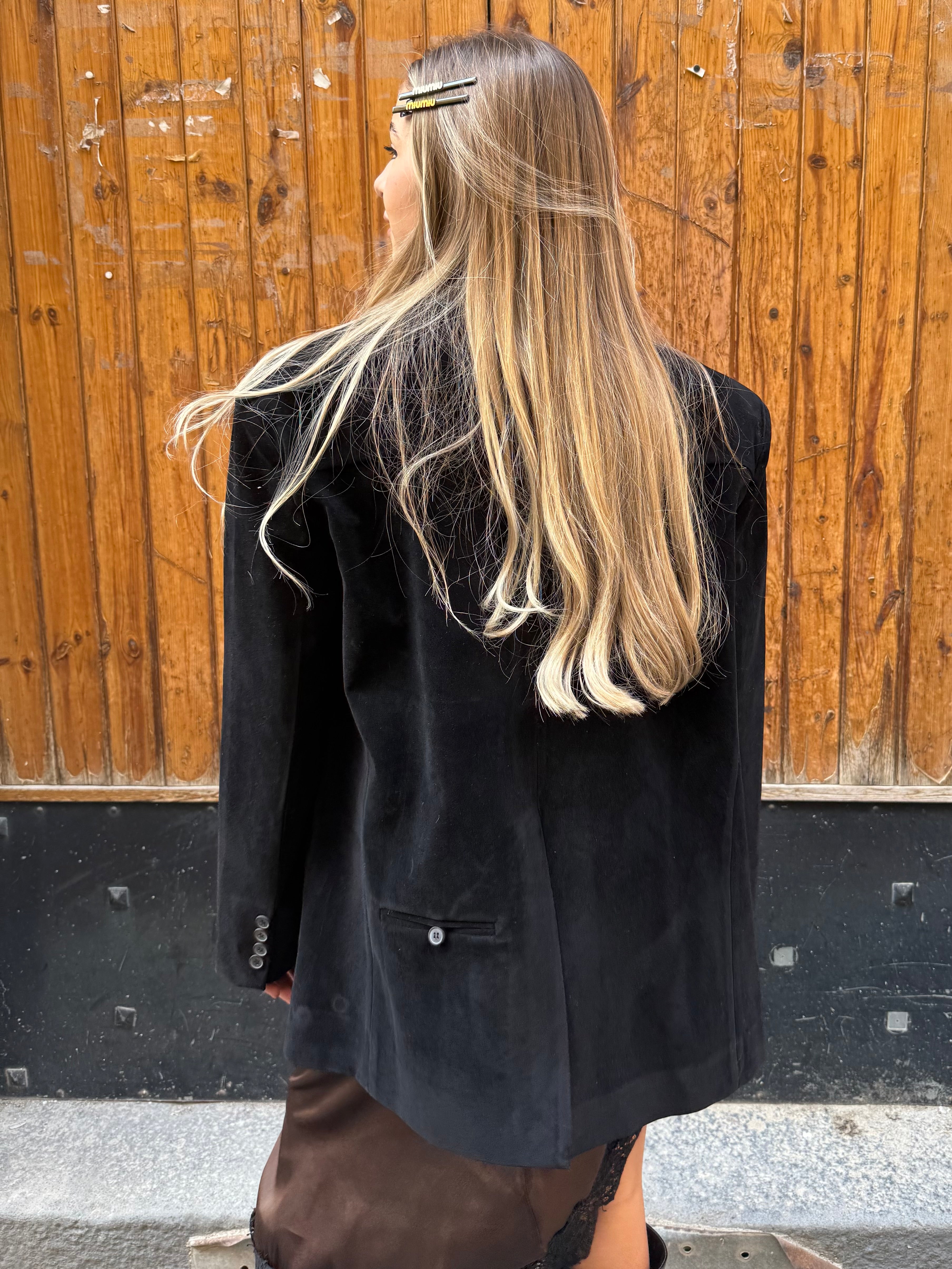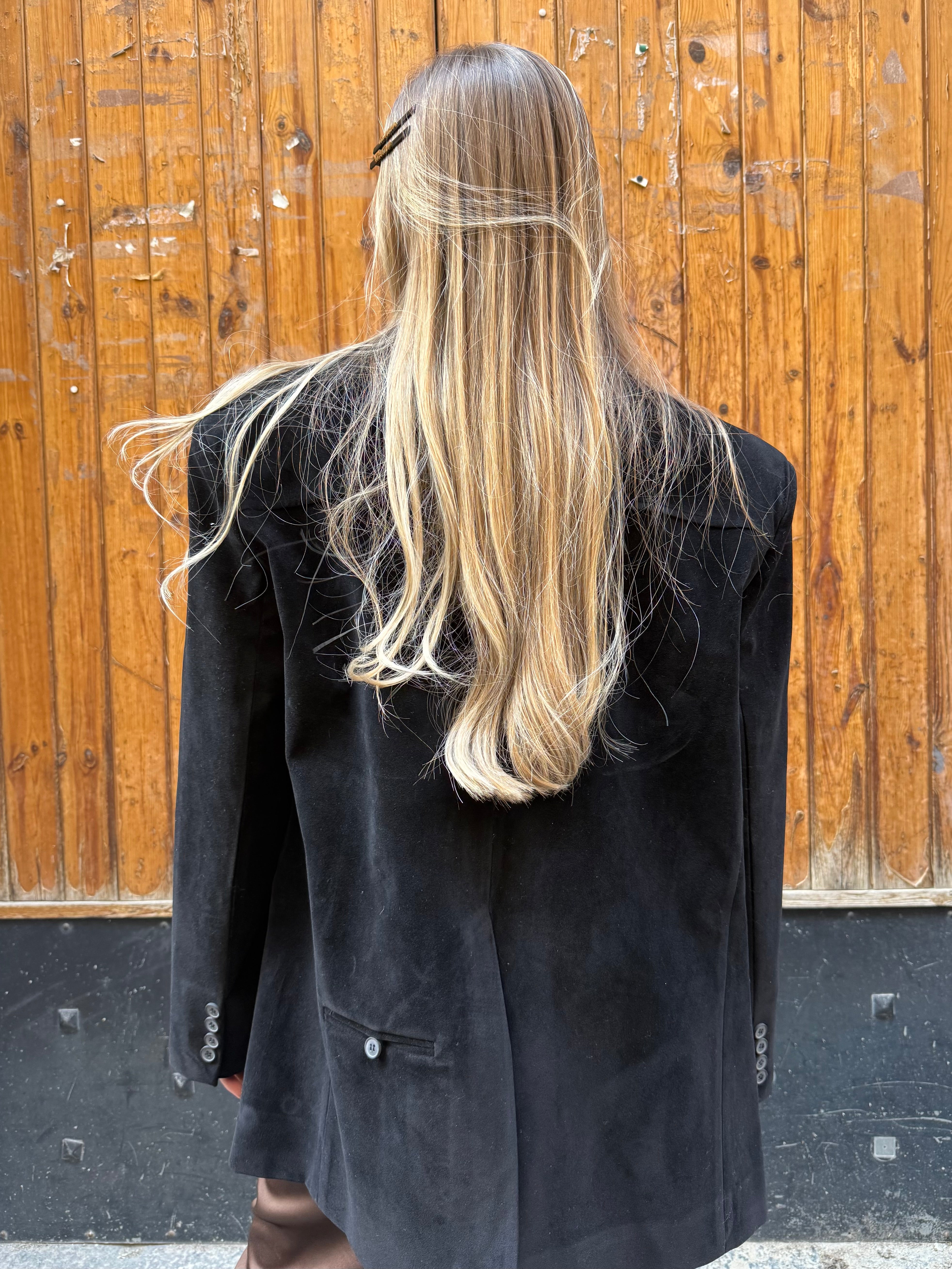 giacca Lumina di velluto nero che unisce morbidezza e stile in un capo dal carattere deciso e raffinato. Il tessuto pregiato, dalla texture vellutata e lucente, scivola sulla figura creando una silhouette fluida e naturale.