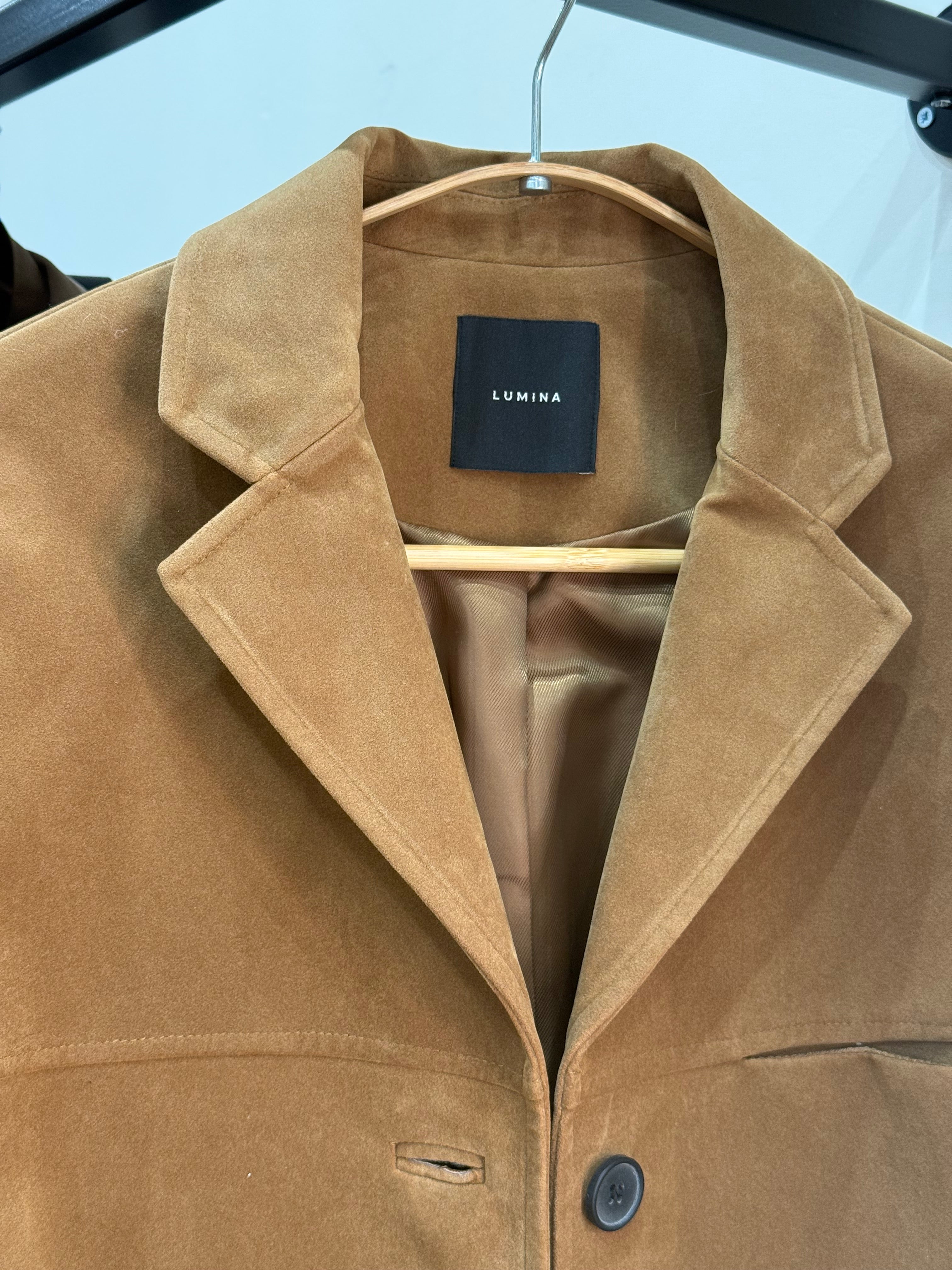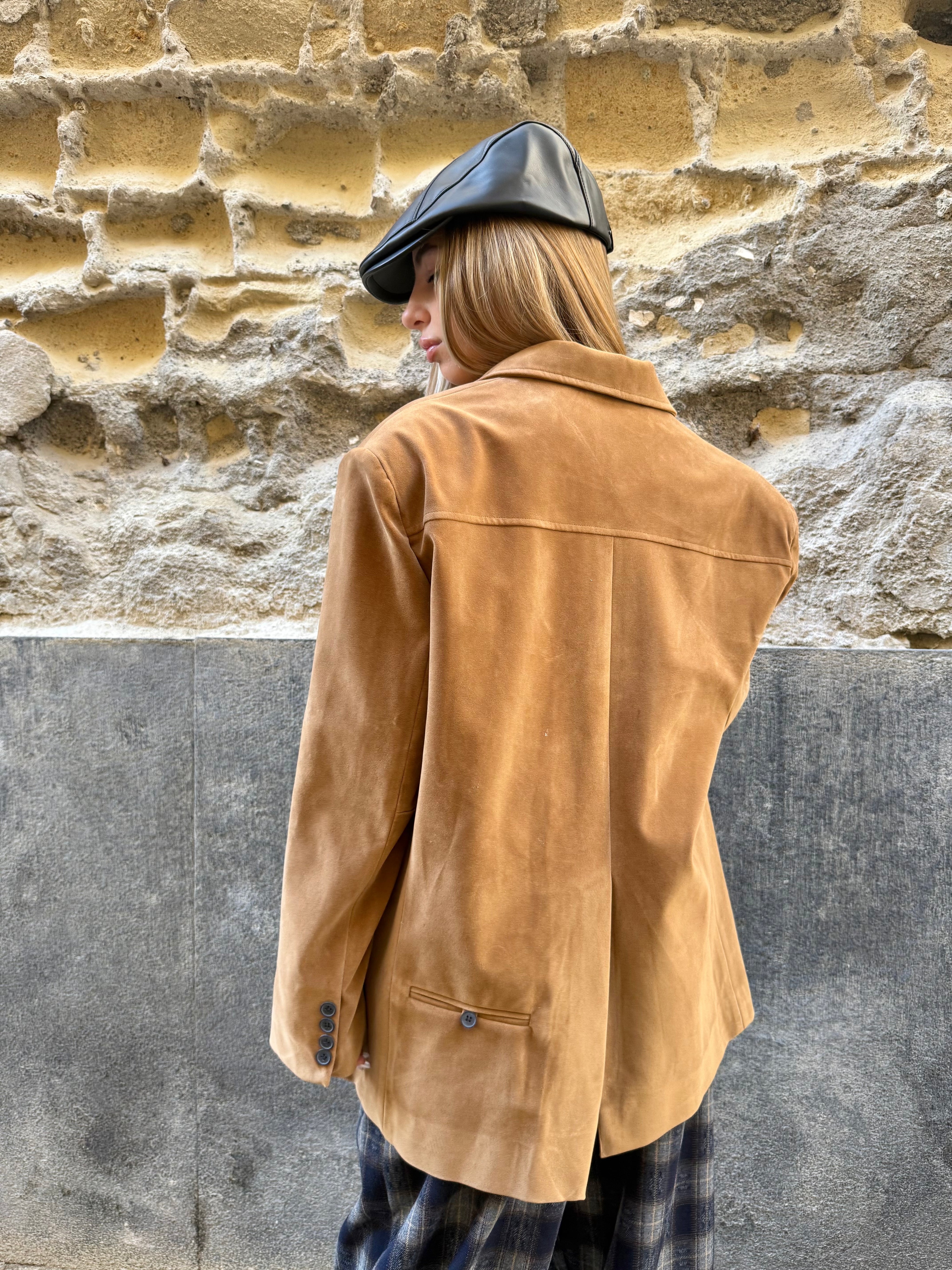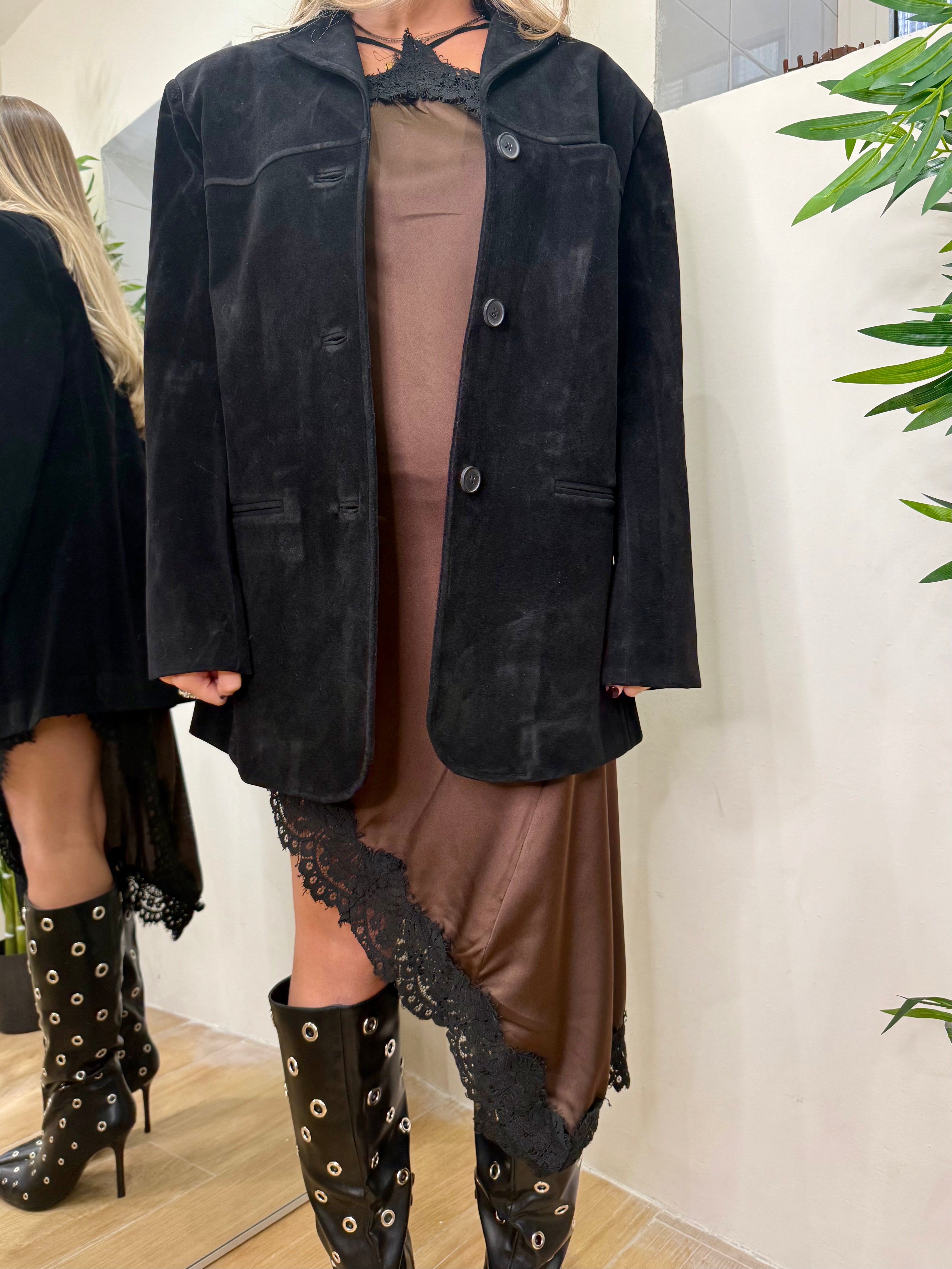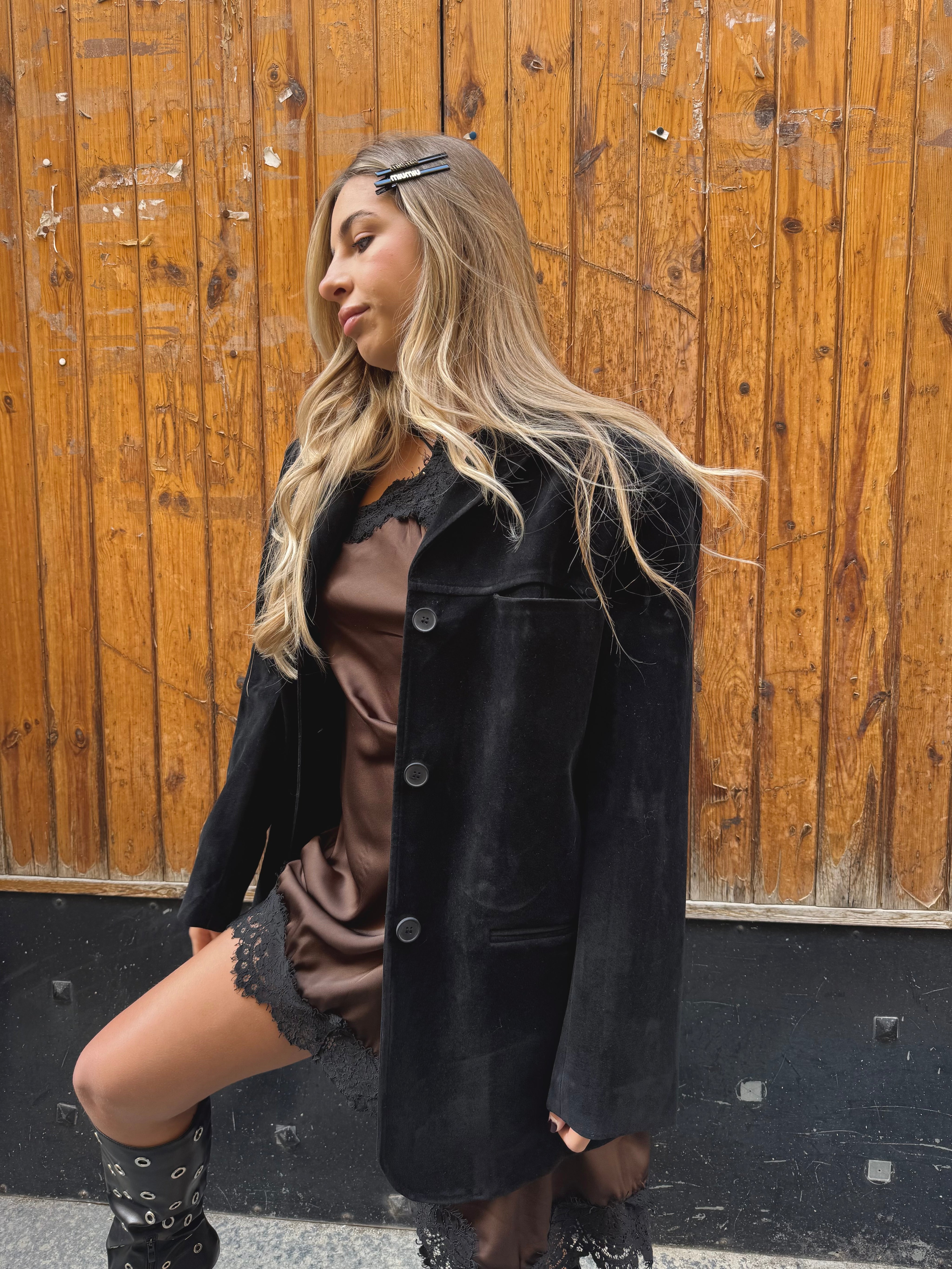 giacca Lumina di velluto nero che unisce morbidezza e stile in un capo dal carattere deciso e raffinato. Il tessuto pregiato, dalla texture vellutata e lucente, scivola sulla figura creando una silhouette fluida e naturale.