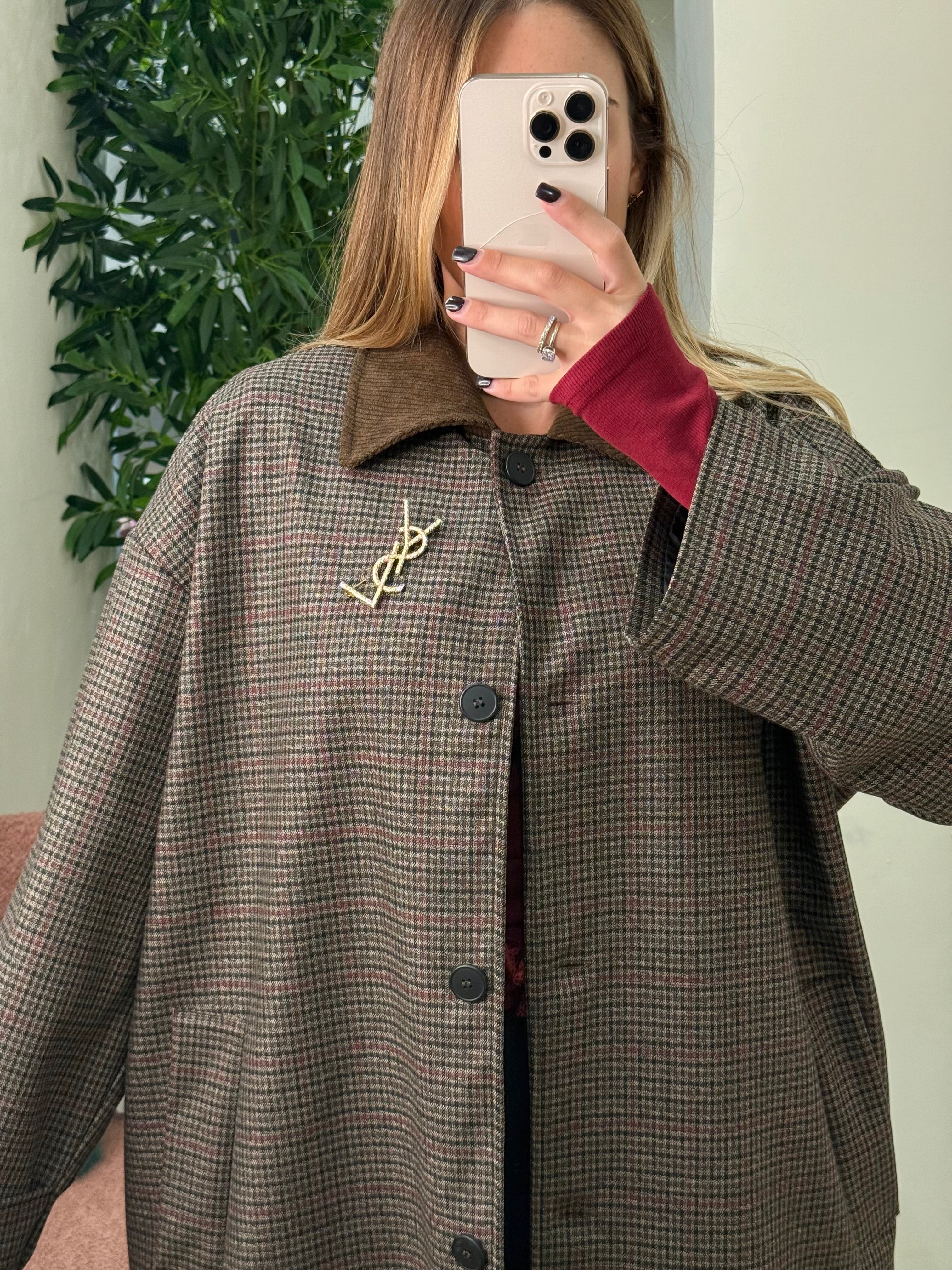 La giacca "Velvet Check Over" è un capo dal carattere deciso e dallo stile contemporaneo. Il tessuto a quadretti scurisu un caldo fondo cioccolato dona un tocco classico, mentre la silhouette molto lunga e over ne esalta la comodità e il fascino moderno.